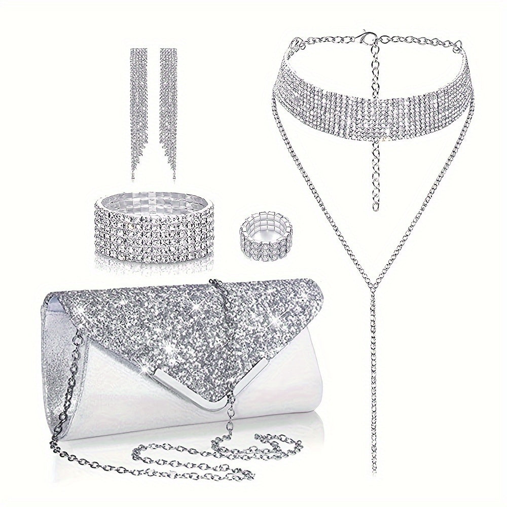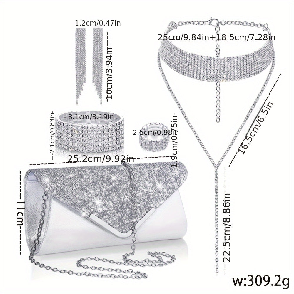 Ushbu hashamatli zargarlik to'plami bir juft sirg'a, bir bilaguzuk, bir uzuk, bir marjon va bir sumkadan iborat. Har bir buyum nafis tarzda kumush qoplamasi bilan bezatilgan va porloq rhinestone'lar bilan bezatilgan, haqiqatan ham ajoyib ko'rinish uchun.