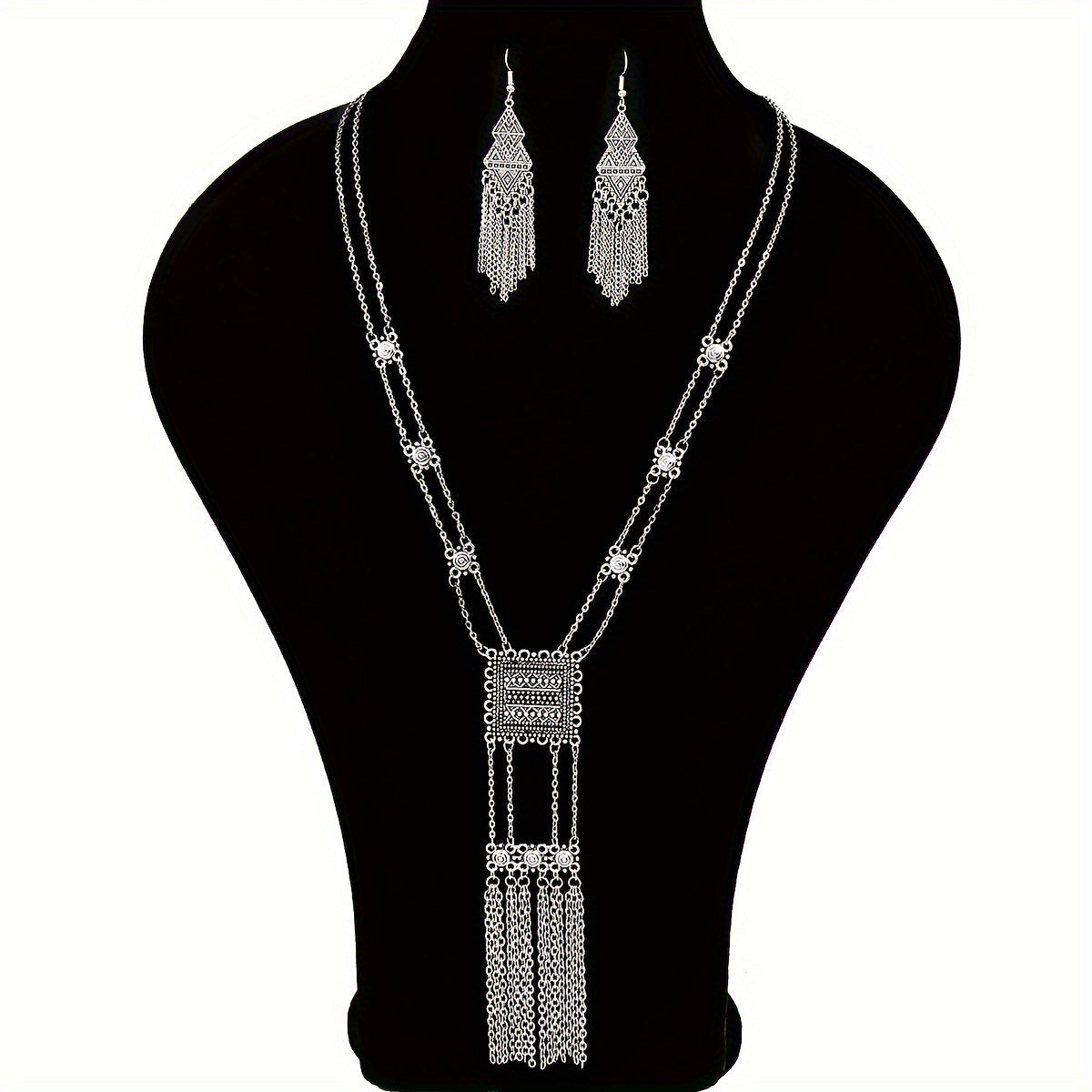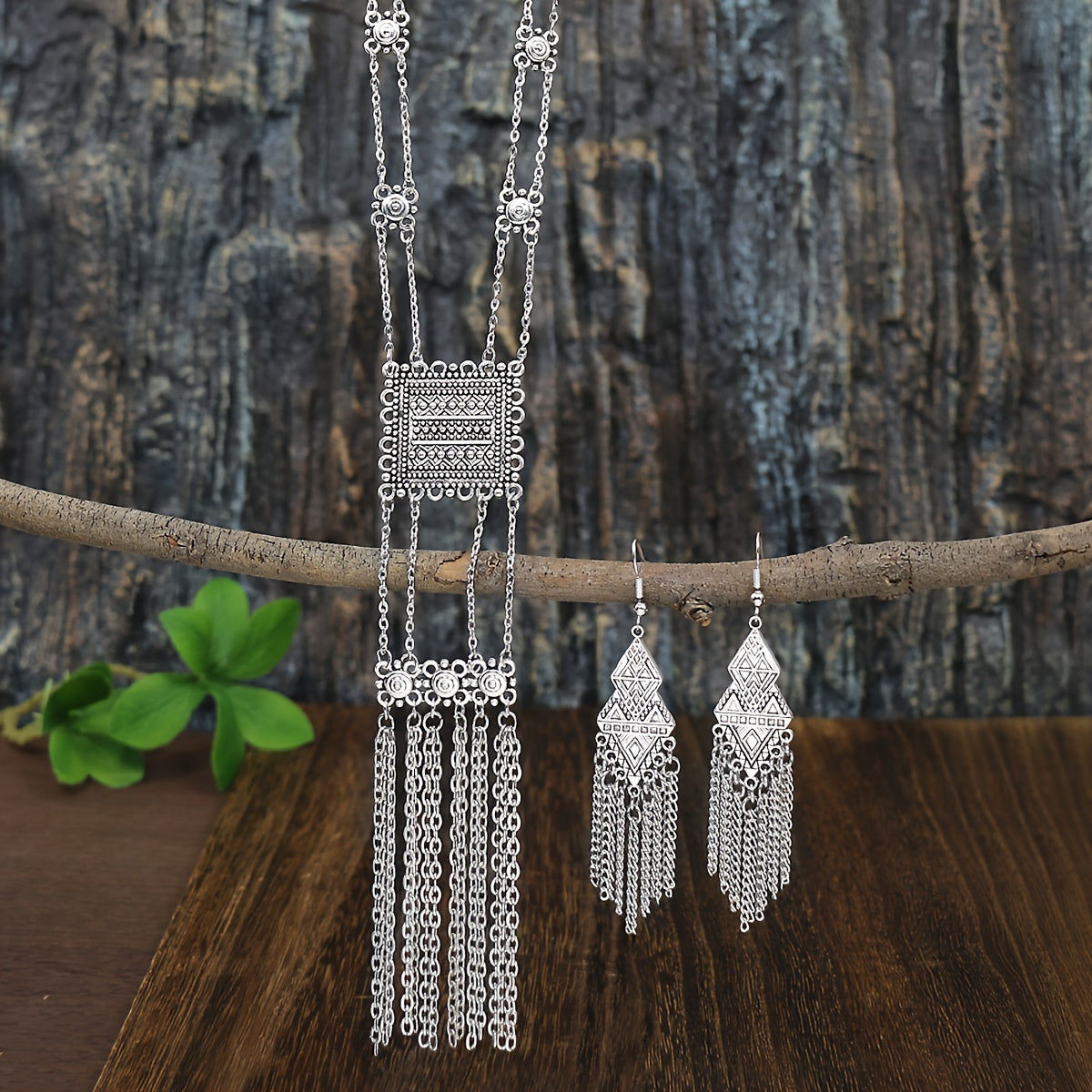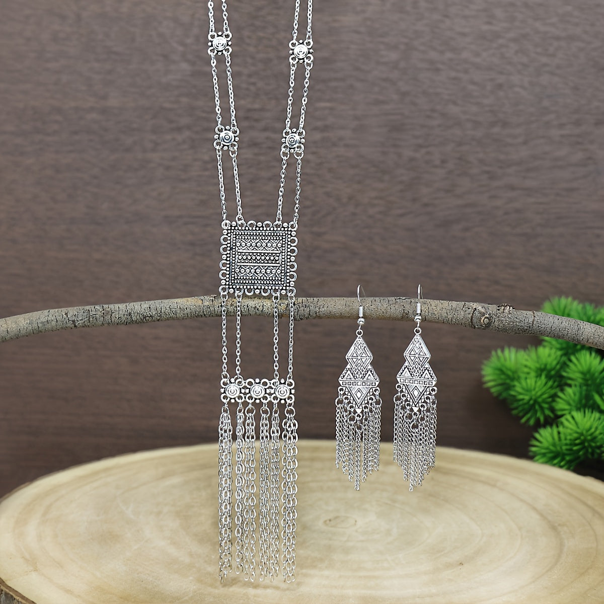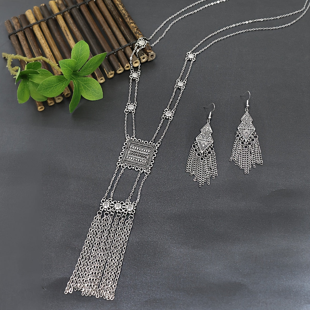 Ayollar etnik uslubdagi zargarlik to'plami, geometrik taqinchoq va tassel sirg'alar bilan