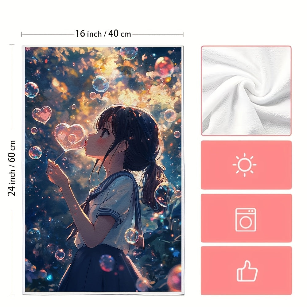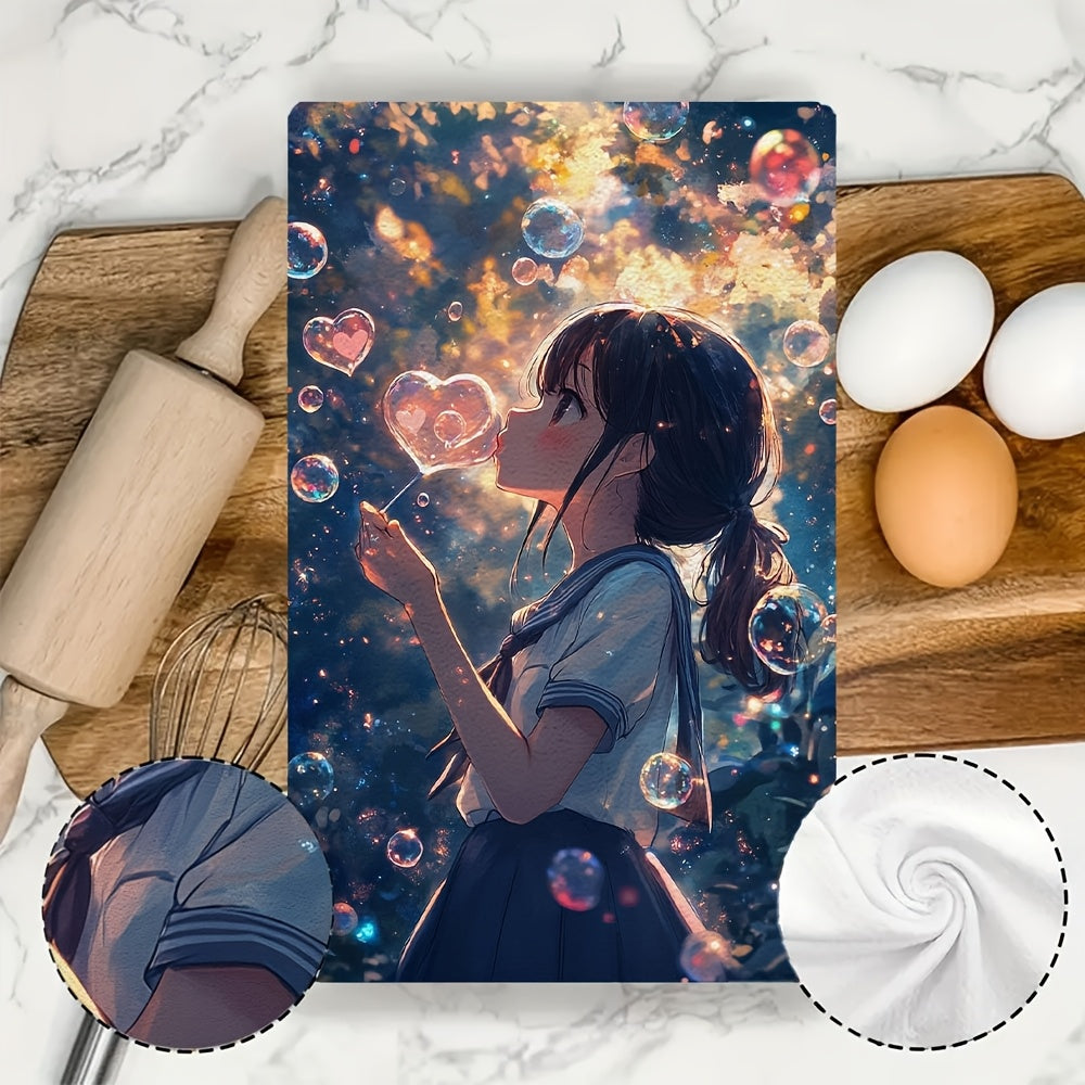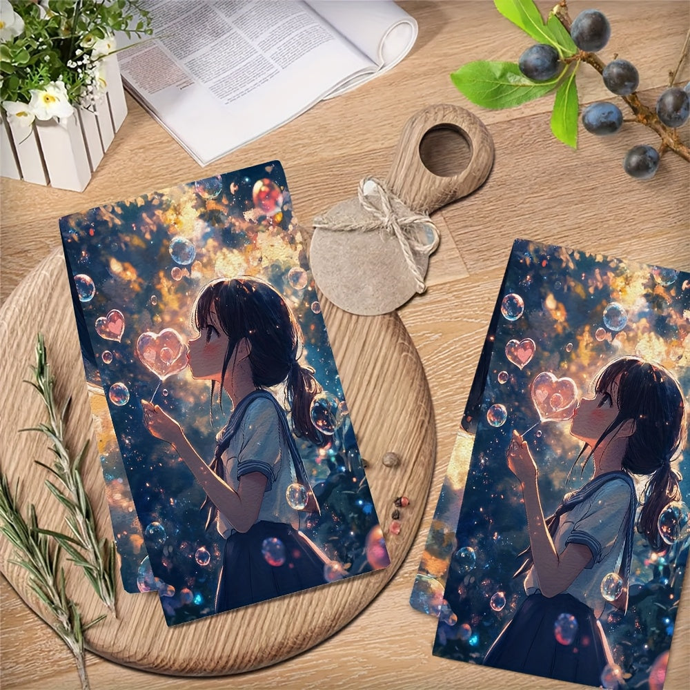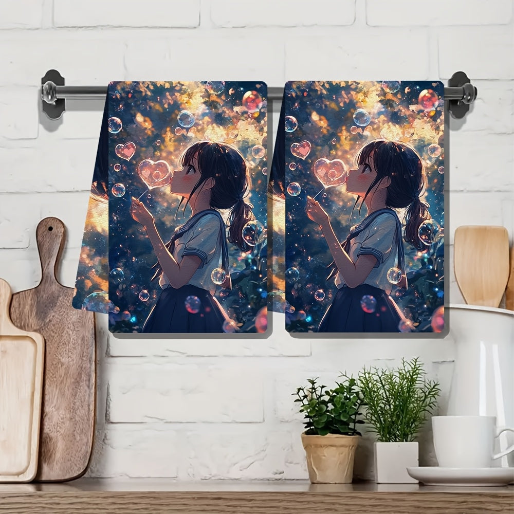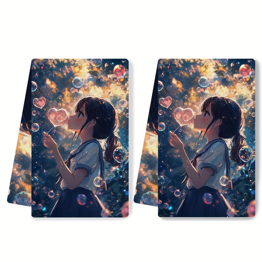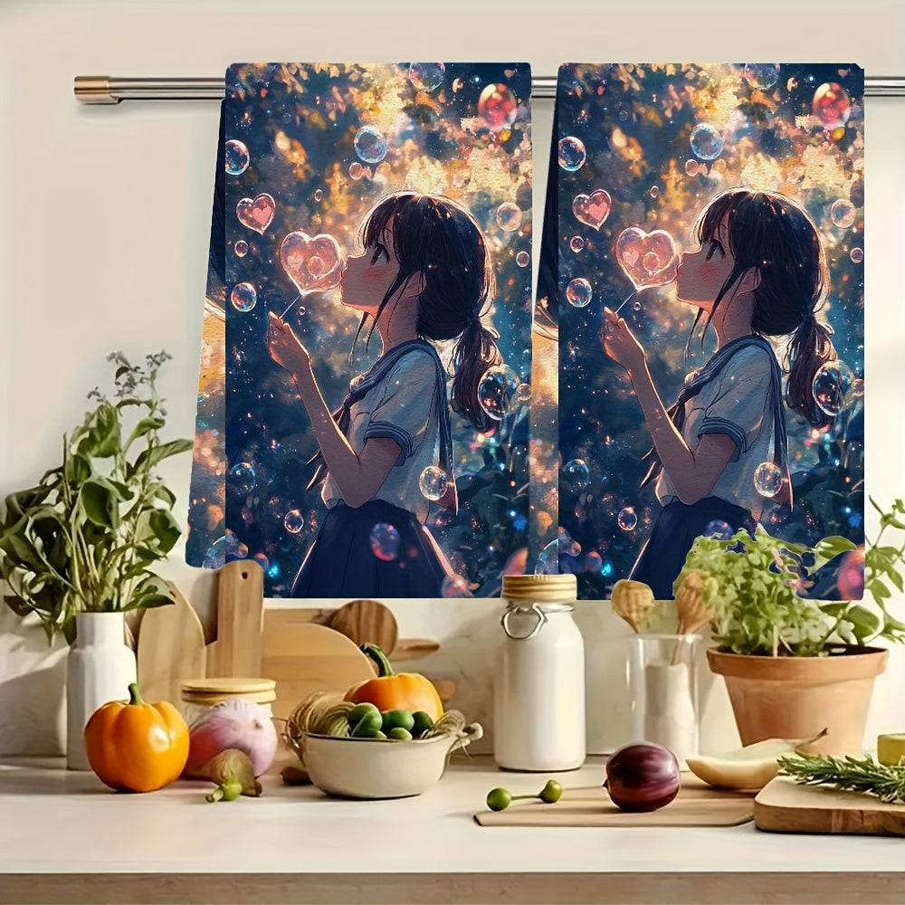 Anime qiz balonli dizayni bilan 2 ta yumshoq oshxona sochiqlari to'plami, suv o'zlashtiruvchi idish sochiqlari