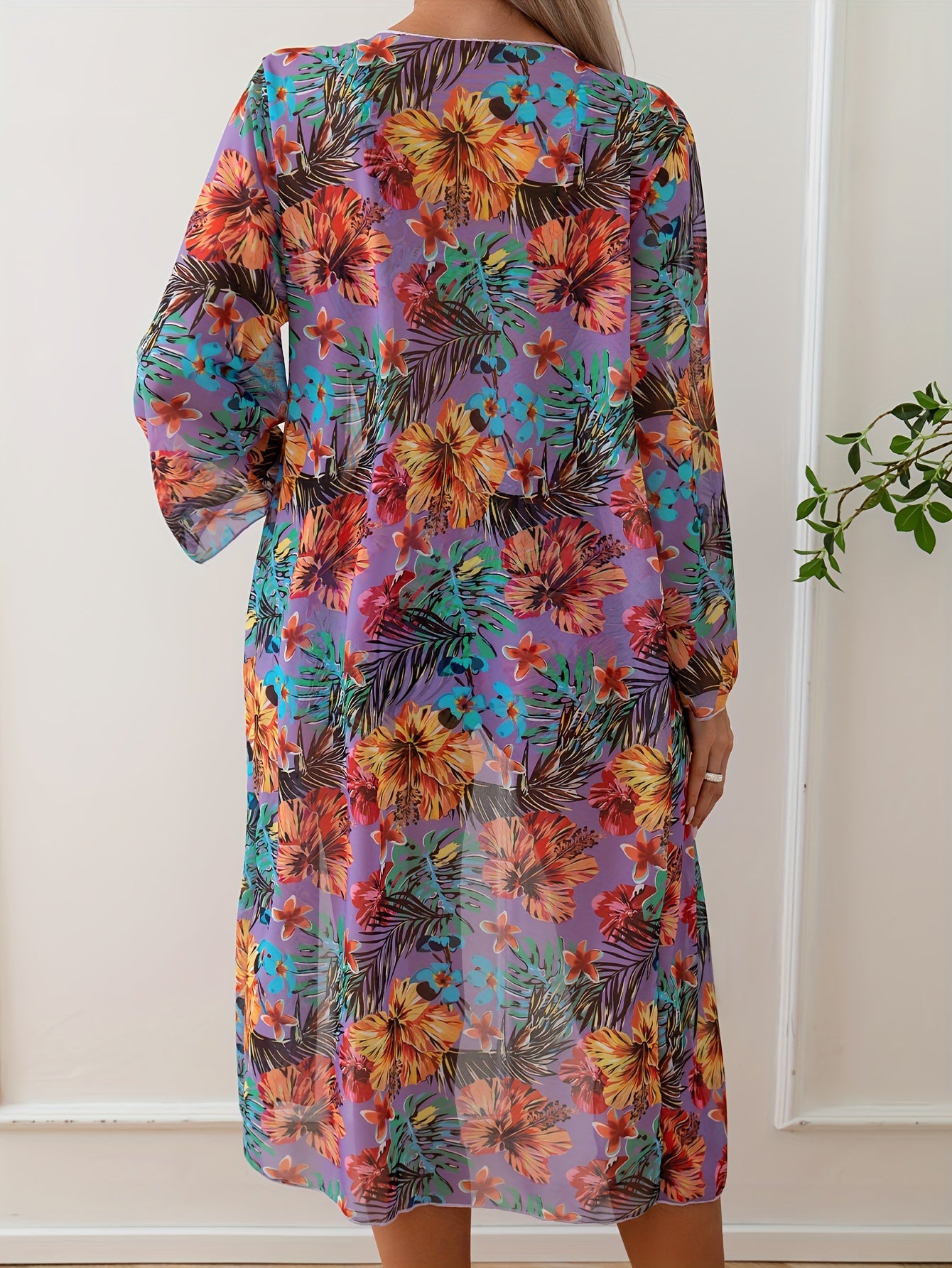 Uch qismli tropik gullar printi bilan bikini to'plami, yopishqoq, tortishqoq old qismi bo'lgan crop top va yuqori bel boxershorts - yozgi plyaj kiyimlari uchun mukammal.