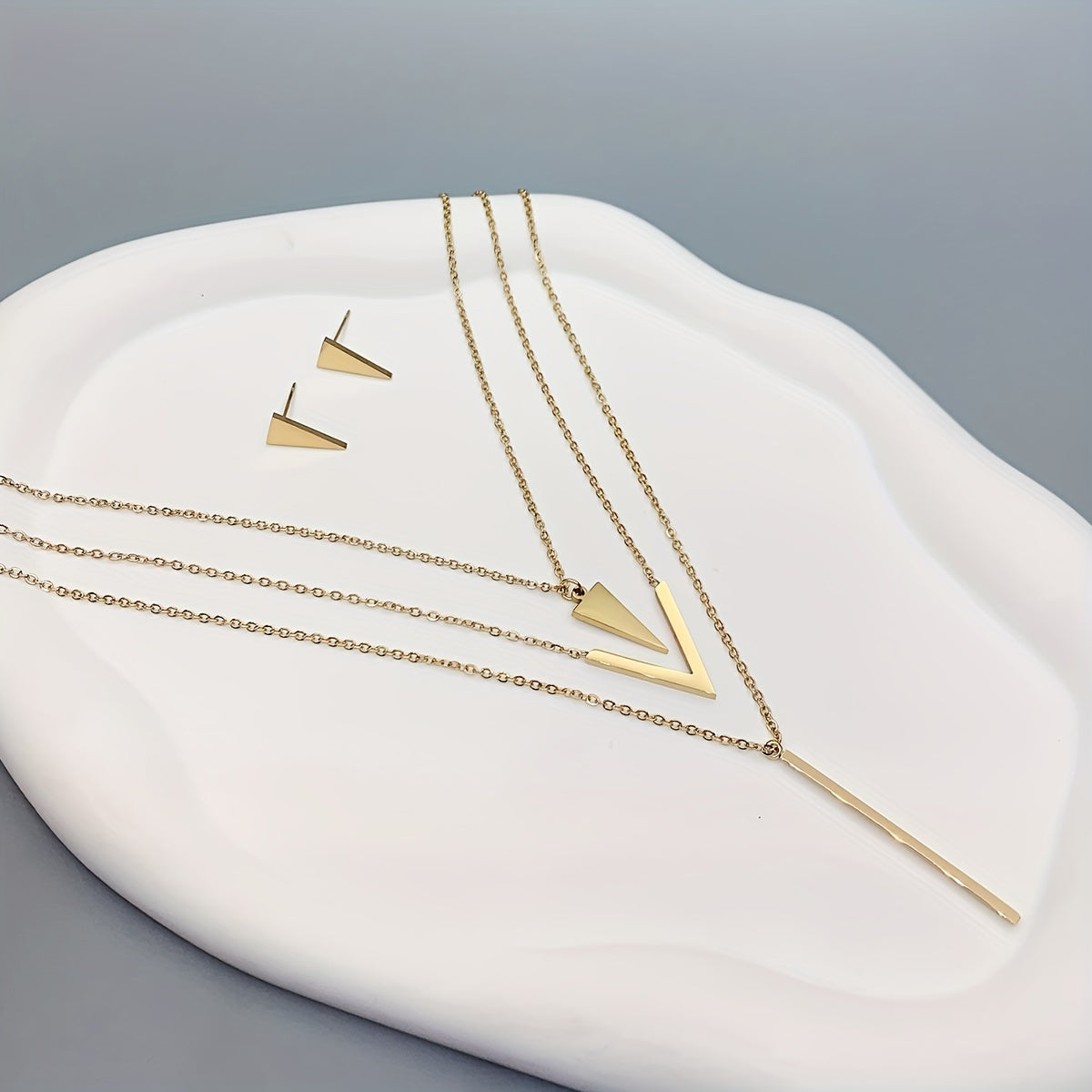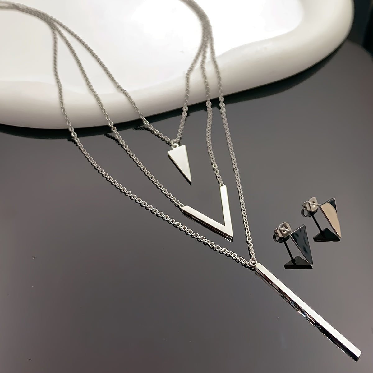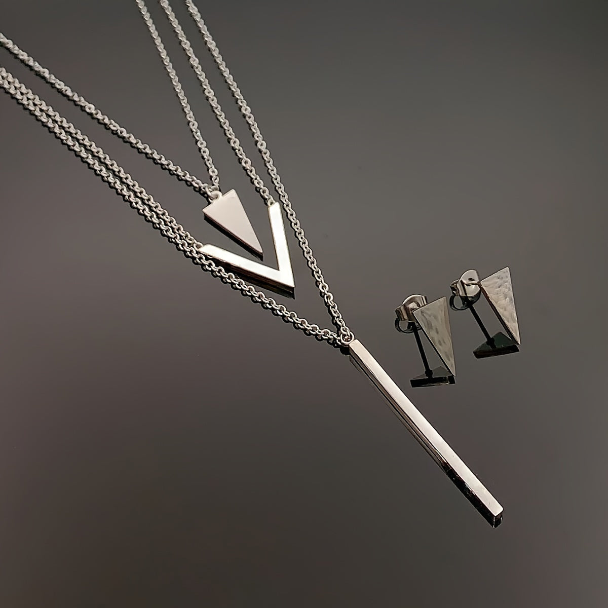 Uch dona zanglamas po'latdan yasalgan uzun tasma V-shaklidagi geometrik pendant, ko'p qatlamli marjon va uchburchakli sirg'alar bilan. Tug'ilgan kun yoki bayram sovg'asi, kiyim bezaklari yoki partiya aksessuarlar sifatida mukammal.