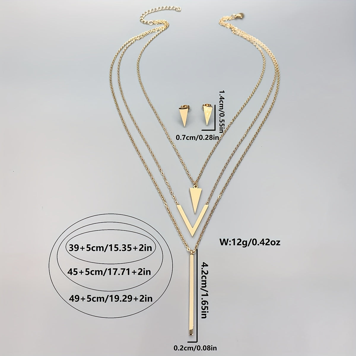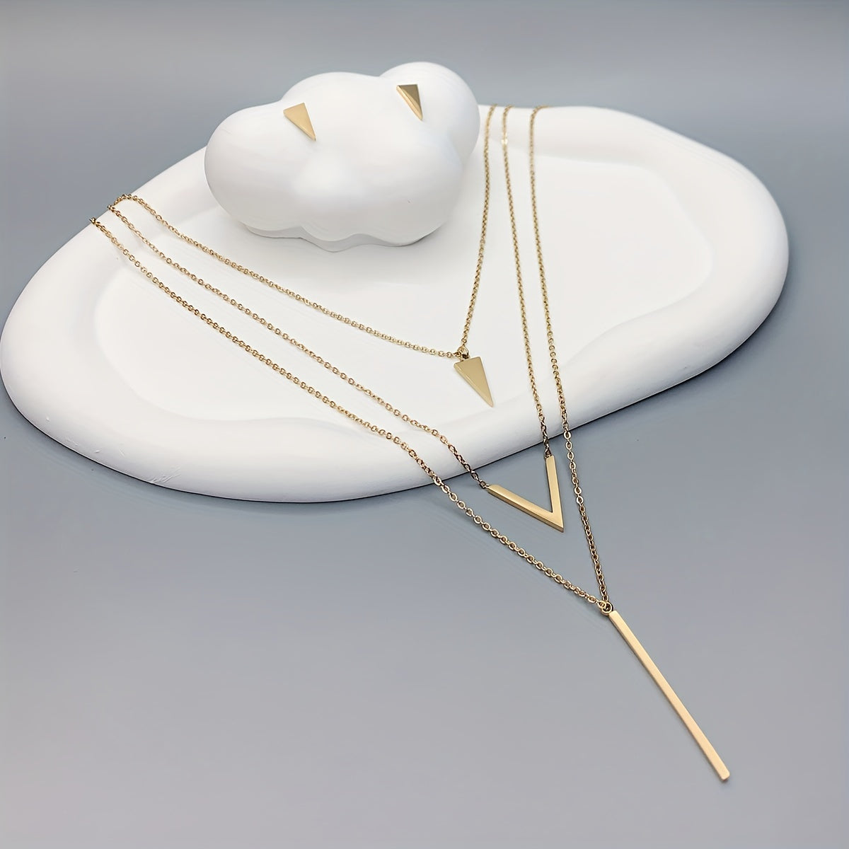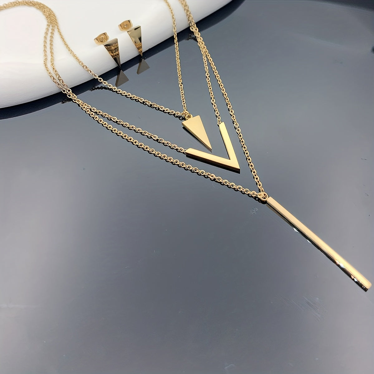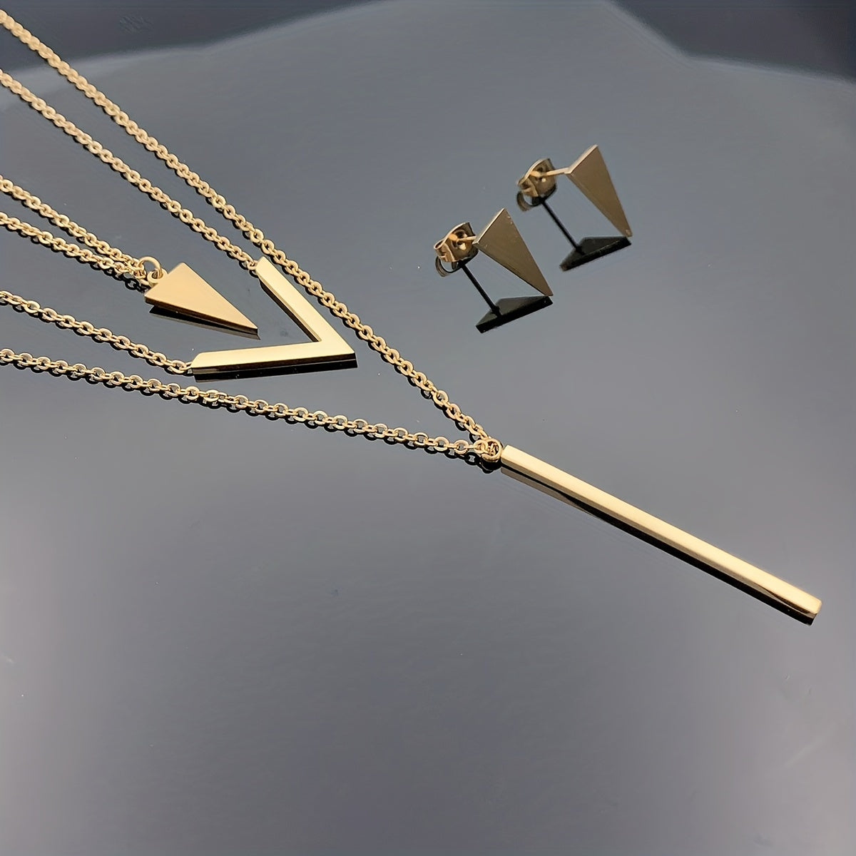 Uch dona zanglamas po'latdan yasalgan uzun tasma V-shaklidagi geometrik pendant, ko'p qatlamli marjon va uchburchakli sirg'alar bilan. Tug'ilgan kun yoki bayram sovg'asi, kiyim bezaklari yoki partiya aksessuarlar sifatida mukammal.