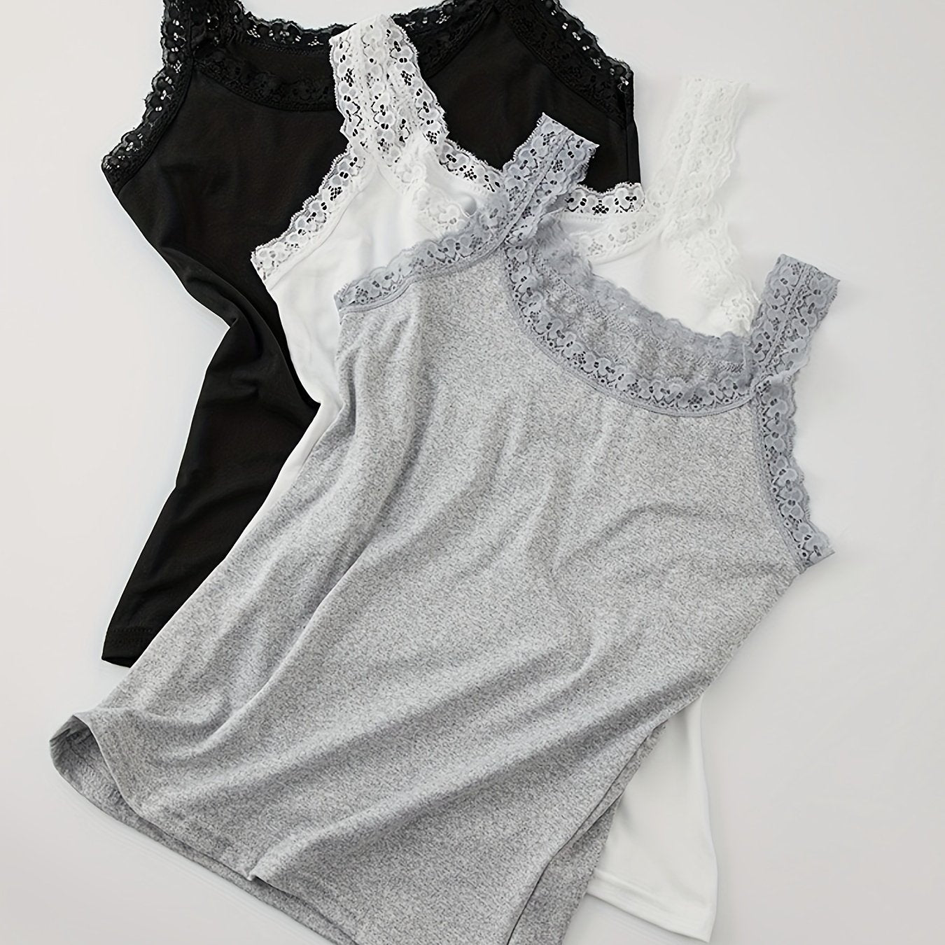 Uchta mustahkam rangli dantel trimli tank top qora, oq va kulrang. Har mavsum uchun mos doira bo'yin dizayni. Asosiy moslik va ayollar ichki kiyimlari uchun havo o'tkazuvchan.