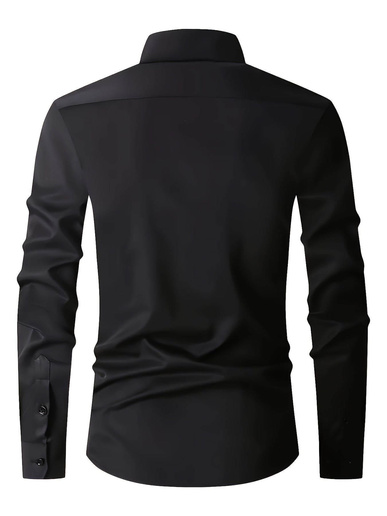 Vaqt o‘tkazmaydigan, nafis, plussiz erkaklar uchun uzun qo‘lqopli ko‘ylak, bir rangda, polyester aralashmasidan tayyorlangan, ofis va norasmiy kiyimlar uchun mos.