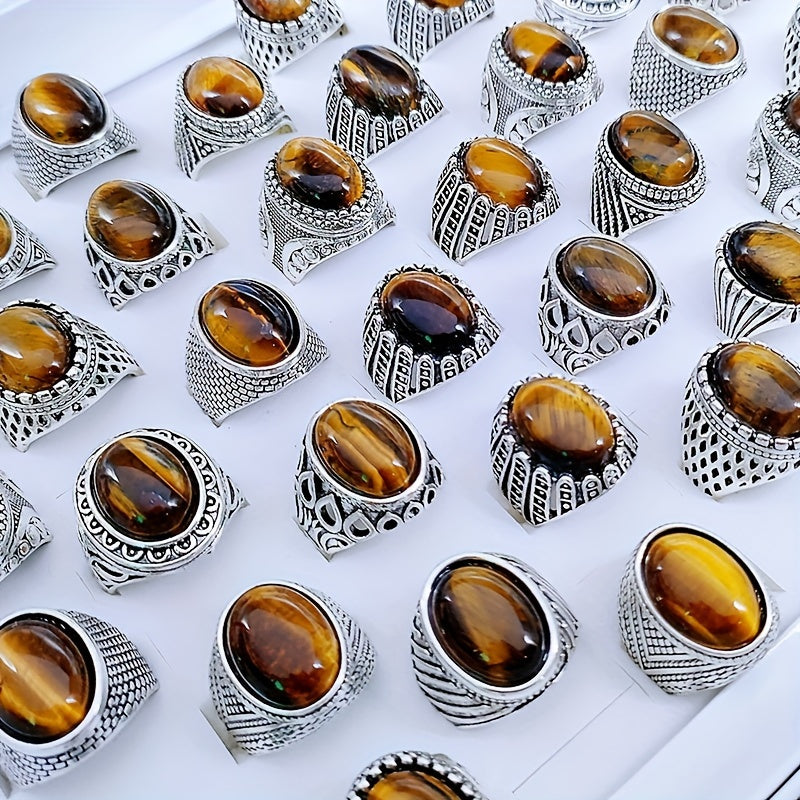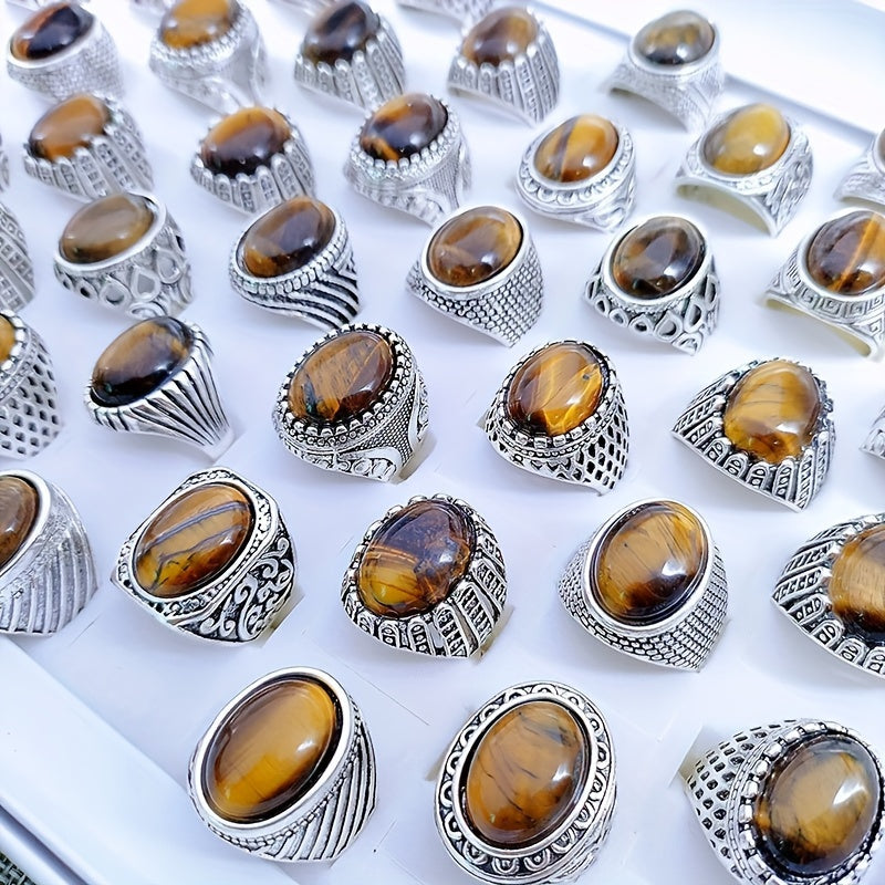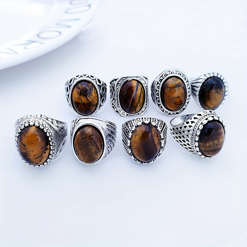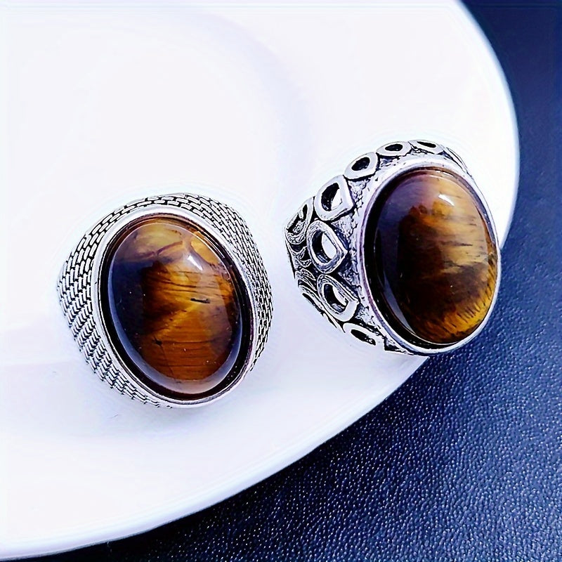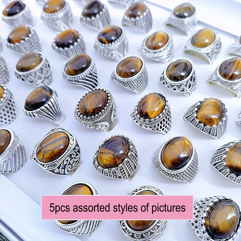 Mijozlar tomonidan eng yaxshi tanlov: 5 ta vintage uslubidagi uzuklar to'plami, tabiiy yo'lbars ko'z toshlari bilan - Sink qotishmasidan tayyorlangan, kundalik va maxsus tadbirlar uchun ideal