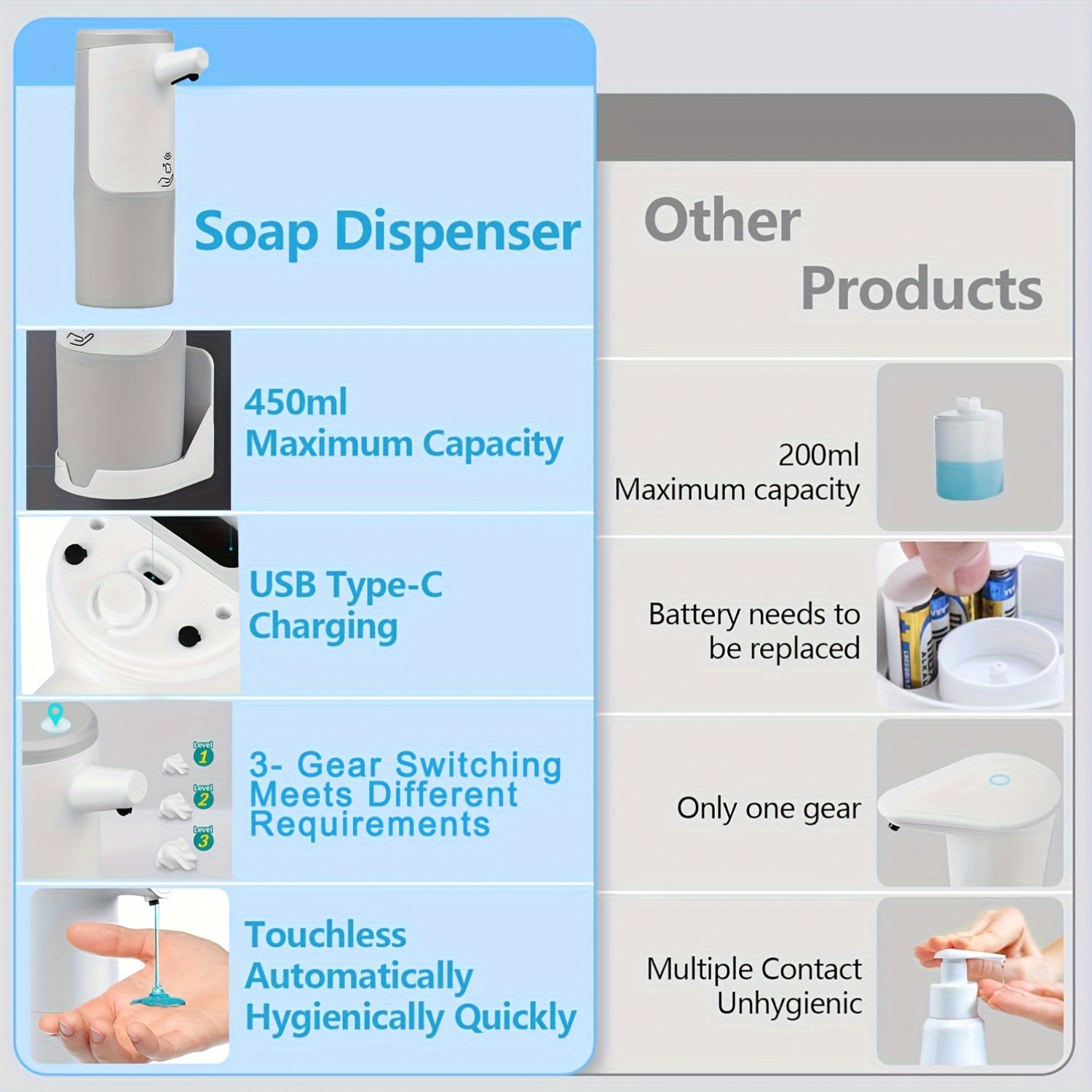 Qo'ymasiz sovun dozatori 450ml USB-C qayta zaryadlanadigan infraqizil sensor uchun hammom oshxona