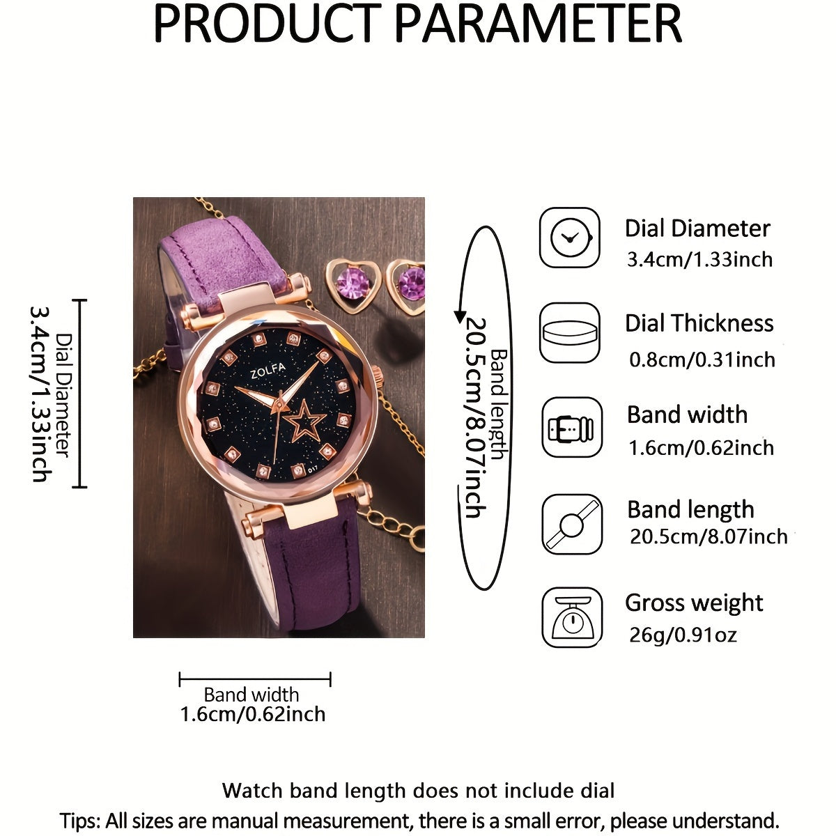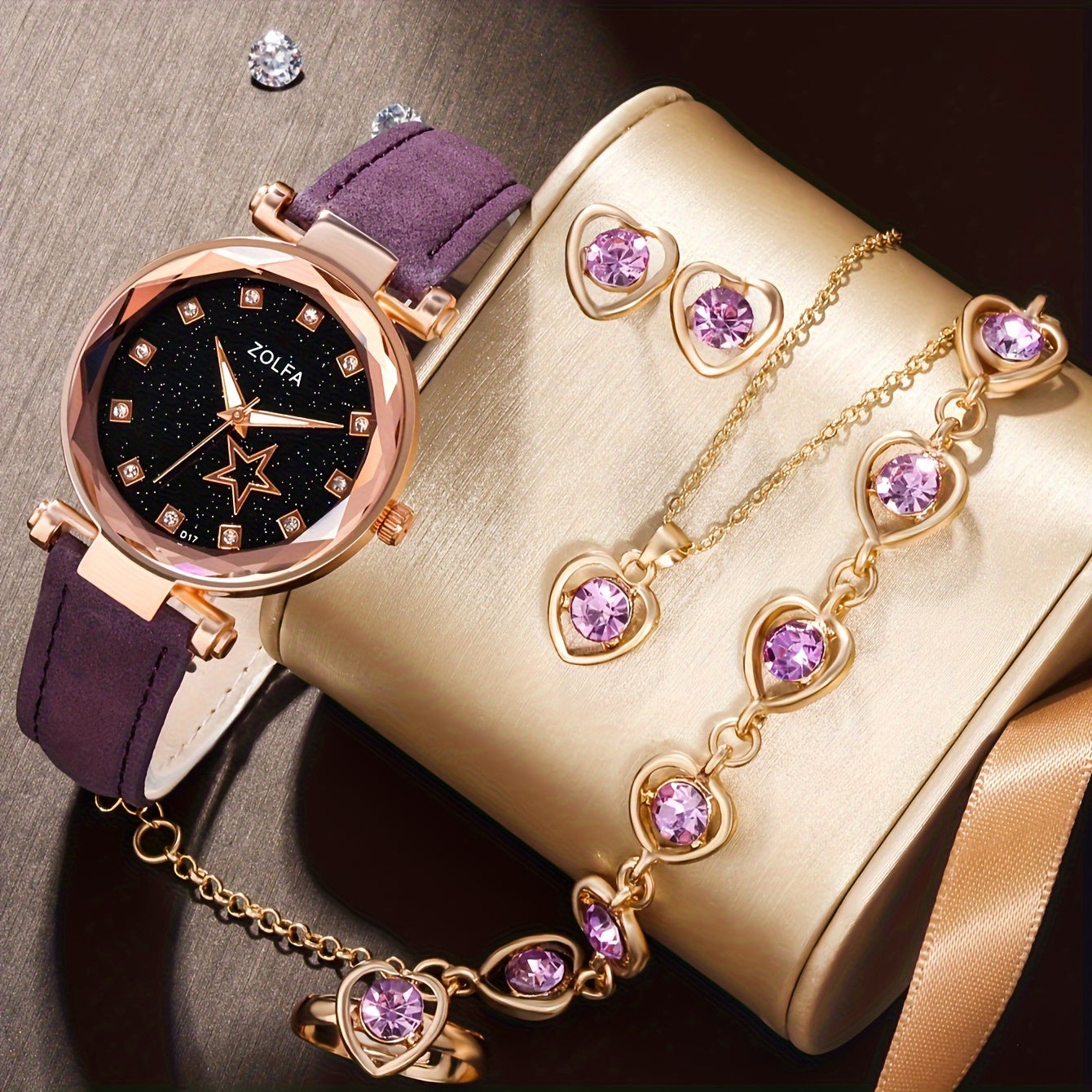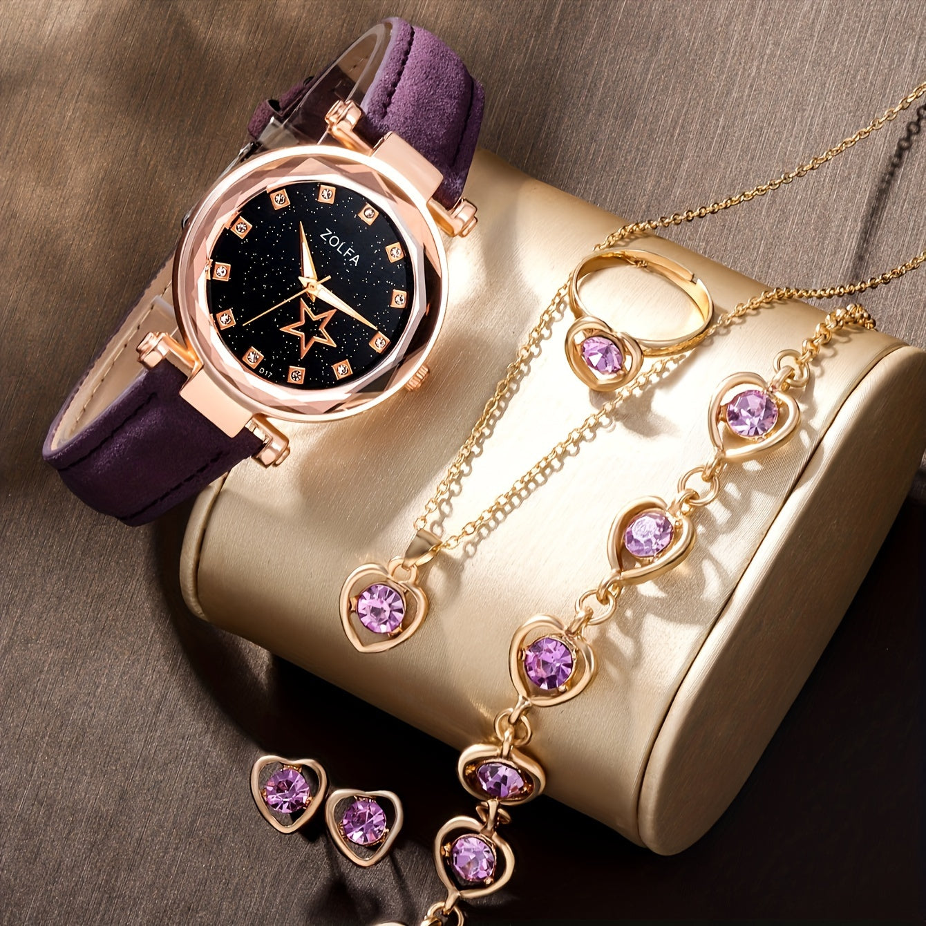 Ayollar modasi soati va zargarlik buyumlari to'plami, 6 dona, yurak rhinestone, yulduzli pentagram, sun'iy charm, sovg'a