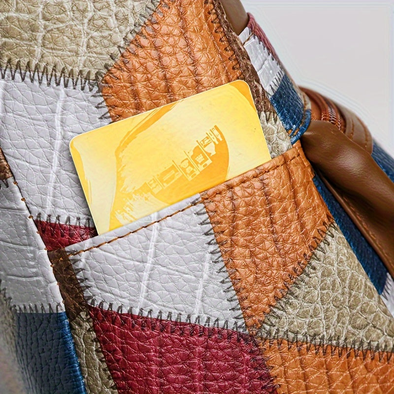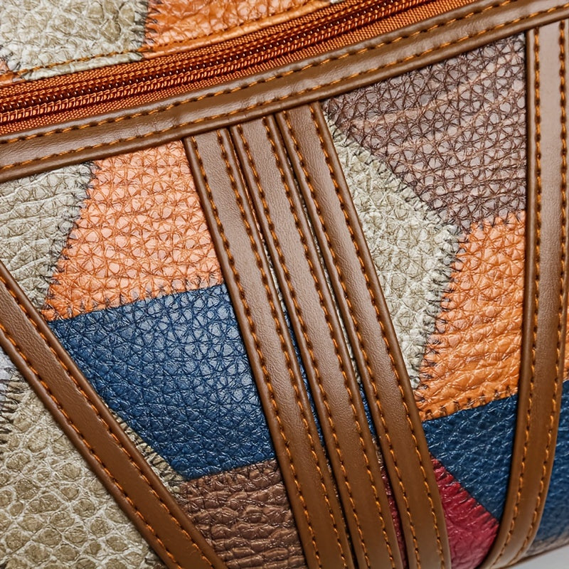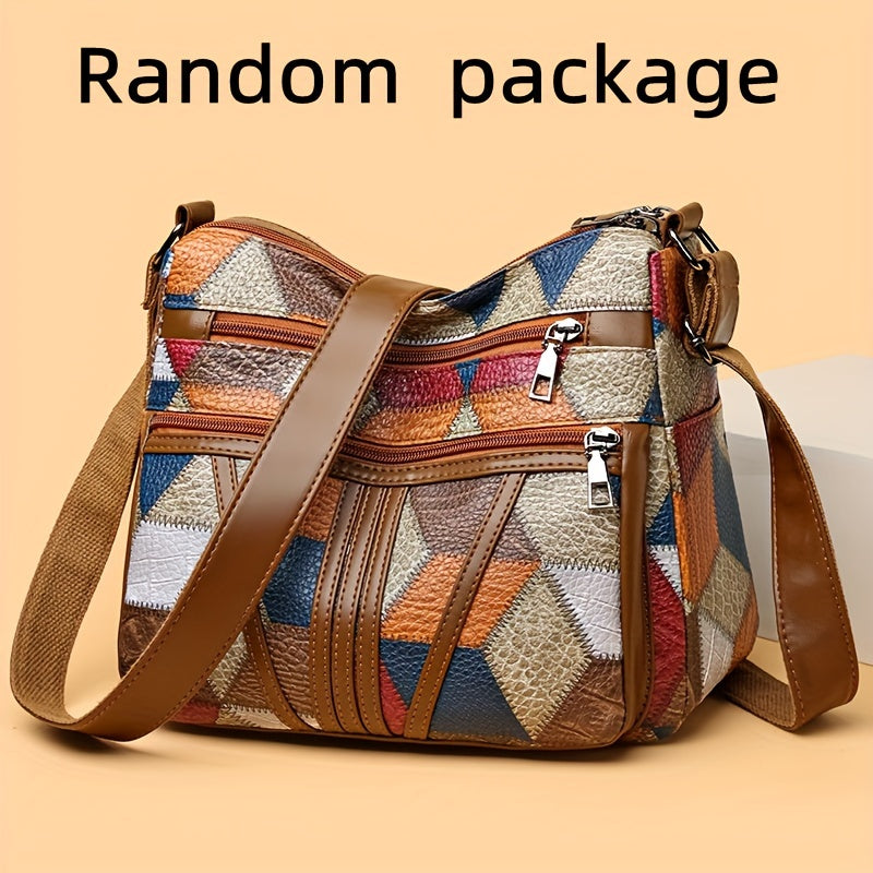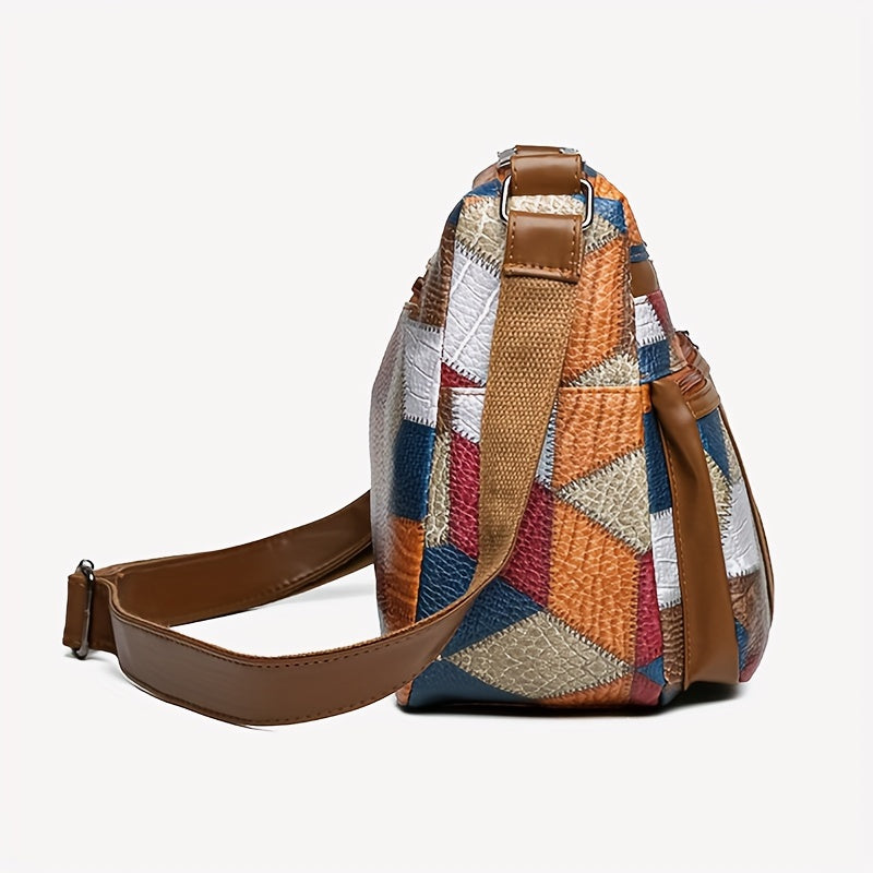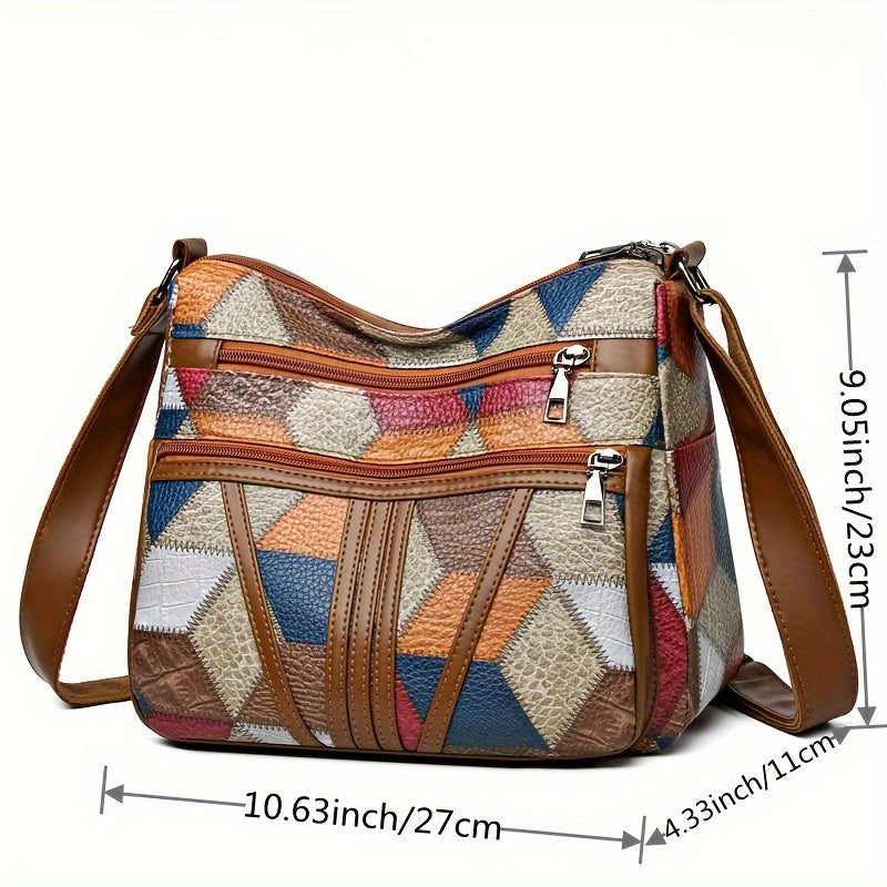 Zamonaviy geometrik naqshli yelka sumkasi keng ichki qismi va fermuari bilan.