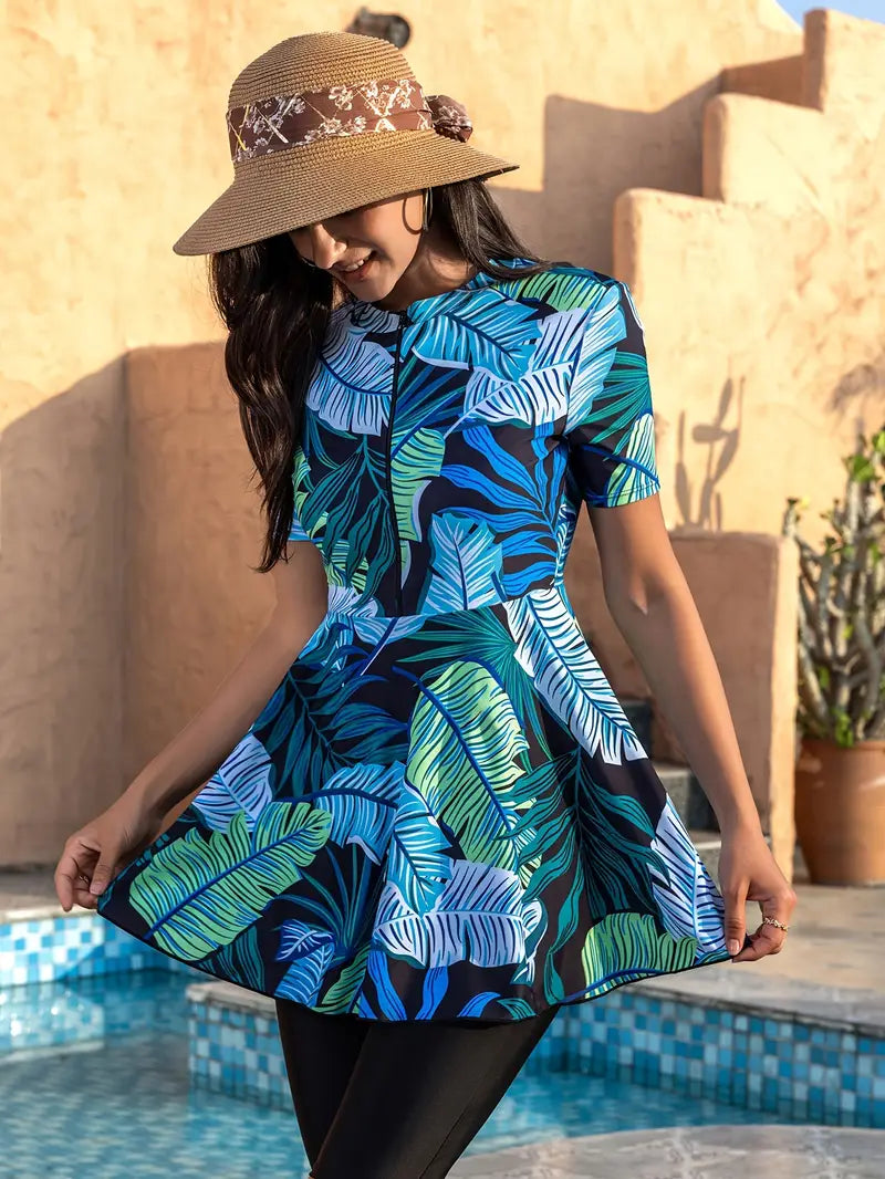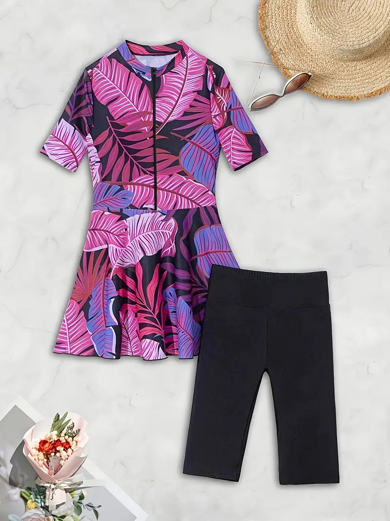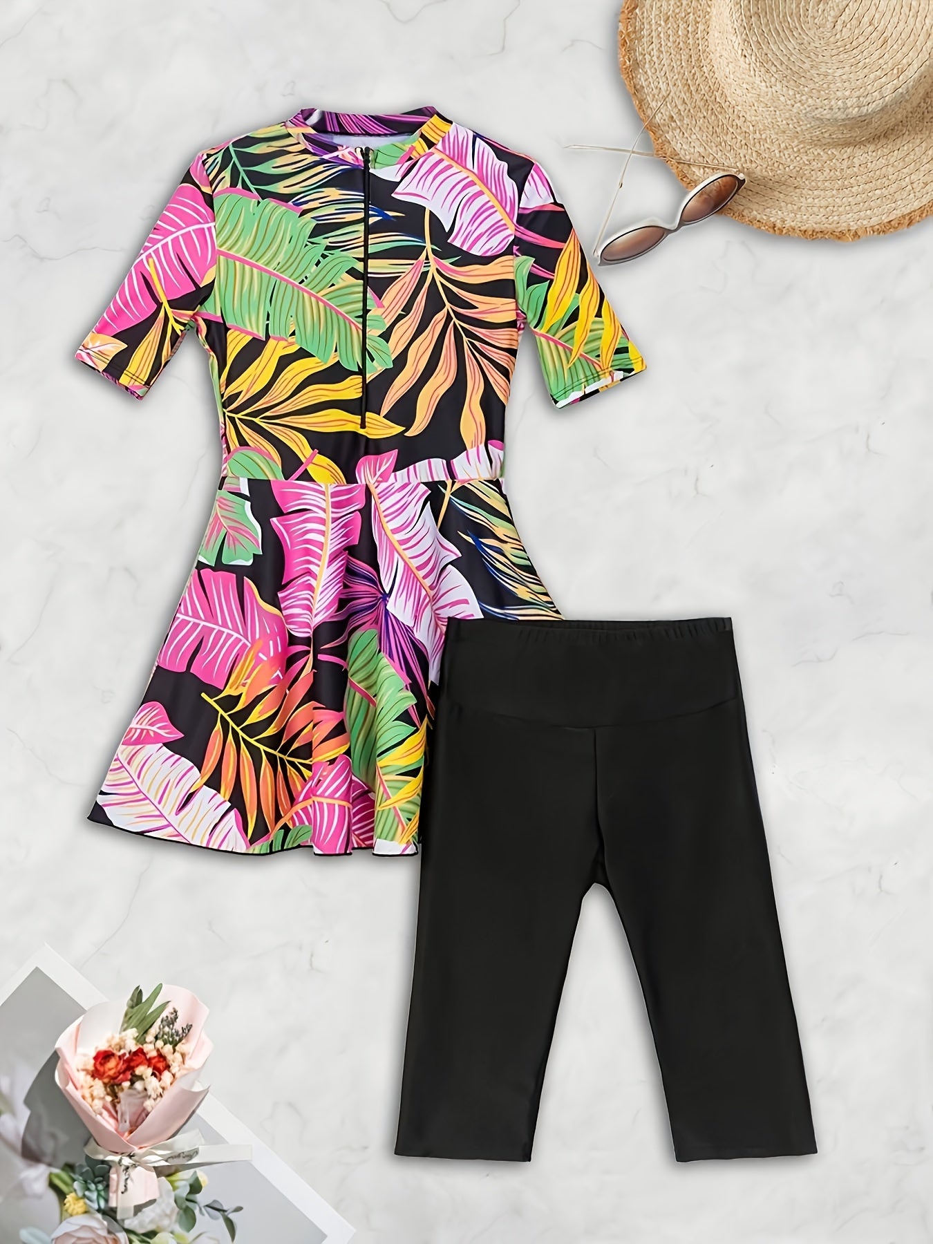 Ayollar uchun tropik barg naqshli yuqori bo'yli, qisqa yengli rash guard suzish to'plami, suv sportlari va plyaj faoliyatlari uchun ideal, cho'ziluvchan polyester/elastan aralashmasidan tayyorlangan, shaffof bo'lmagan mato.