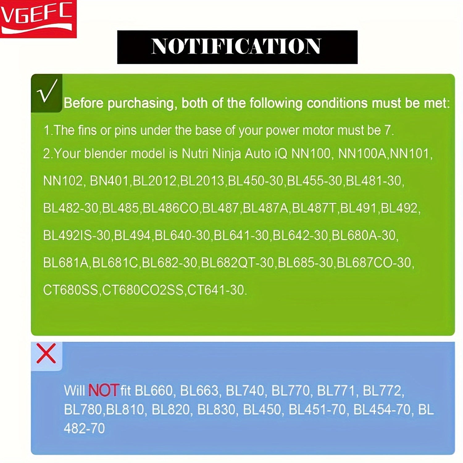 Ninja modellari BN751, BN801, BL450-30, BL456-30, BL454-30, Auto IQ Pro BL685, BL482-30, BL491, BL682-30 va BL642 bilan mos keladigan bir dona qoplama muhr bilan birga 7-finli gear almashtirish blender pichog'ining ikki dona. Ushbu pichoqlar mos keladi