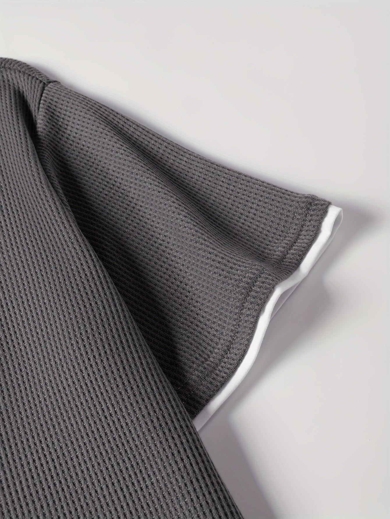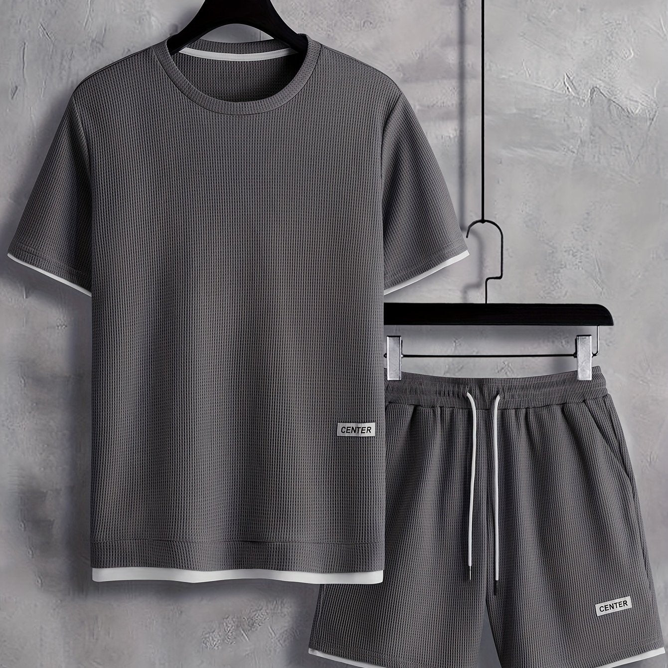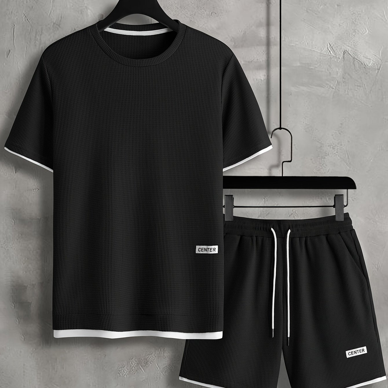 Erkaklar uchun ikkita zamonaviy kiyim: yoz uchun tasodifiy krujka yaka qisqa qo'ltiq futbolka va shortlar to'plami, ta'til va mashg'ulotlar uchun mukammal.
