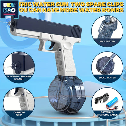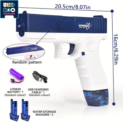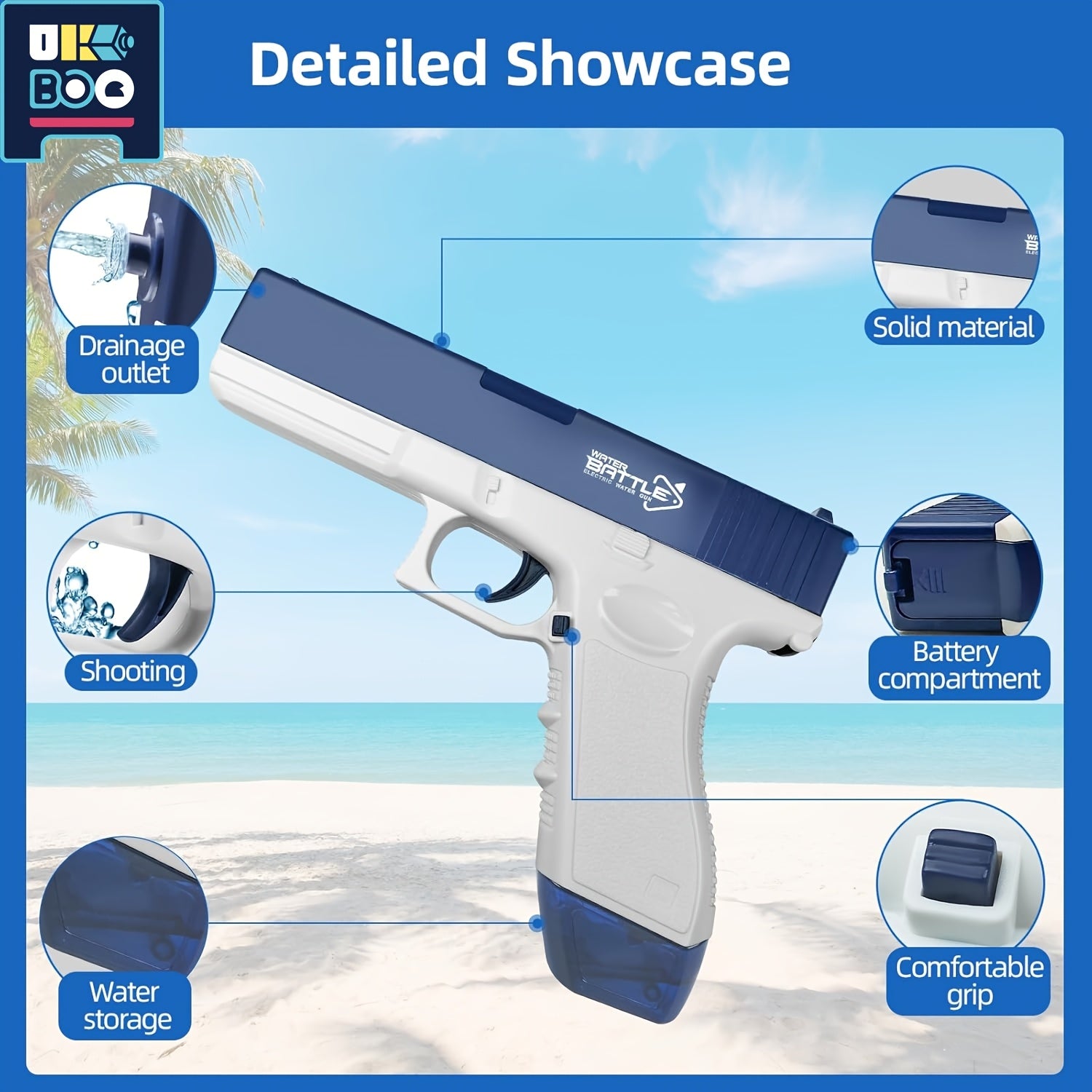 UKBOO elektr suv quroli ko'k va oq rangda, 500mAh lityum batareya bilan qayta zaryadlanadigan. Yozgi basseyn va plyaj partiyalari, shuningdek, kattalar yig'ilishlari uchun mukammal. Qiziqarli va yoqimli suv quroli o'yinchoq.