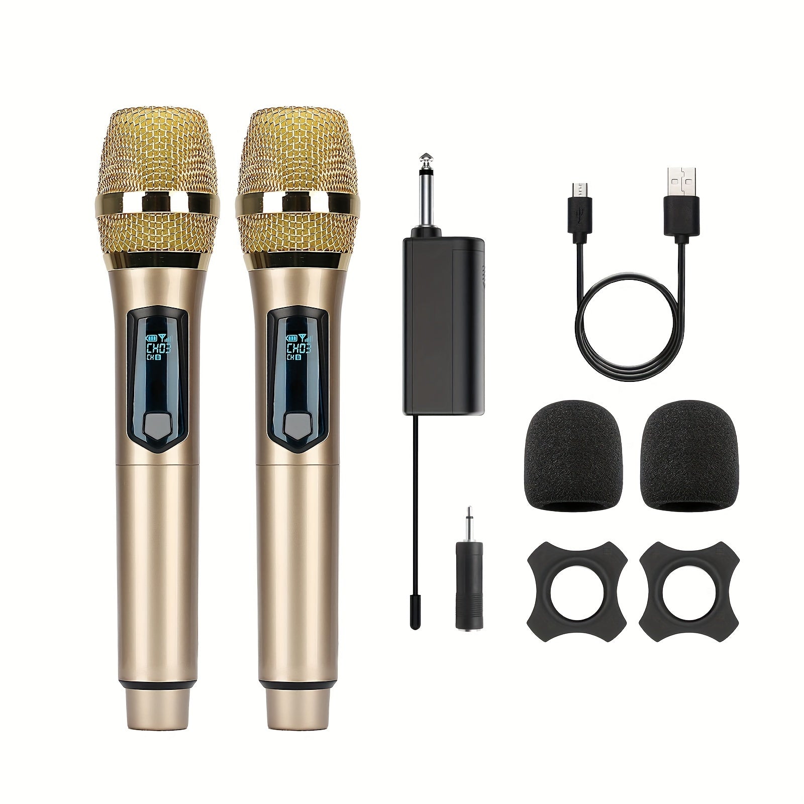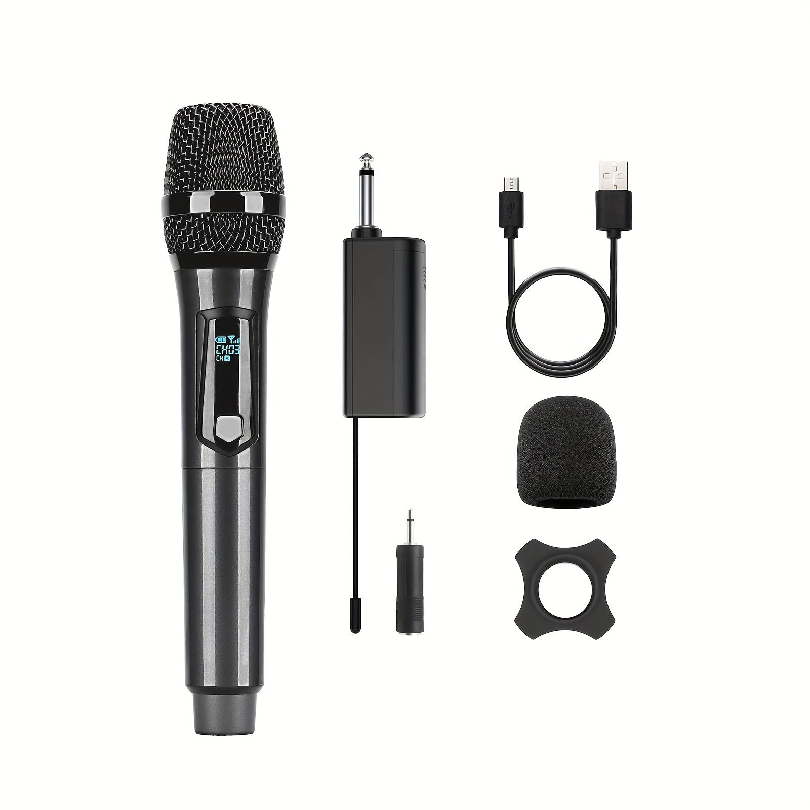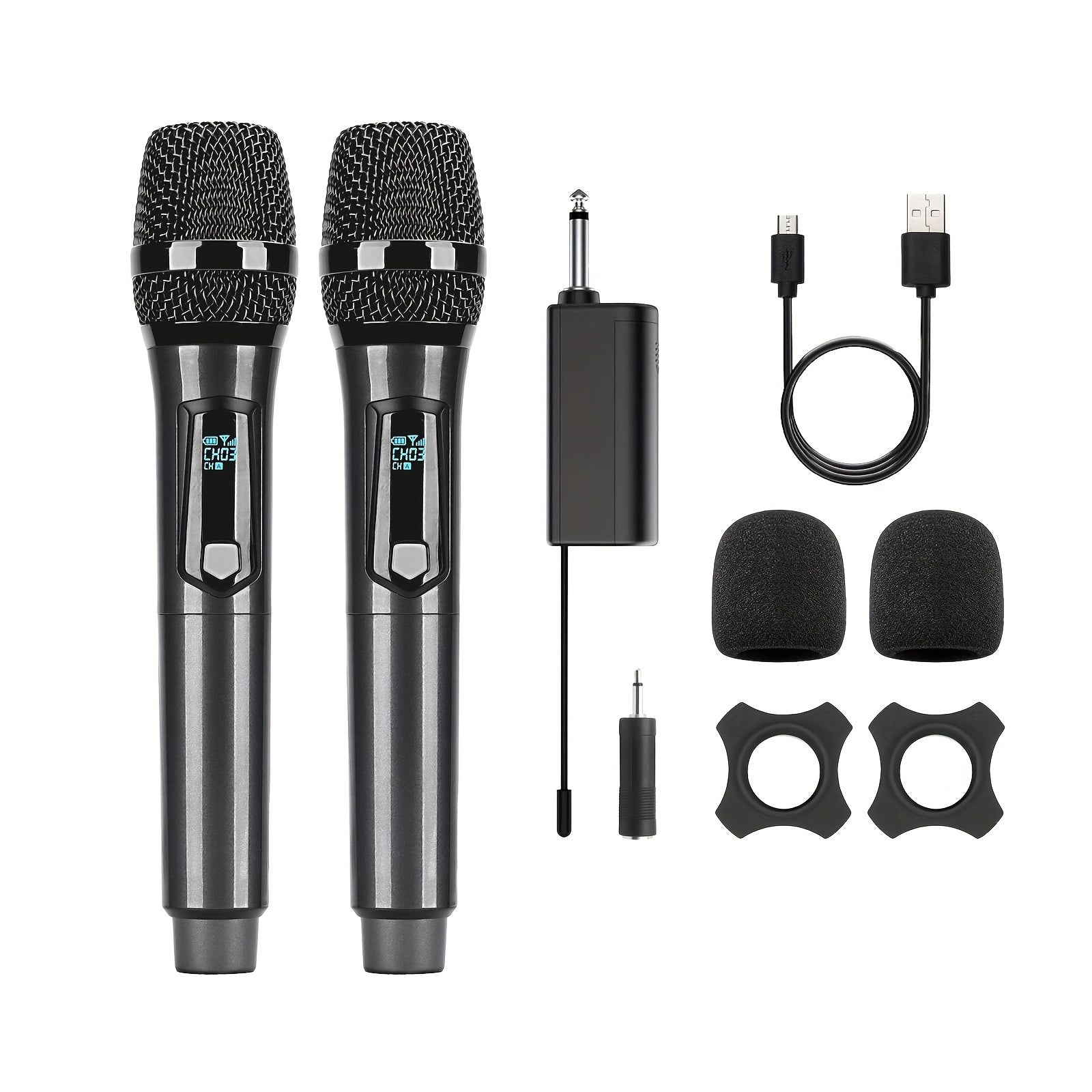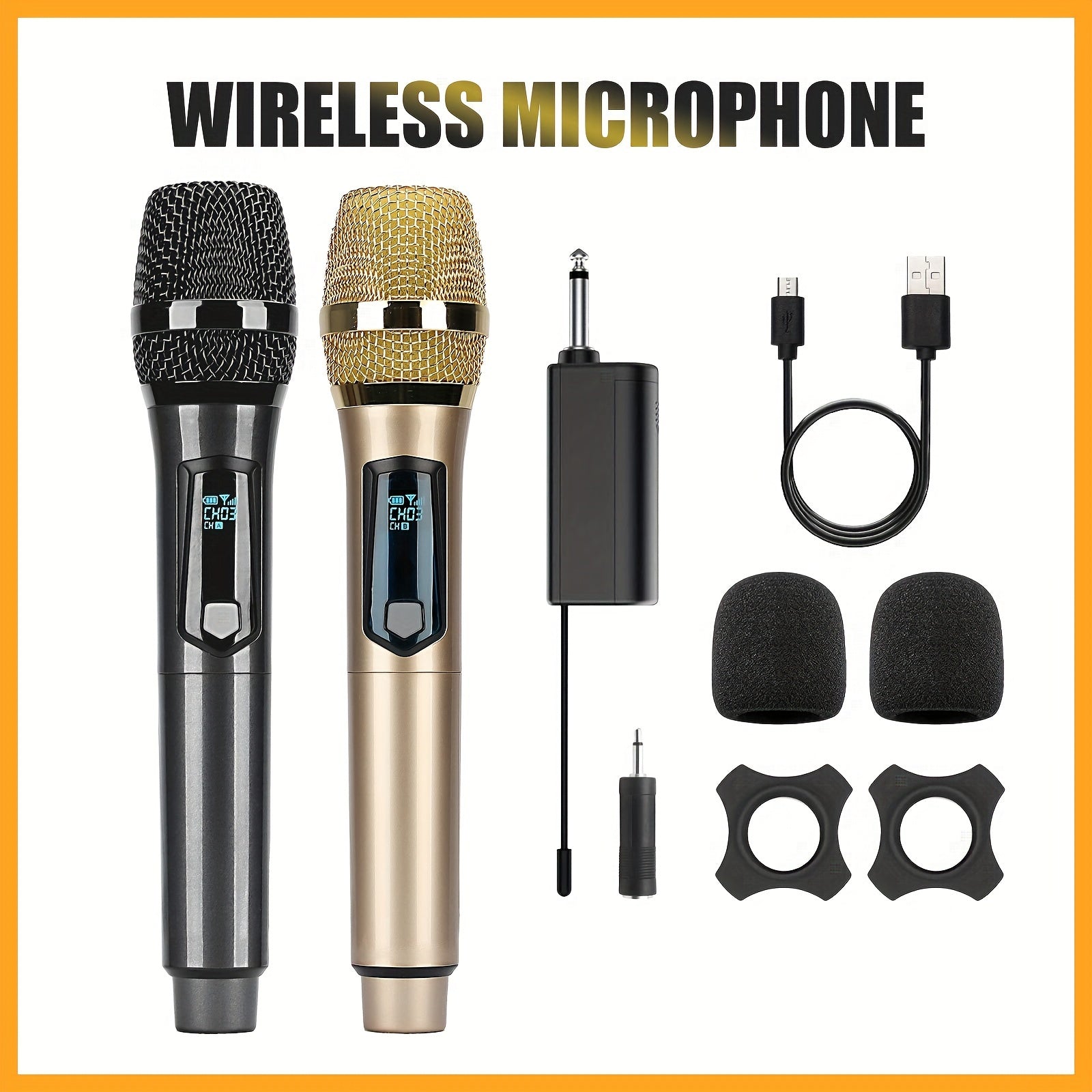 Universal simsiz mikrofon, ikki kanal bilan, qayta zaryadlanadigan, ulash va ishlatish uchun tayyor, karaoke, nutqlar, to'ylar, cherkov xizmatlari va ommaviy nutq tizimlari kabi turli foydalanishlar uchun mos.