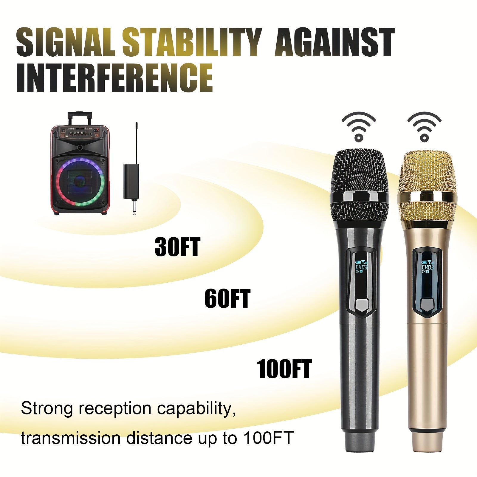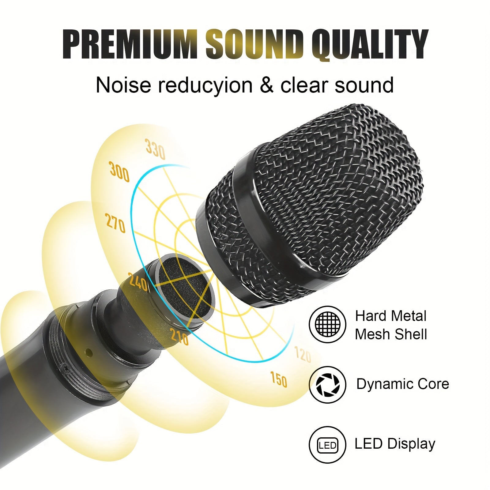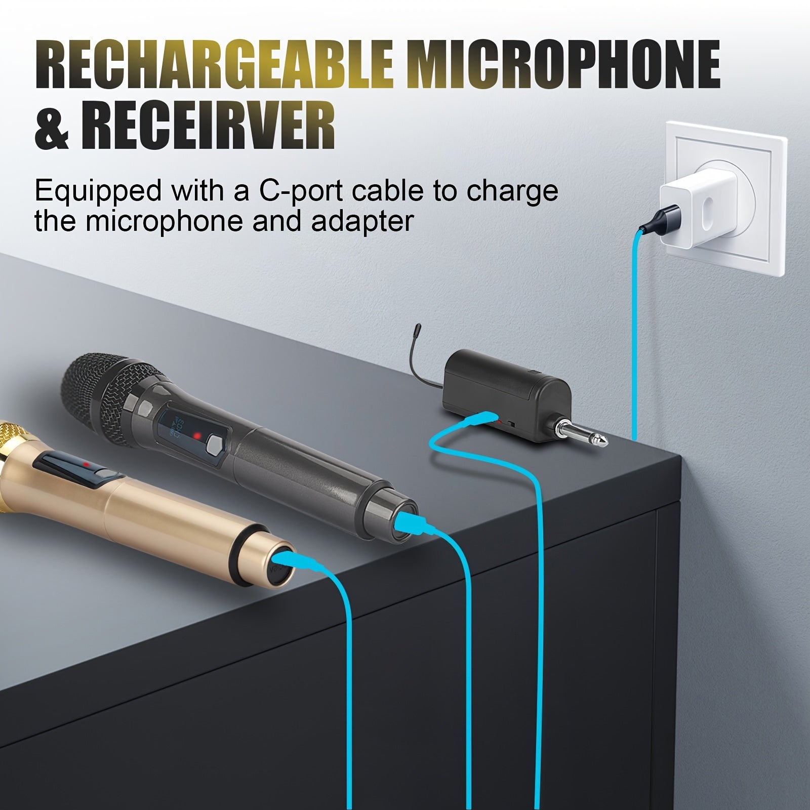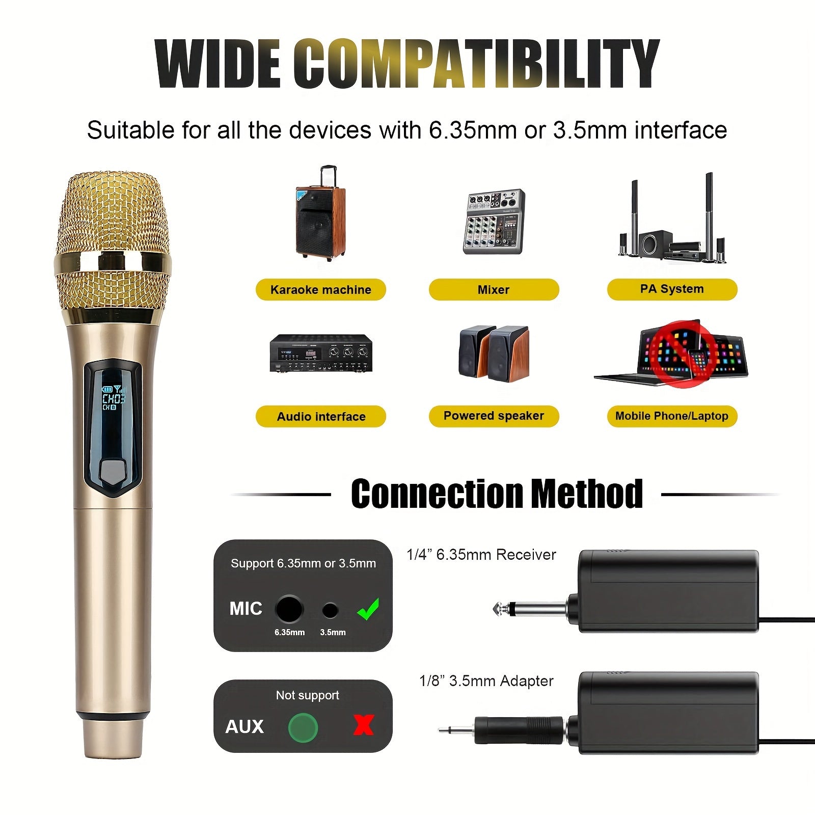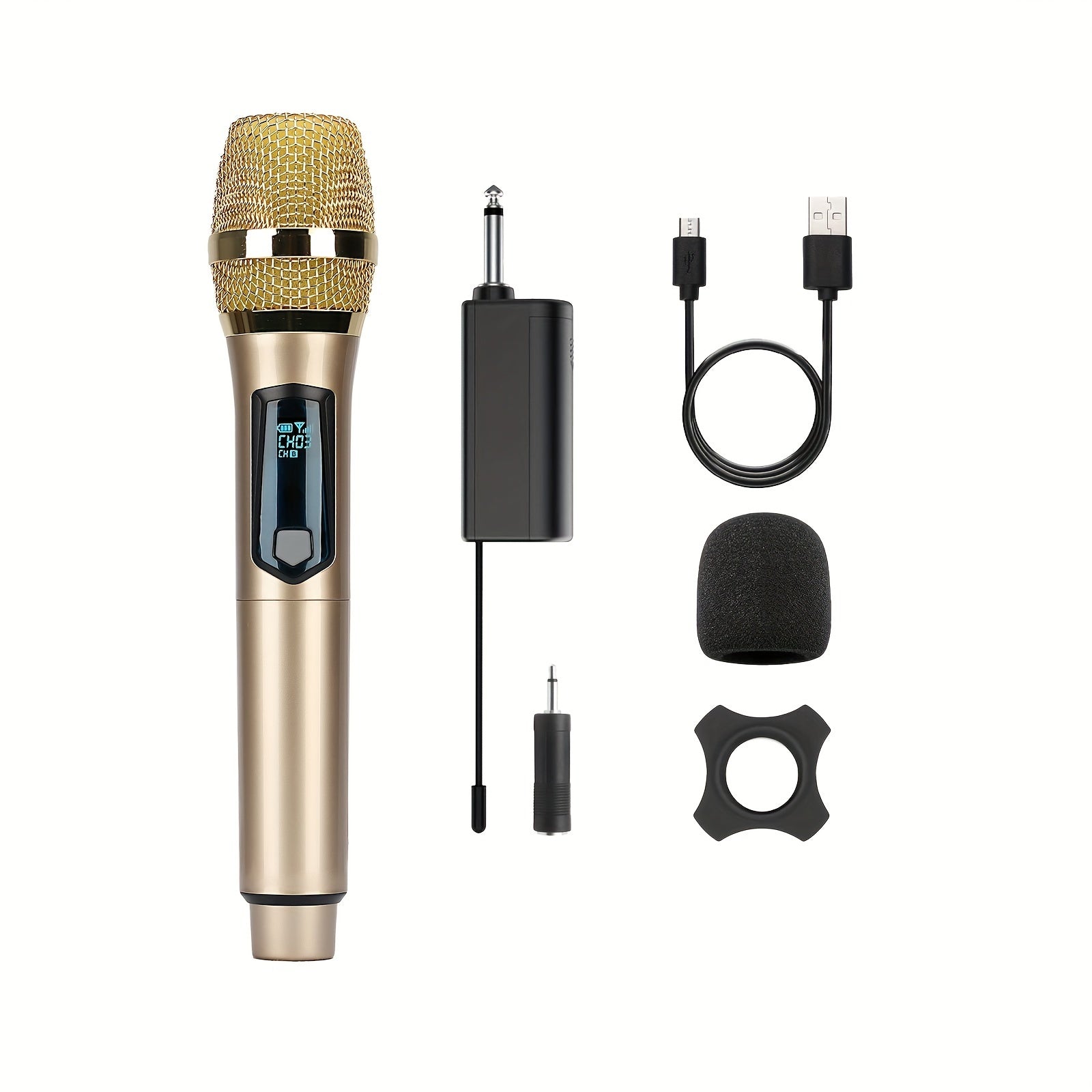 Universal simsiz mikrofon, ikki kanal bilan, qayta zaryadlanadigan, ulash va ishlatish uchun tayyor, karaoke, nutqlar, to'ylar, cherkov xizmatlari va ommaviy nutq tizimlari kabi turli foydalanishlar uchun mos.