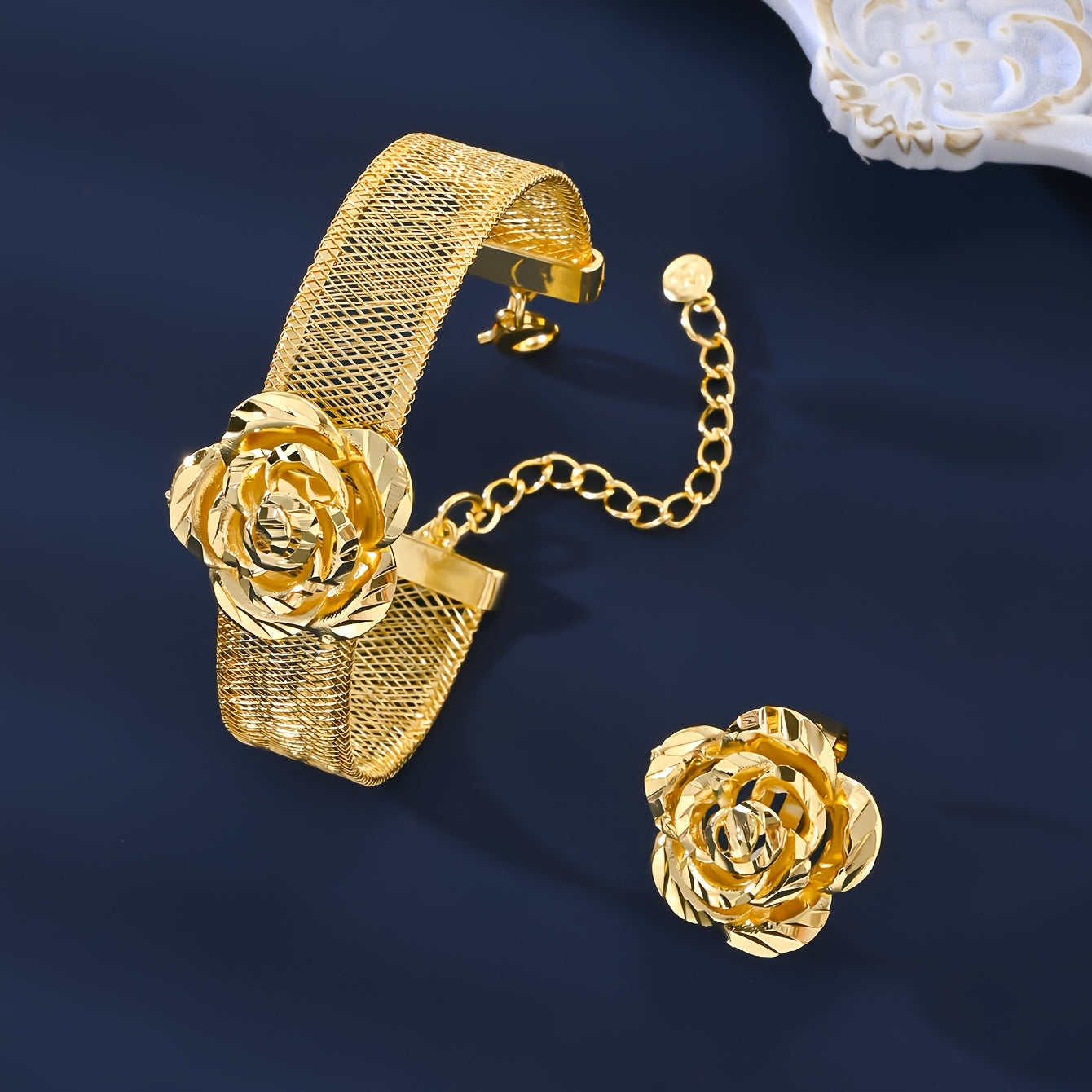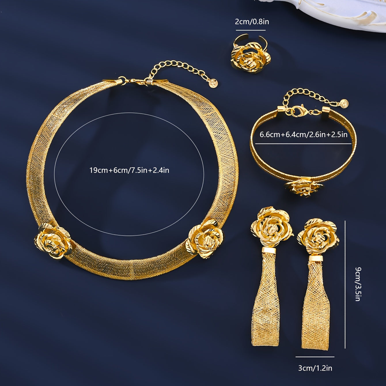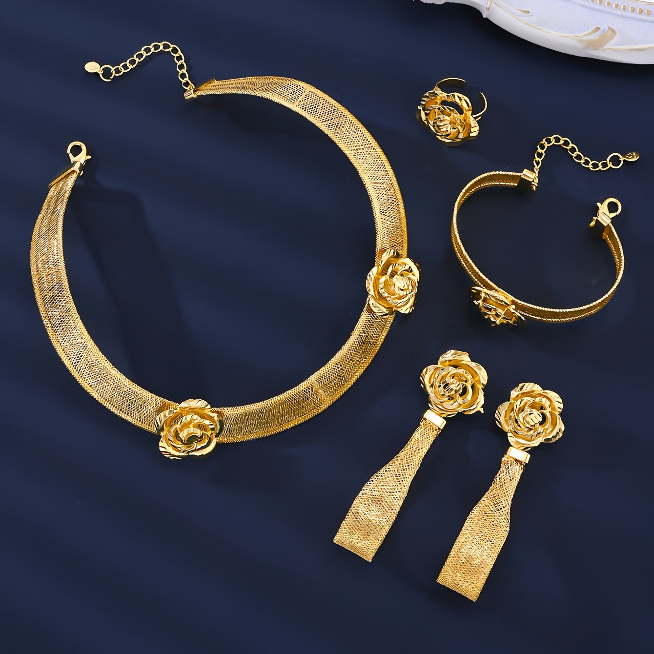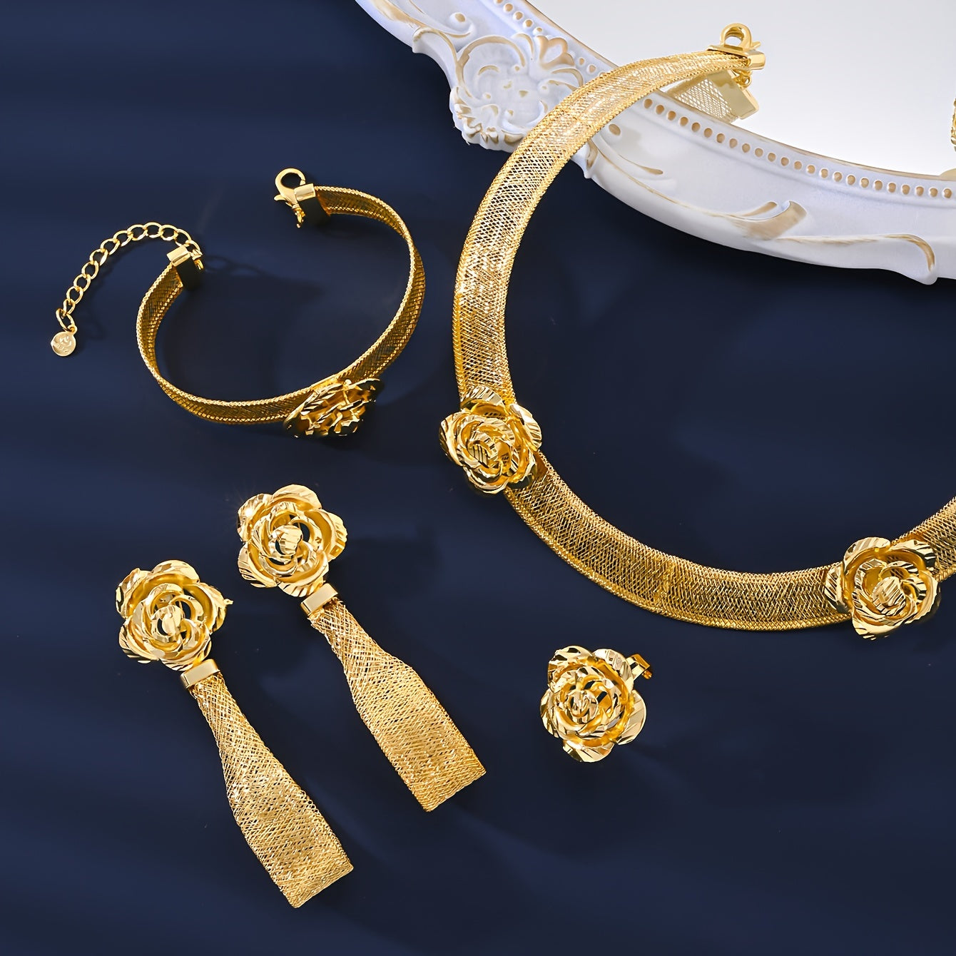 Vintage O'rta Sharq uslubidagi zargarlik to'plami, 18K oltin qoplangan mis taqinak, bilaguzuk, uzuk, quloq taqinchoq, sirg'a