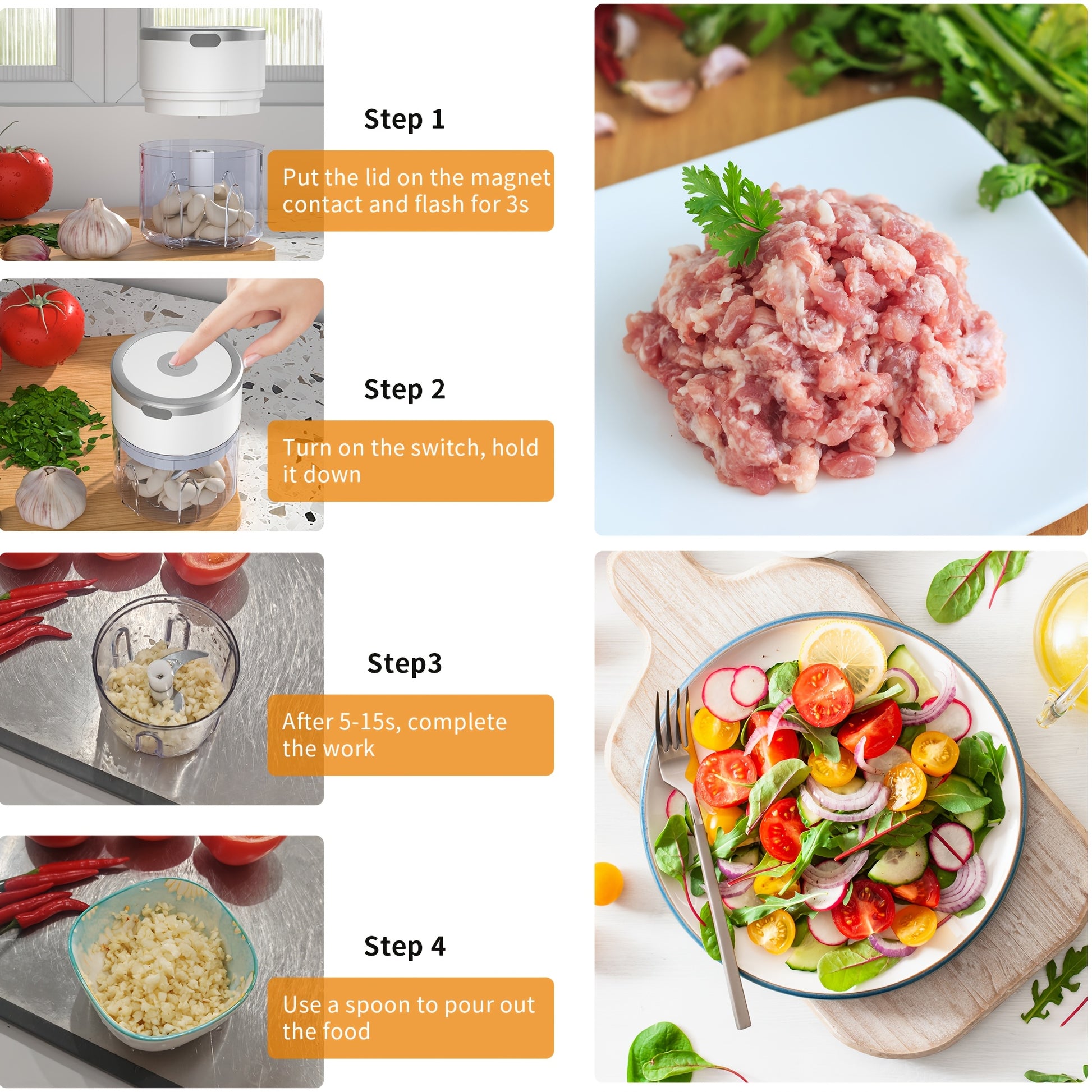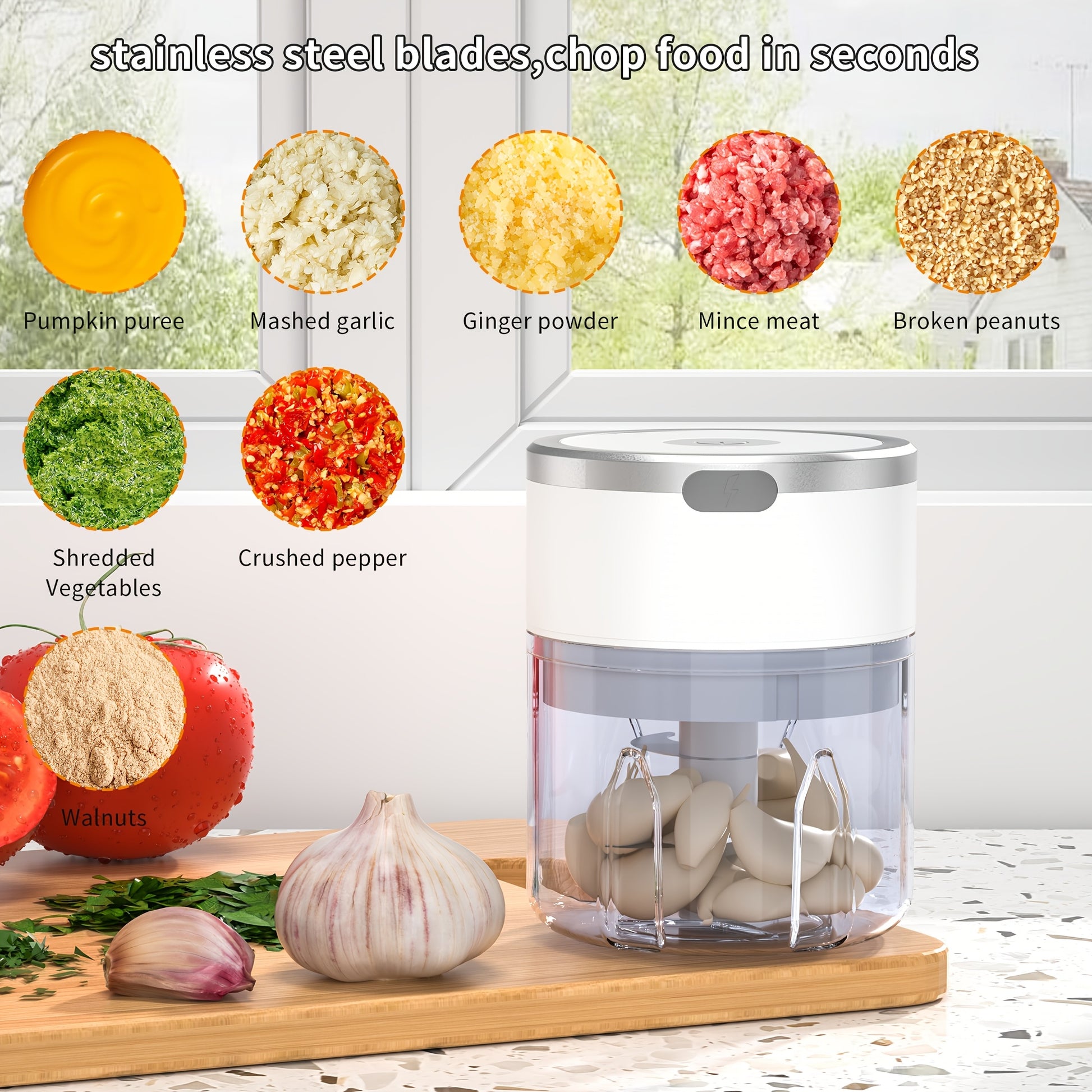8.45oz sigʻimiga ega USB qayta zaryadlanadigan mini oziq-ovqat maydalagich. Sabzavotlar, mevalar, sarimsoq, piyoz, chili, selderey va zanjabilni maydalash uchun ideal. Goʻsht maydalash funksiyasini oʻz ichiga oladi. Portativ oshxona