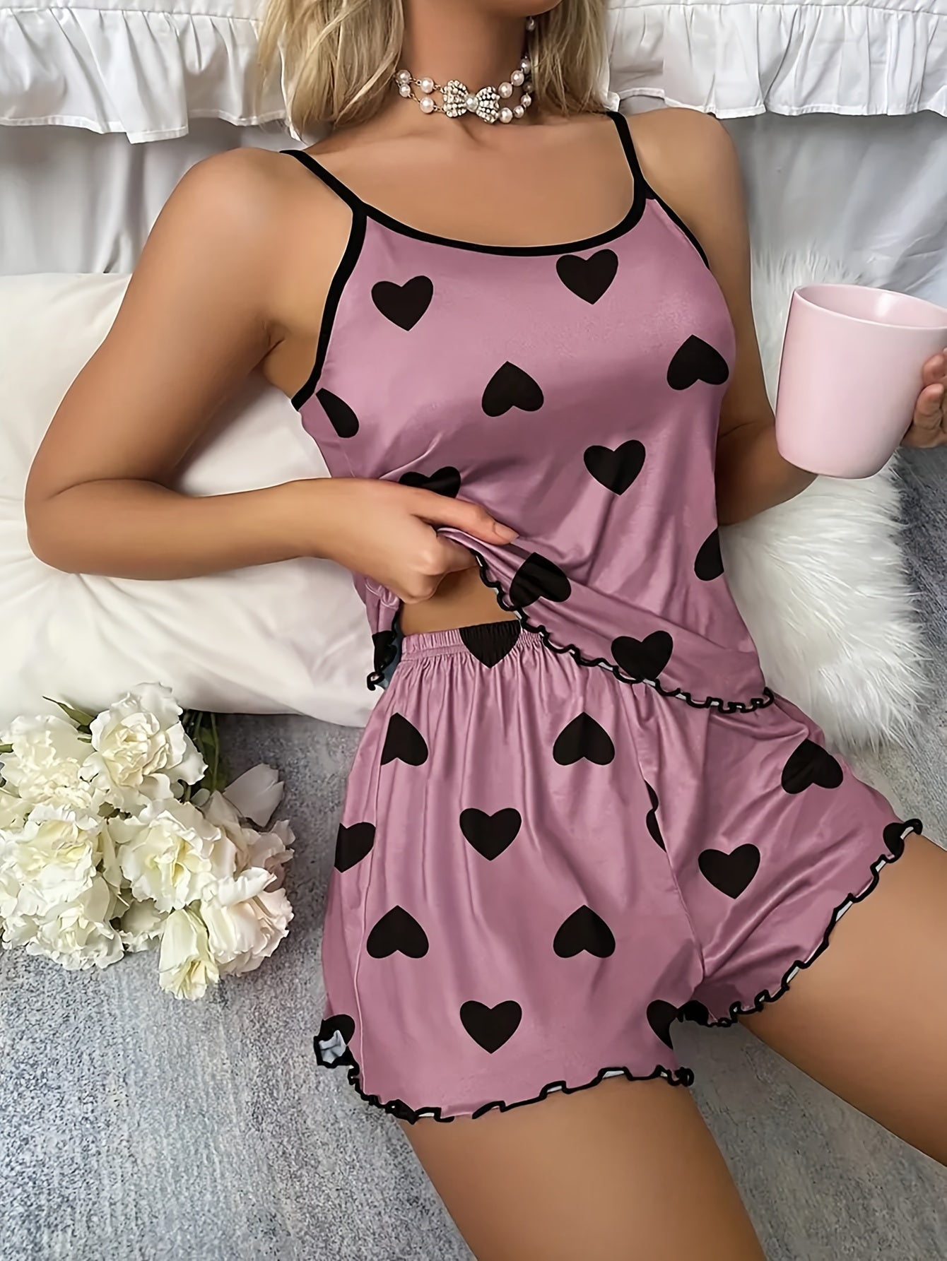 Ayollar uchun yurak naqshli, letus trimli, orqa qismi ochiq kamizel va elastik shortiklardan iborat Sevishganlar kuni pijama to'plami. Uxlash va dam olish uchun mukammal.