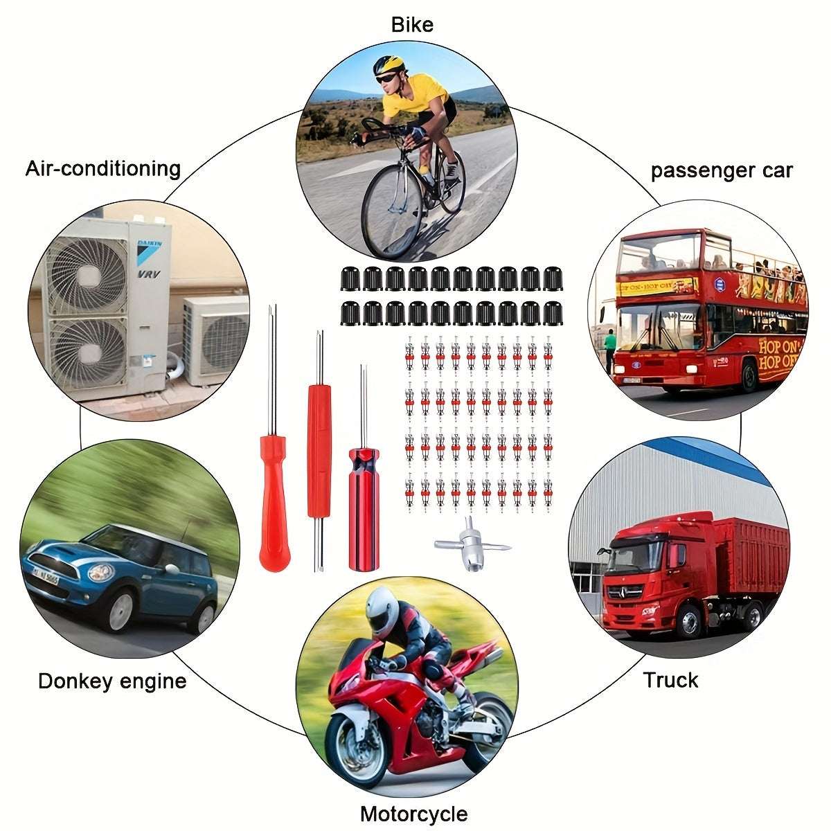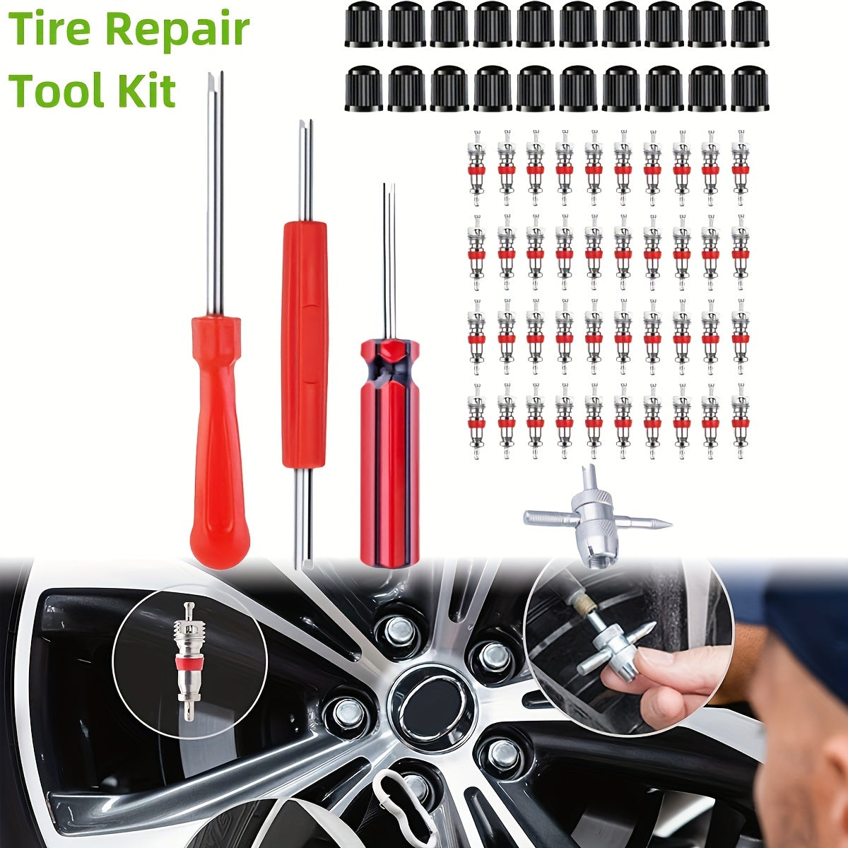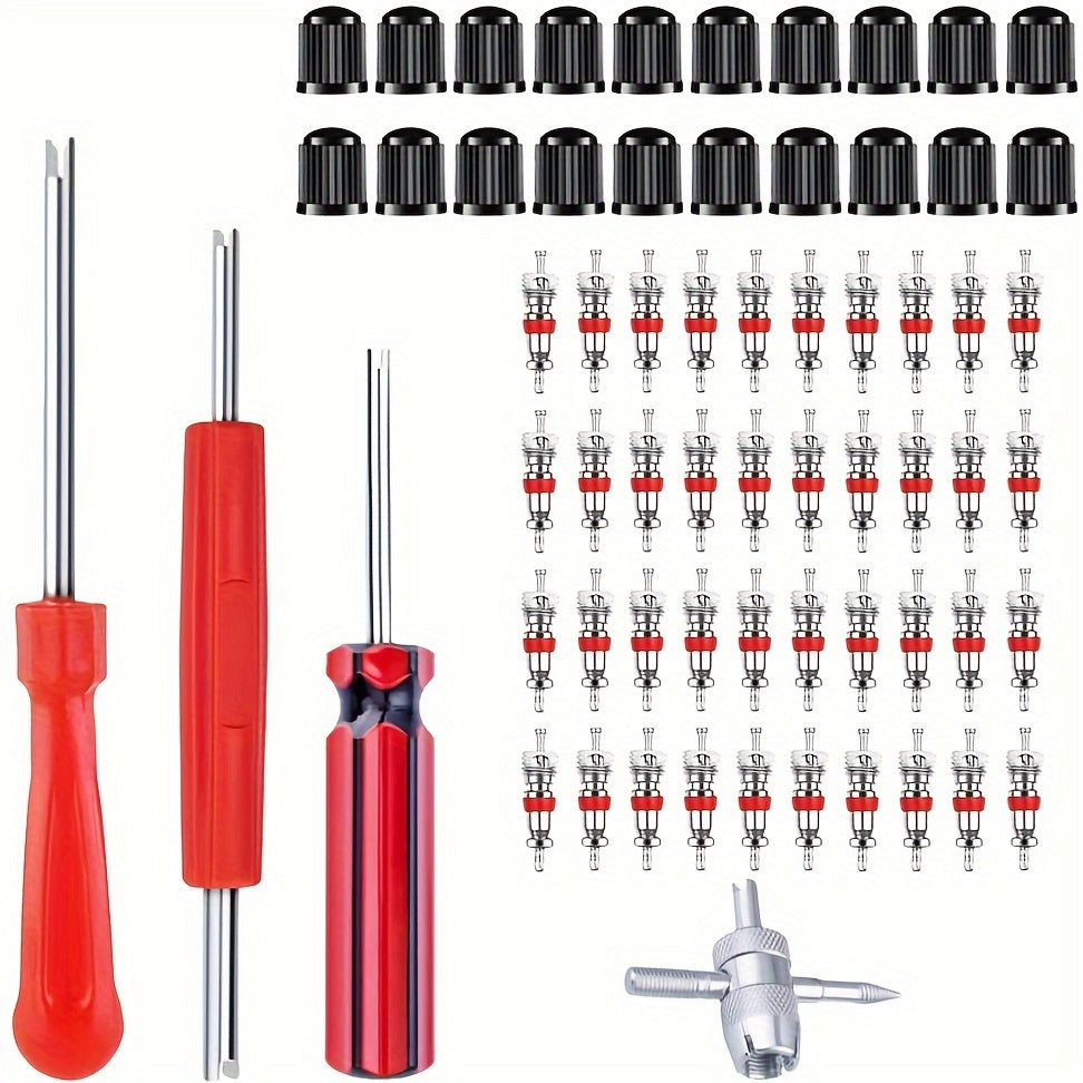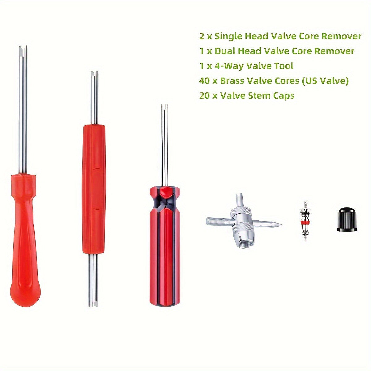 64 dona metaldan yasalgan valf yadro asboblari to'plami, elektr energiyasini talab qilmaydi, isitish, sovutish va havo tozalash qurilmalari uchun ideal. Ikki boshli valf yadro olib tashlagich, 4 yo'nalishli mis valf qopqog'i va yadro asbobi kiradi.