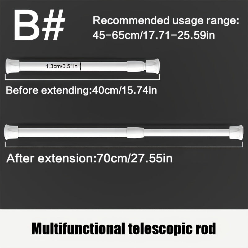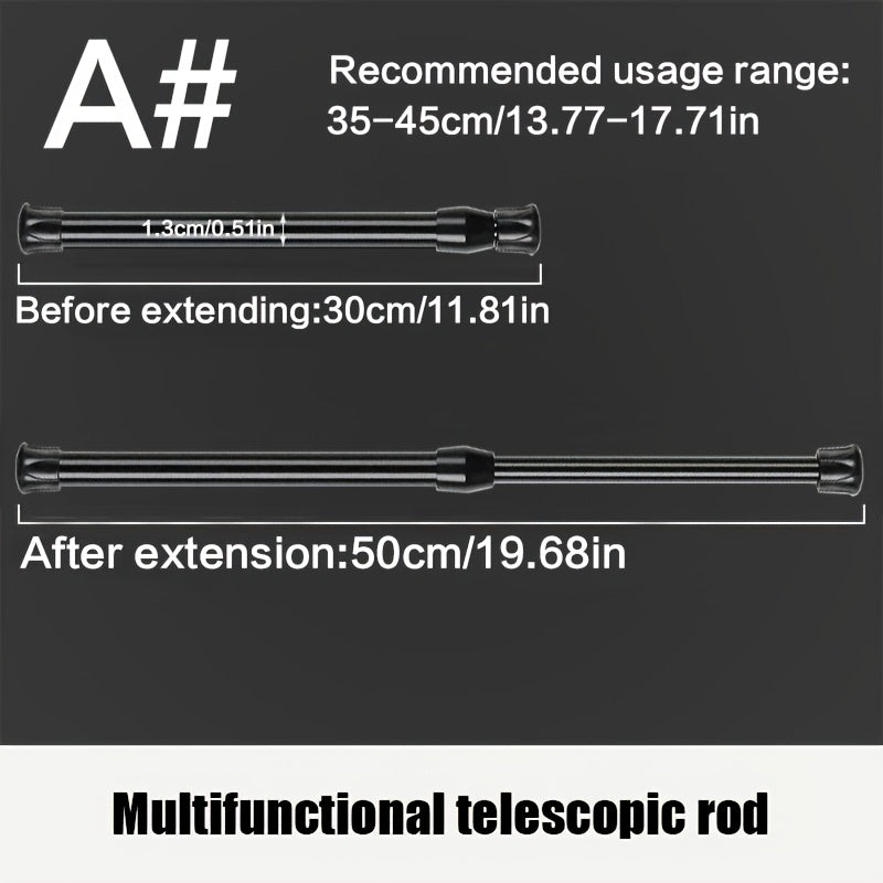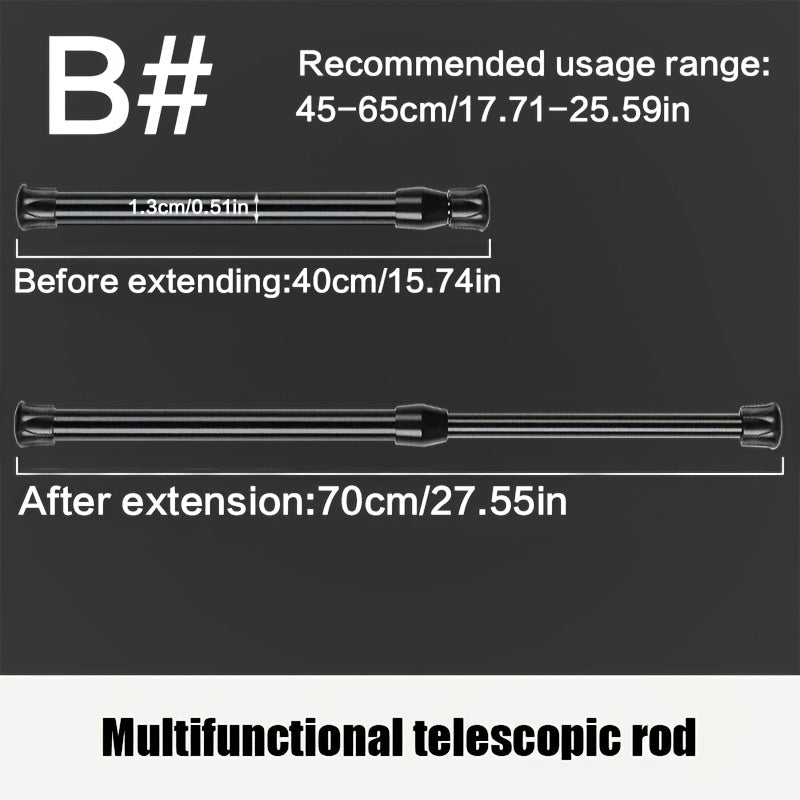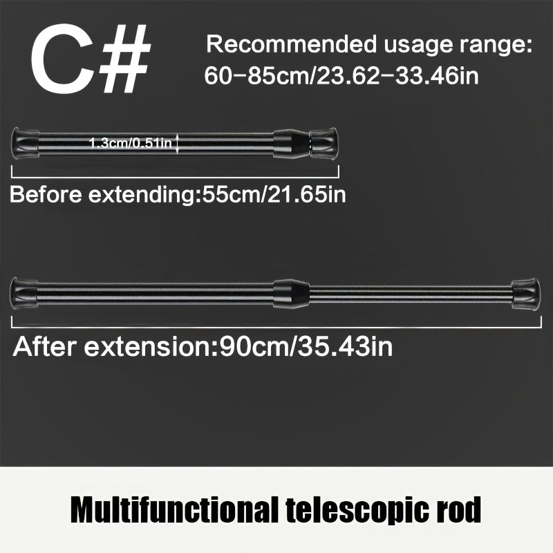 Turli joylarda oson o'rnatish uchun sozlanadigan spring kuchi bilan ko'p maqsadli metall pardalar tayoqchasi.