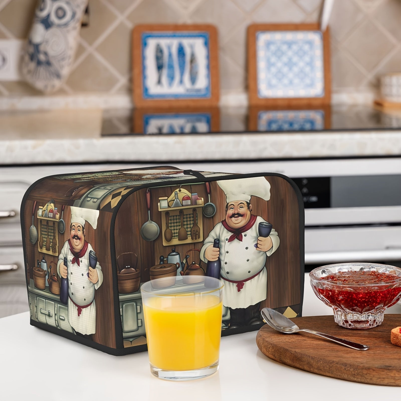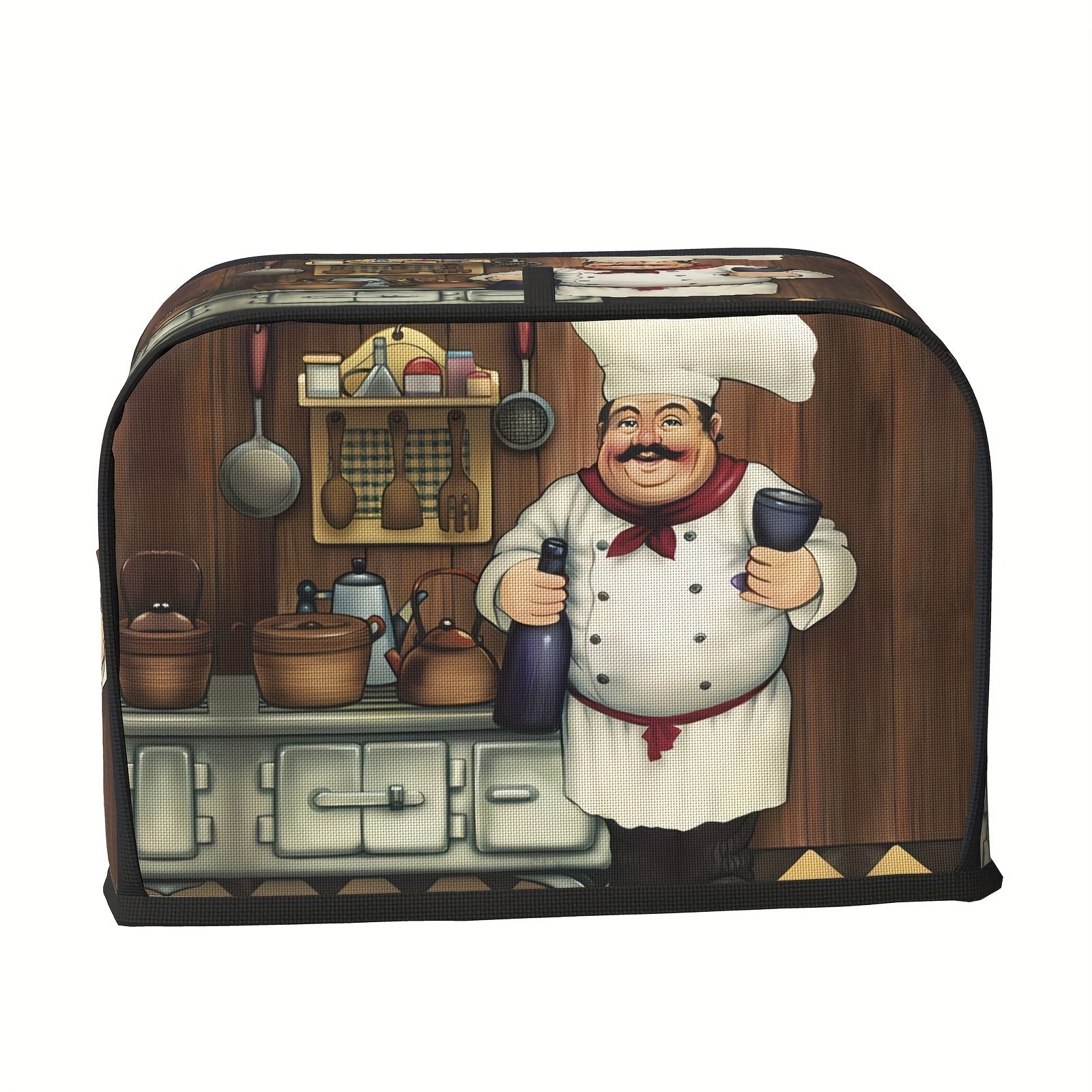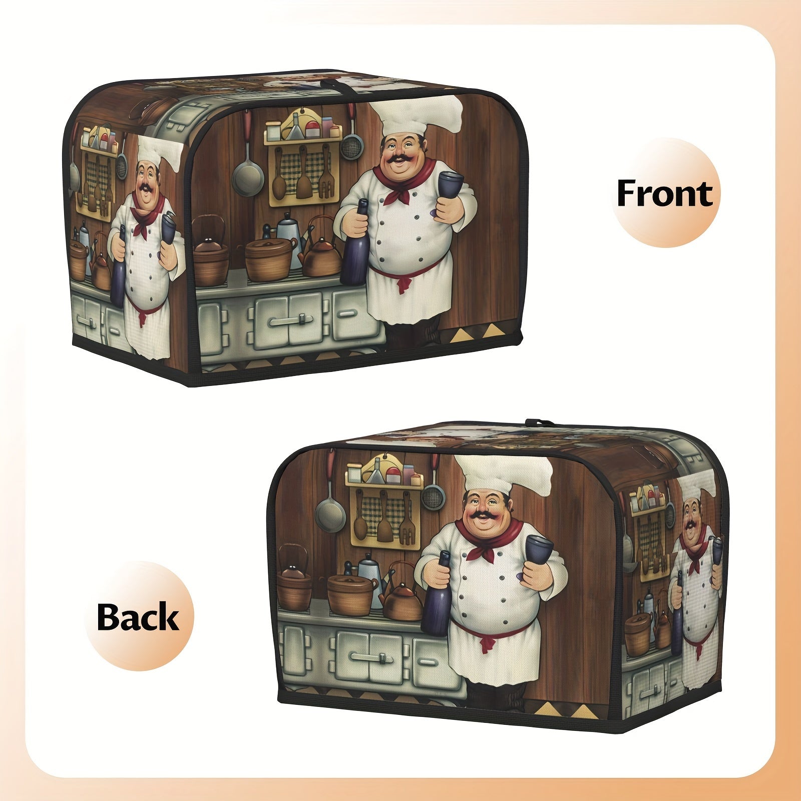 Vintage Farmhouse uslubidagi tost qopqog'i, kulgili semiz oshpaz dizayni bilan, standart 2/4 bo'lakli tostlar uchun yuvilishi mumkin bo'lgan changdan himoyalovchi oshxona apparati qopqog'i - osish uchun yuqori tutqichni o'z ichiga oladi.