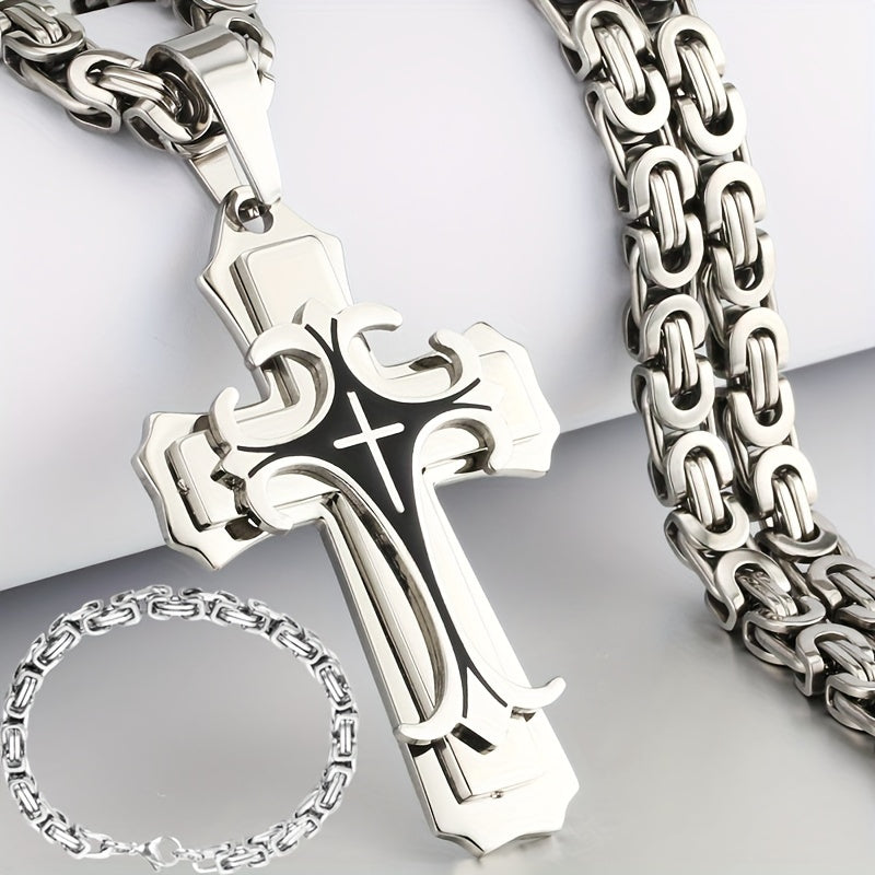 Vintage qo'lda tayyorlangan erkaklar uchun marjon va bilaguzuk to'plami, oltin qora zanglamaydigan po'latdan qilingan xoch pendanti bilan.