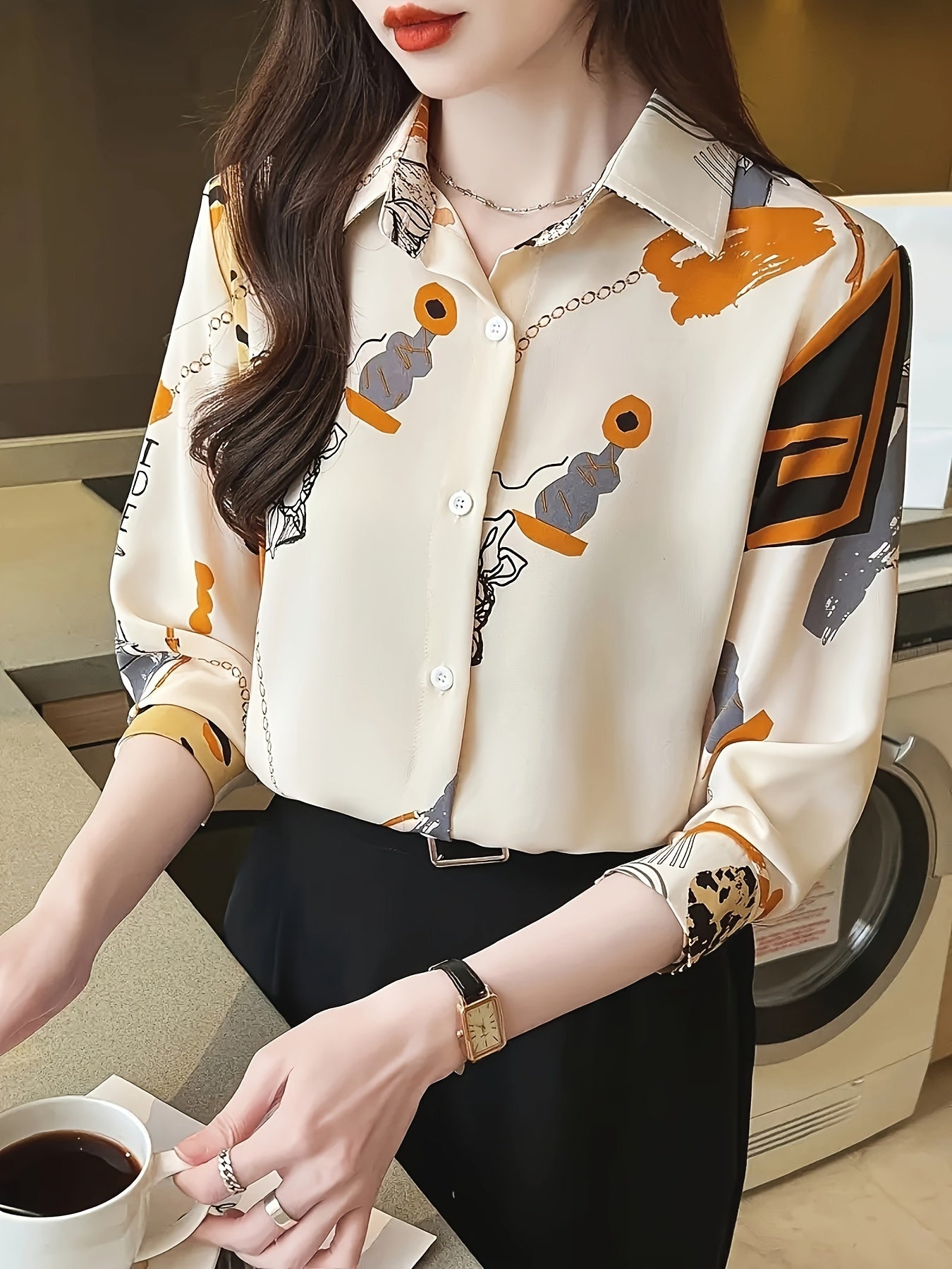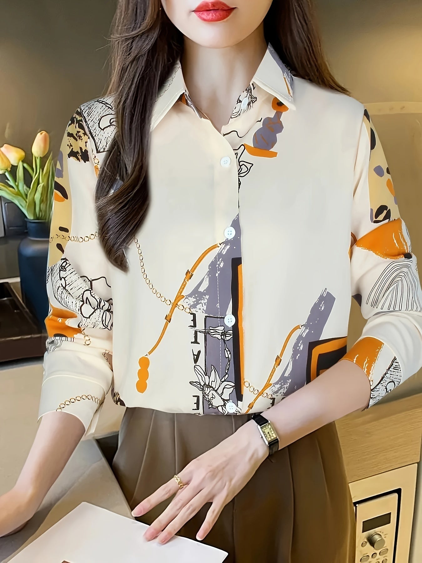 Vintage uslubidagi tugmachali bluzka, zanjir va gullar naqshli yaka bilan. 95% polyester va 5% spandeksdan tayyorlangan, geometrik naqshlar bilan. Uzoq yengli to'qilgan yuqori qism uchun mukammal.