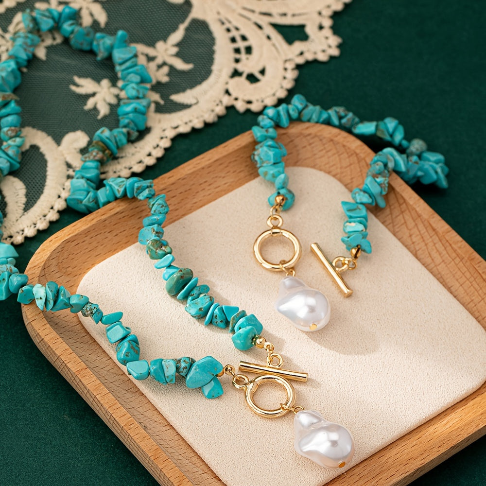 Vintage uslubidagi to'q ko'k va sun'iy marvaridli pandant bilaguzuk va zanjir to'plami - Chic bohem uslubi, har kuni kiyish yoki sovg'a berish uchun ideal