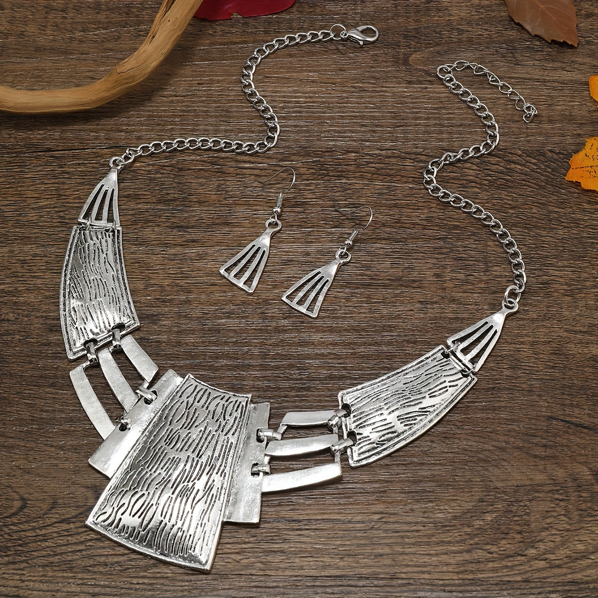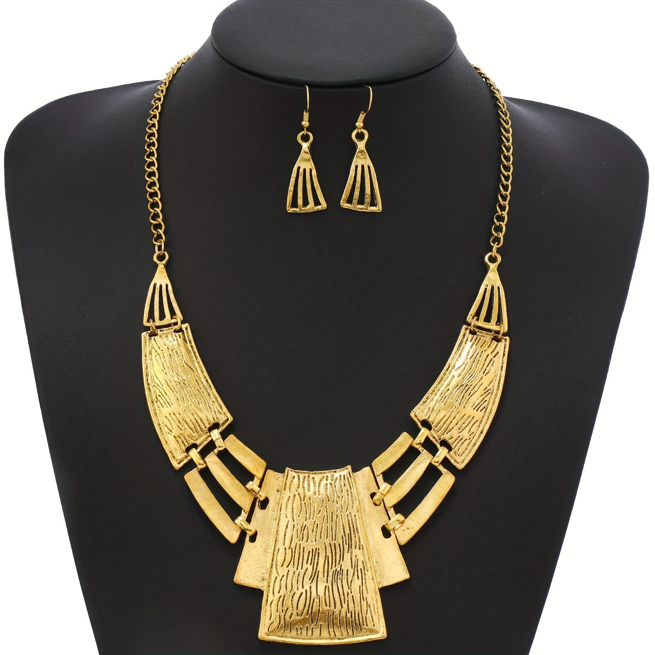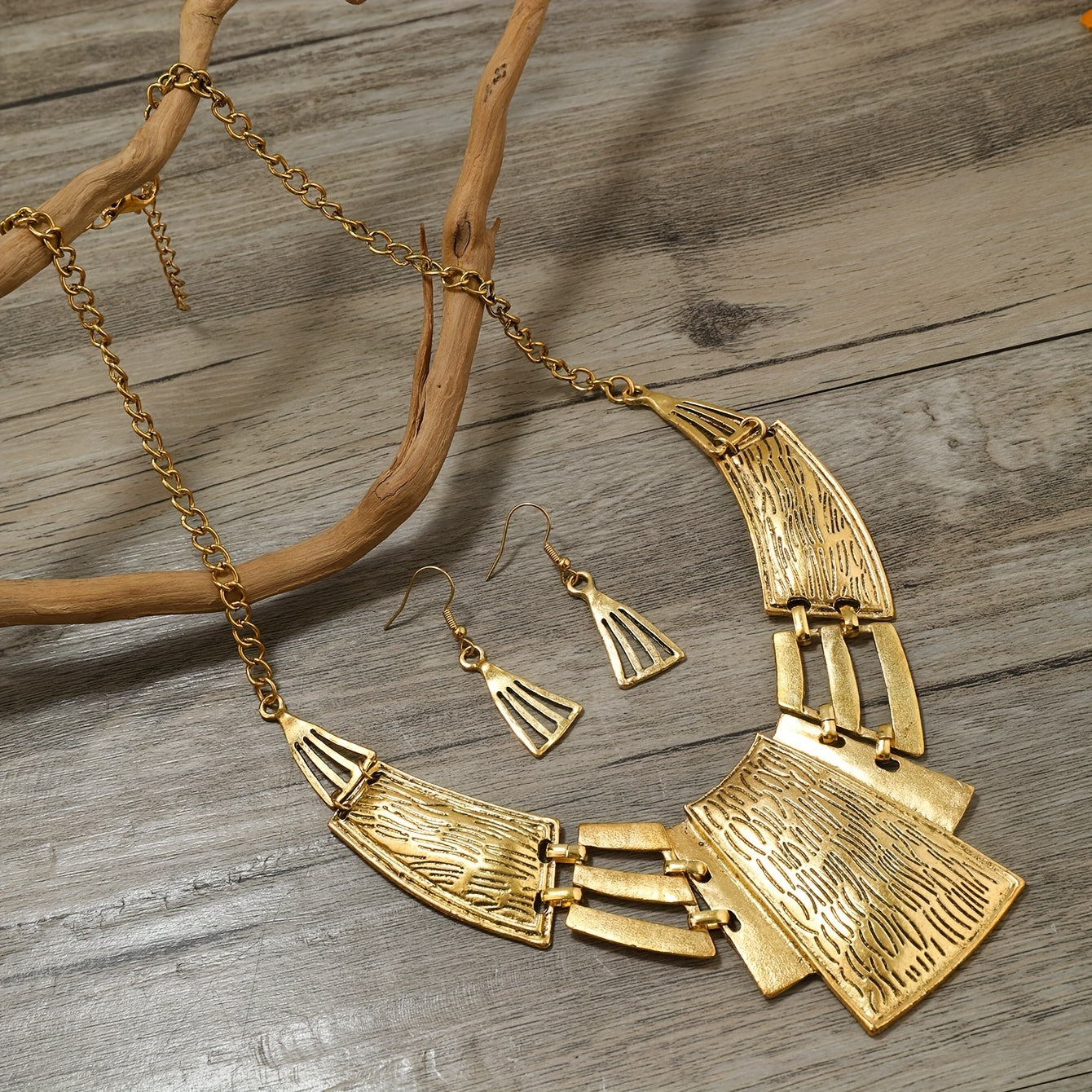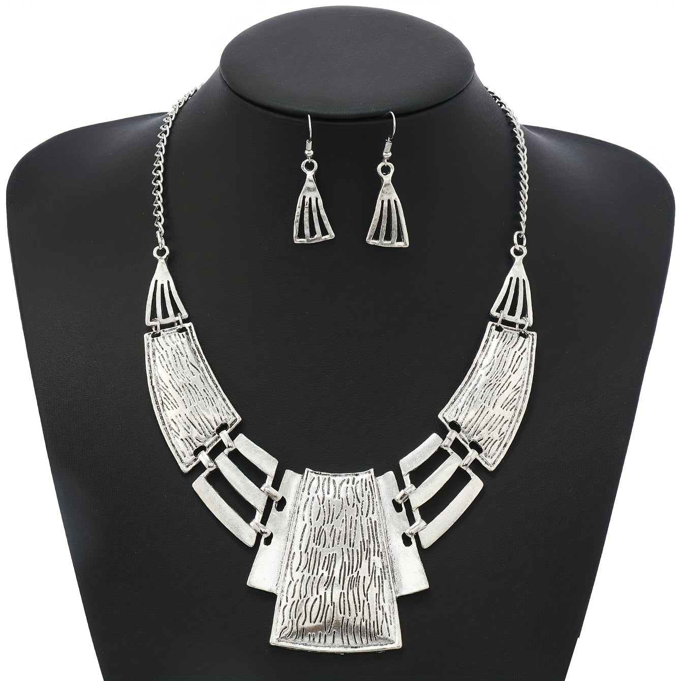 Vintage zargarlik to'plami 3 juft sirg'a va bir marjonni o'z ichiga oladi, geometrik dizayn bilan, kumush yoki oltin ranglarida. O'zingizga mos keladiganini tanlang va ushbu partiya aksessuarlar bilan ajoyib bayonot qiling.