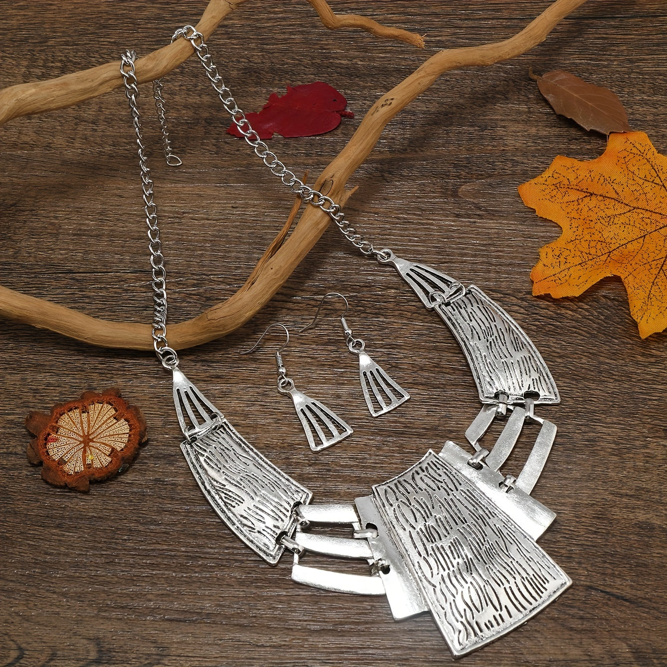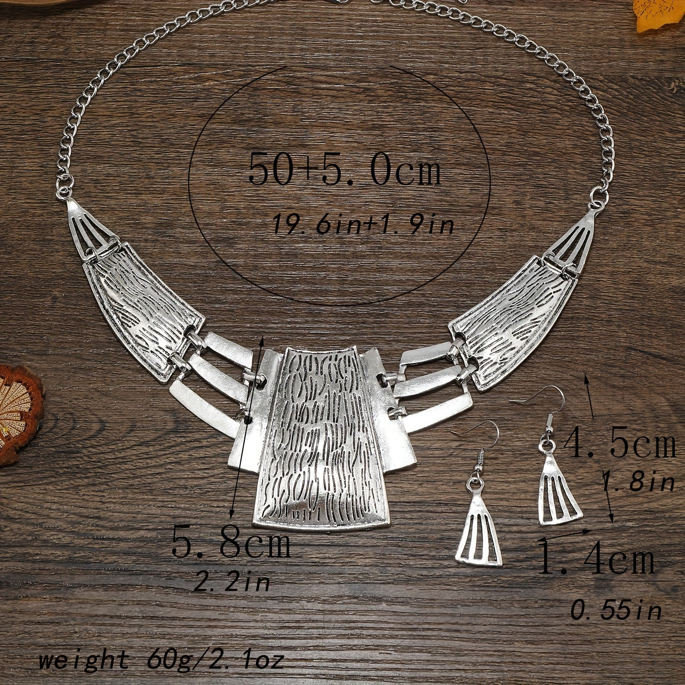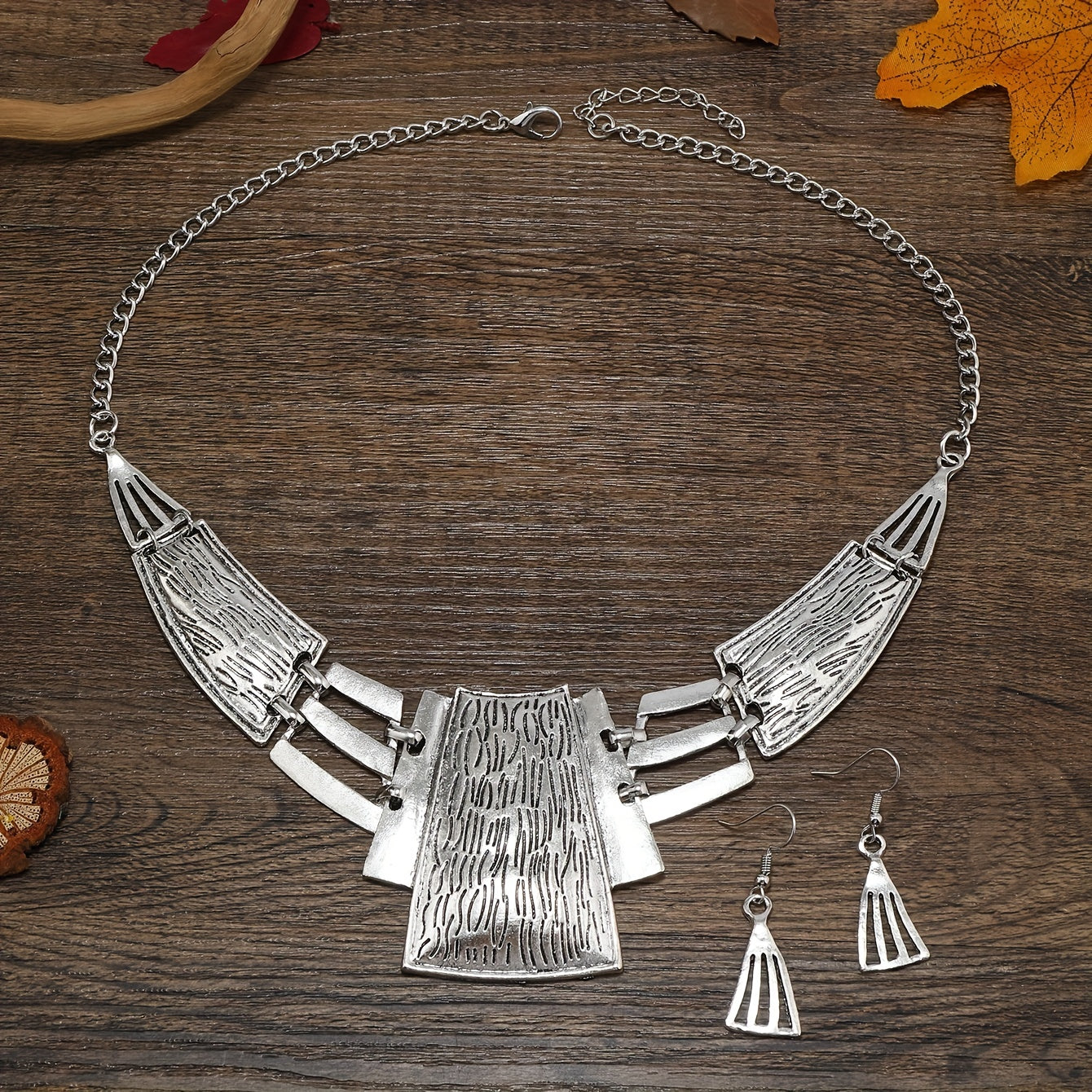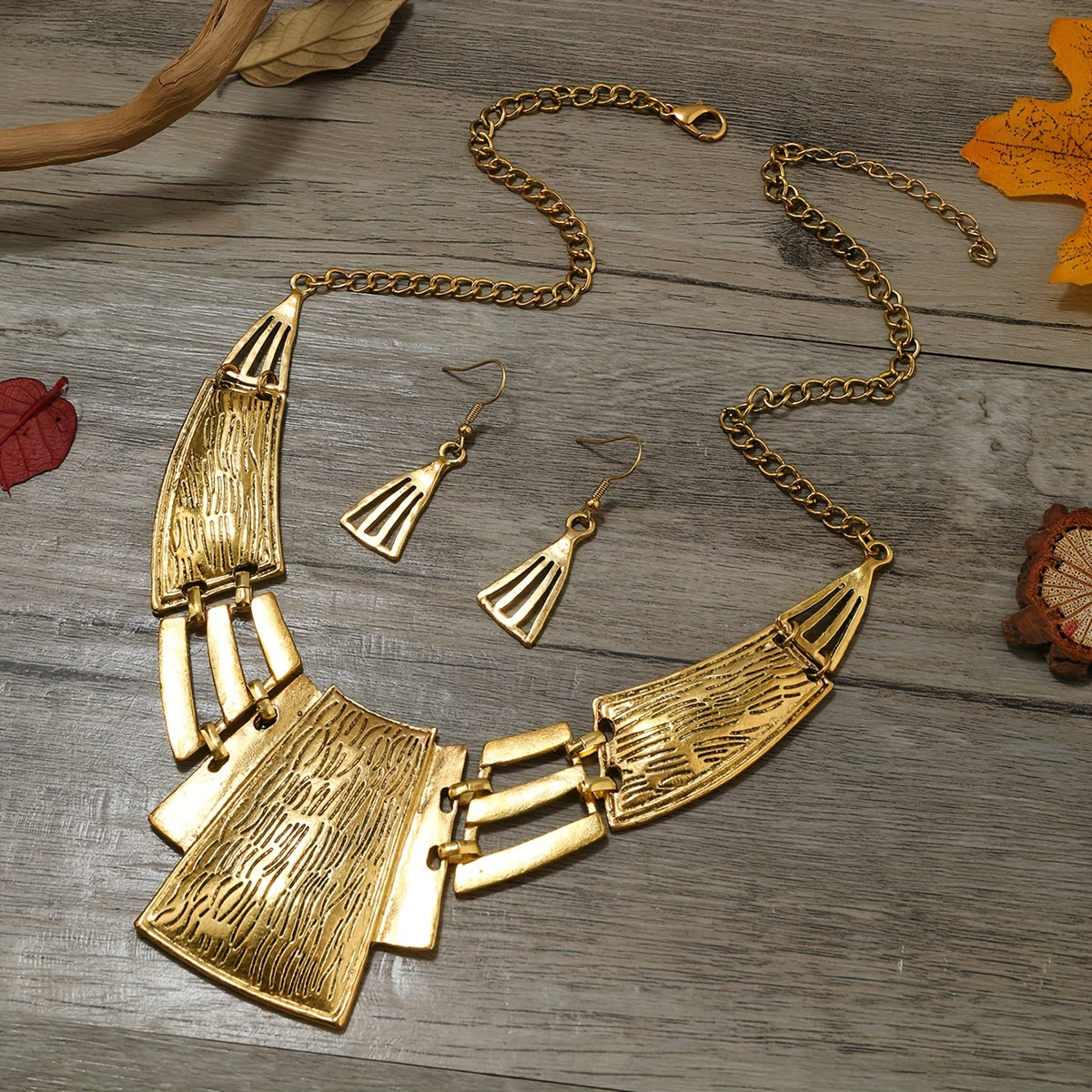 Vintage zargarlik to'plami 3 juft sirg'a va bir marjonni o'z ichiga oladi, geometrik dizayn bilan, kumush yoki oltin ranglarida. O'zingizga mos keladiganini tanlang va ushbu partiya aksessuarlar bilan ajoyib bayonot qiling.