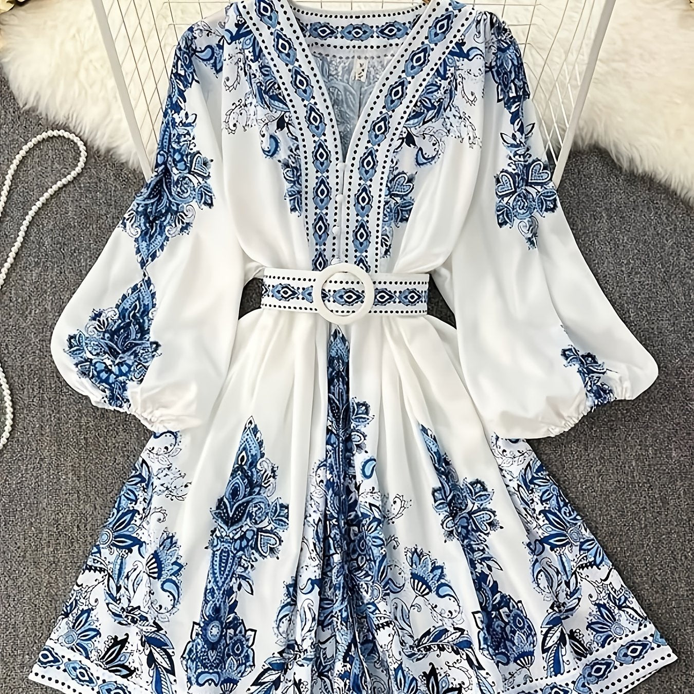 Vintage saroydan ilhomlangan gullar printi, lantern yenglari, A-line silueti, uzun uzunlikdagi V-yuqori ko'ylak - Bahor/Kuz ayollarning modasi, tadbir kiyimi uchun mukammal. | Elastik bo'lmagan mato, Qiziqarli