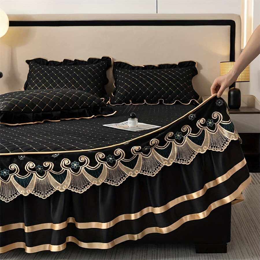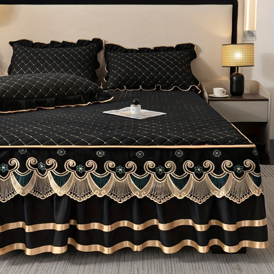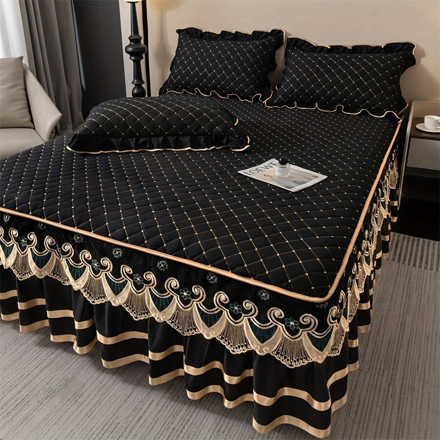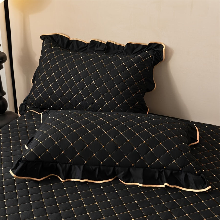 Vintage uslubidagi qora yostiq qopqog'i va yostiq qoplari to'plami - 3 dona, tikilgan dantel trim bilan, qalinlashtirilgan to'shak, mashinada yuvish mumkin, uy va mehmonxona foydalanishi uchun barcha mavsumlar uchun qulay.