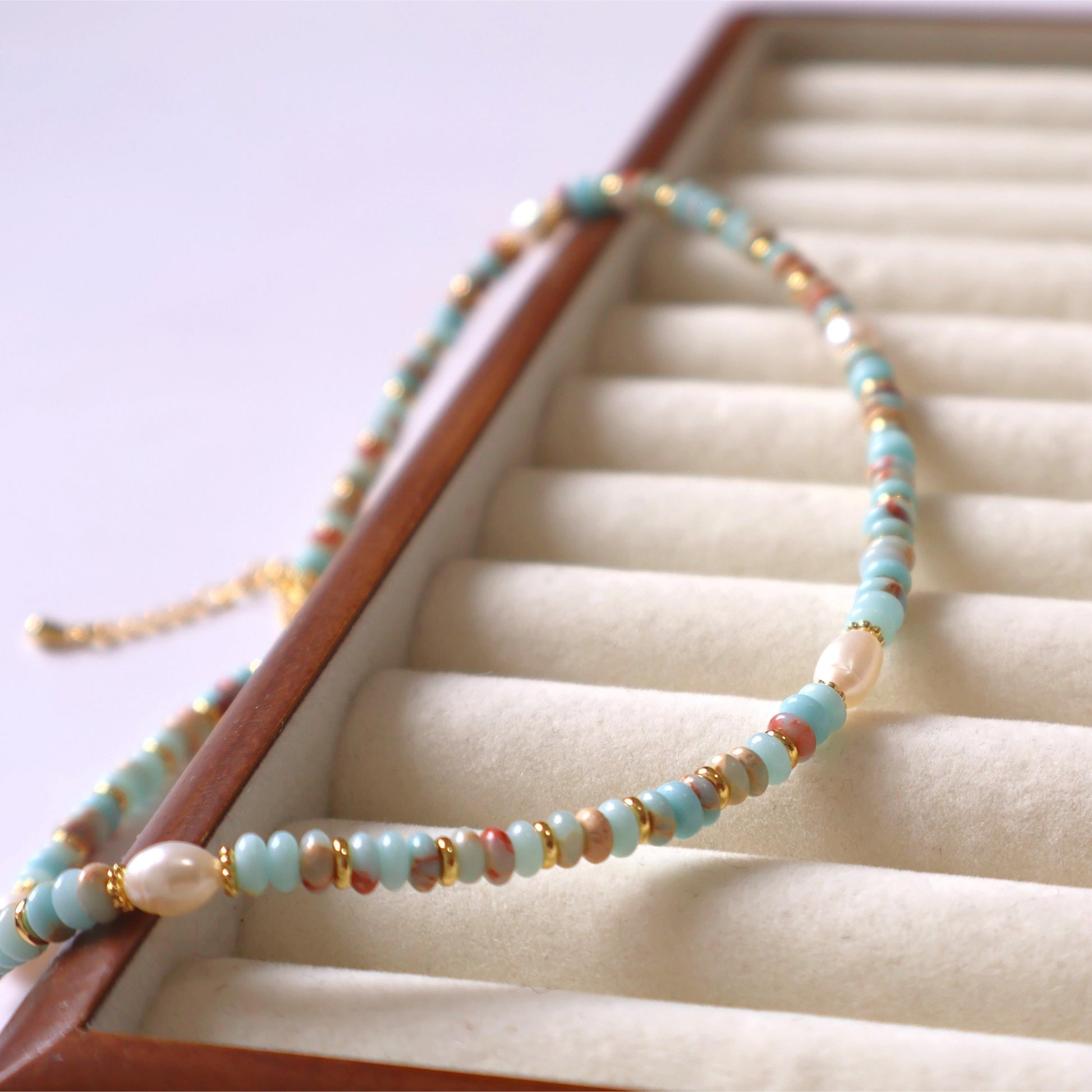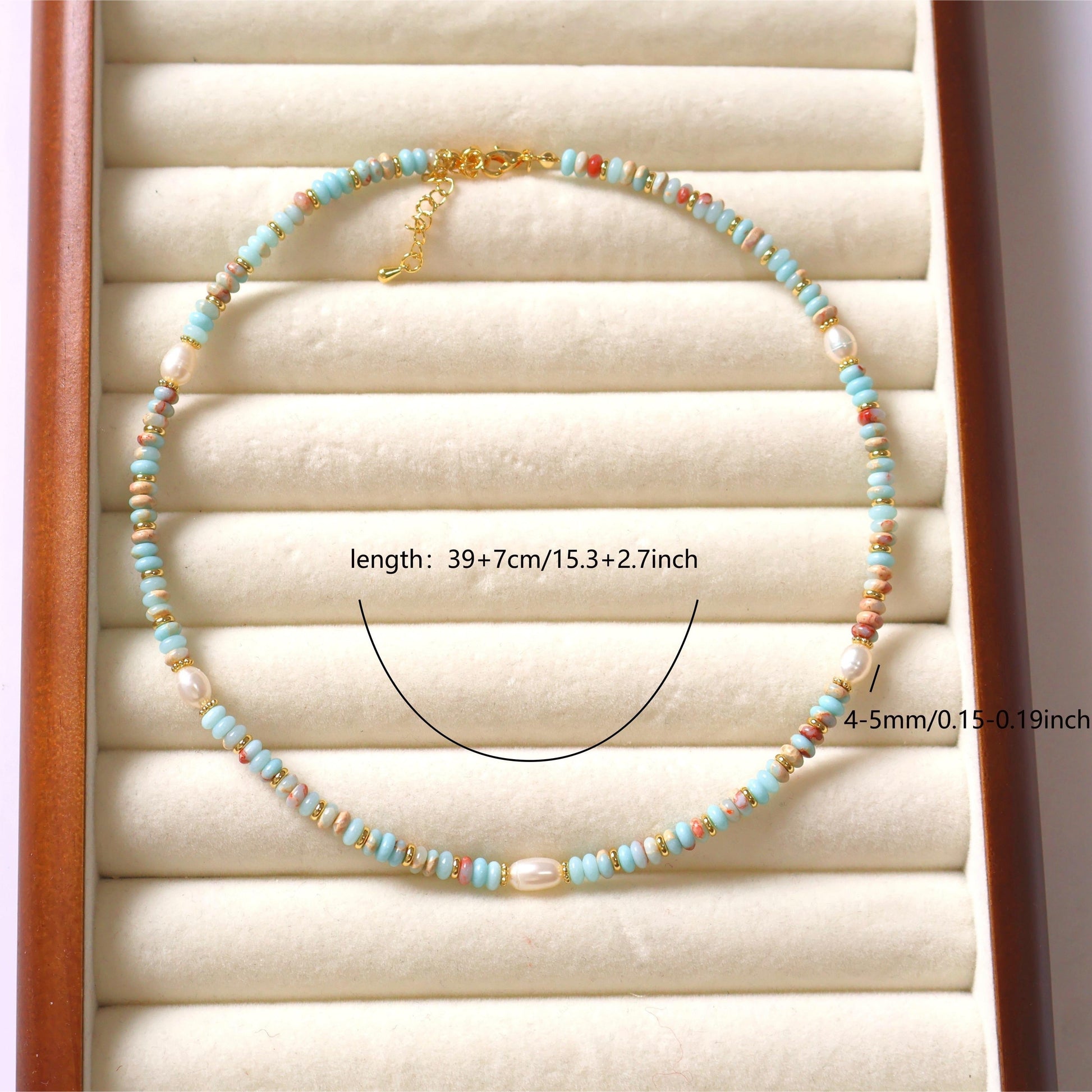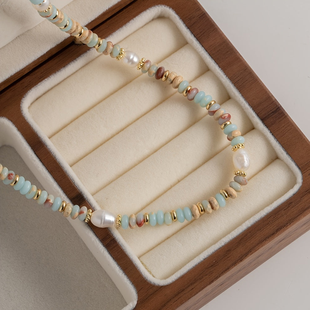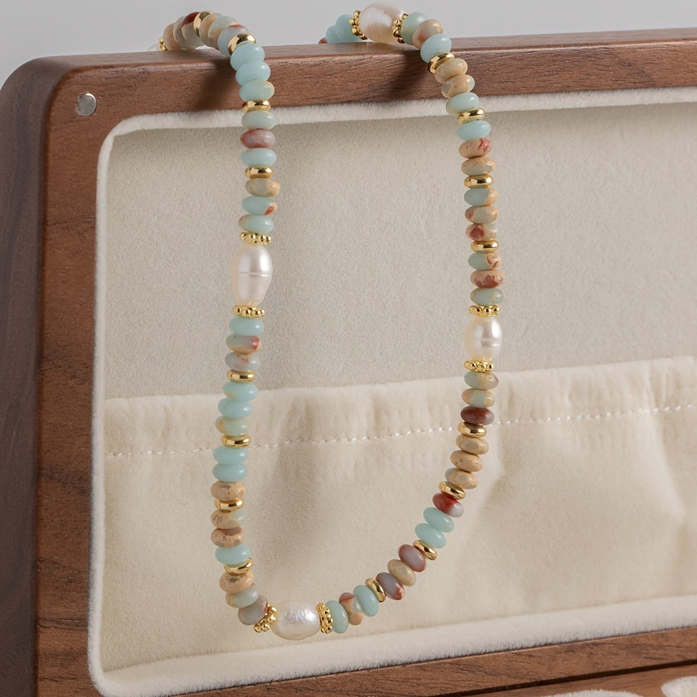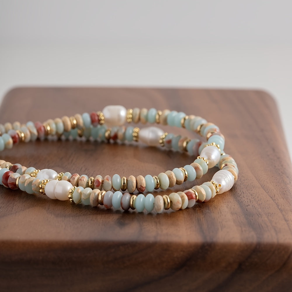 Vintage uslubidagi marjon, boho-chic shirin suv marvaridlari va tabiiy toshlar bilan bezatilgan, tasodifiy kiyimlar uchun yoki o'ylangan sovg'a variantlari sifatida ideal.