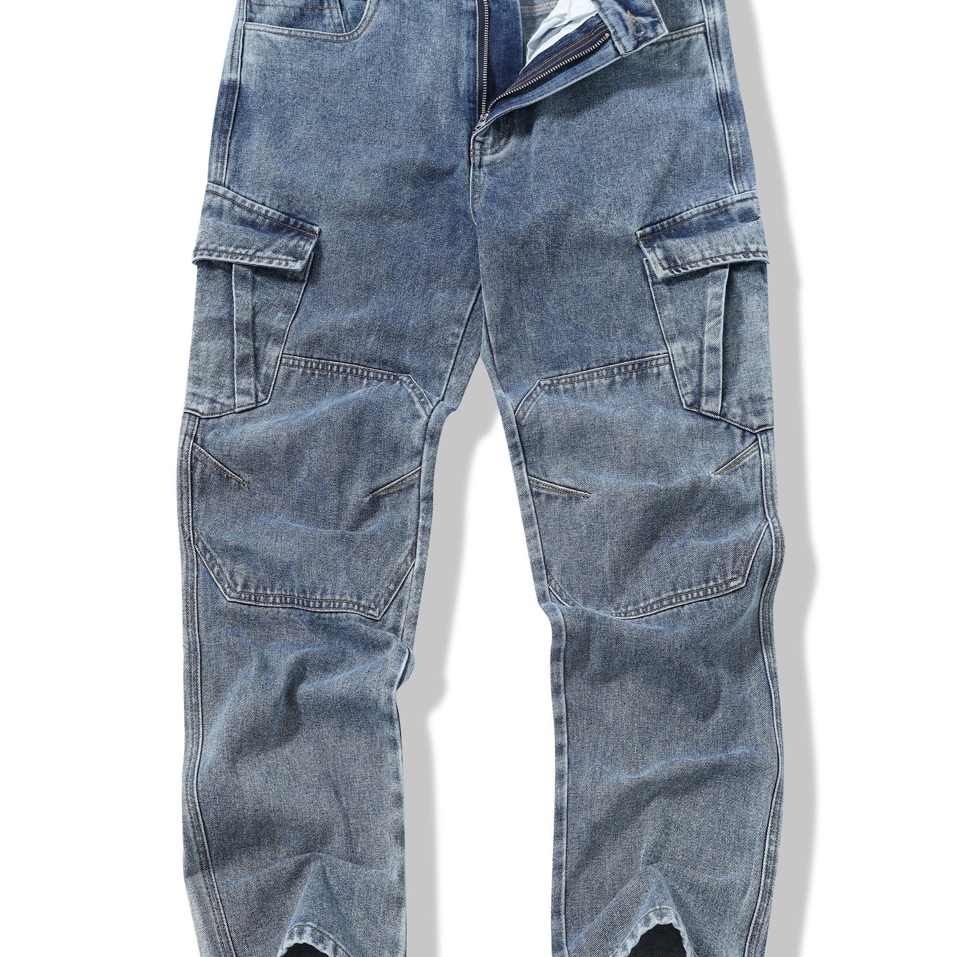 Vintage yuvilgan denim yuk shimlari, keng kesim, o'rta bel elastik bel, ko'p cho'ntakli zip-fly, ko'cha uslubi. Tashqi foydalanish uchun cho'zilmaydigan paxta, polyester, viskoza matosidan tayyorlangan.