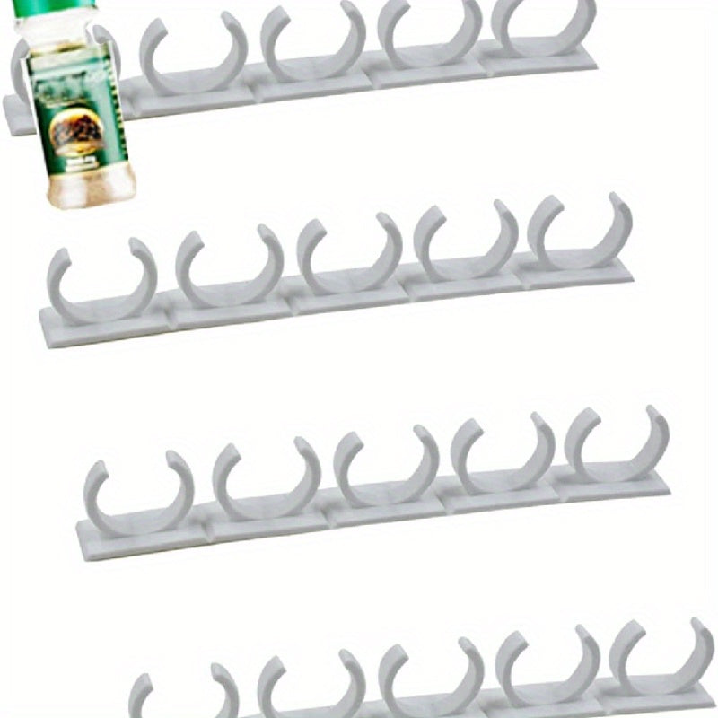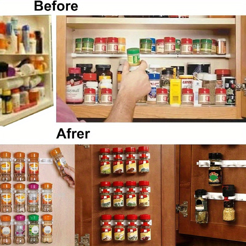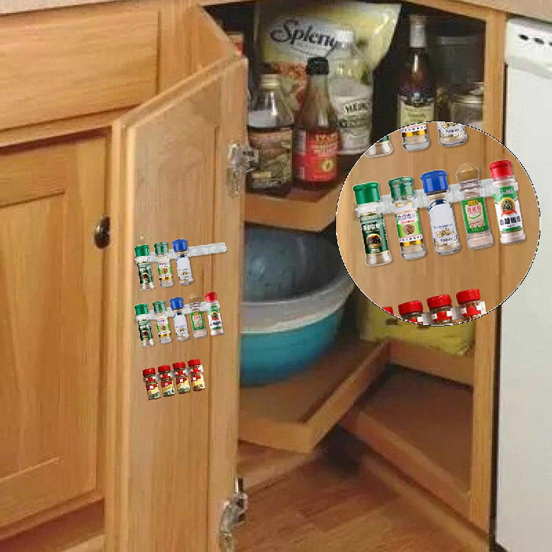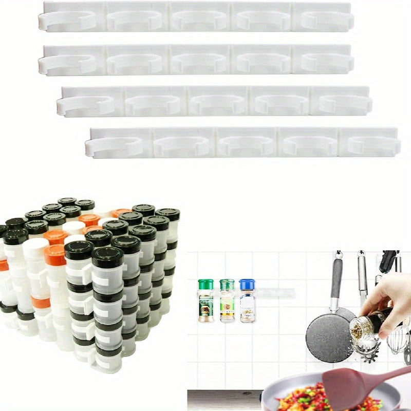 Devorga o'rnatiladigan oshxona ziravorlari idishlari uchun tokcha, 20 ta klipli ziravorlar kliplari bilan. Ushbu saqlash tokchasi 4 dona ziravorlar idishlari va shishalarini ushlab turadi, lentani ishlatib shkaflar yoki eshiklarga o'rnatilishi mumkin.