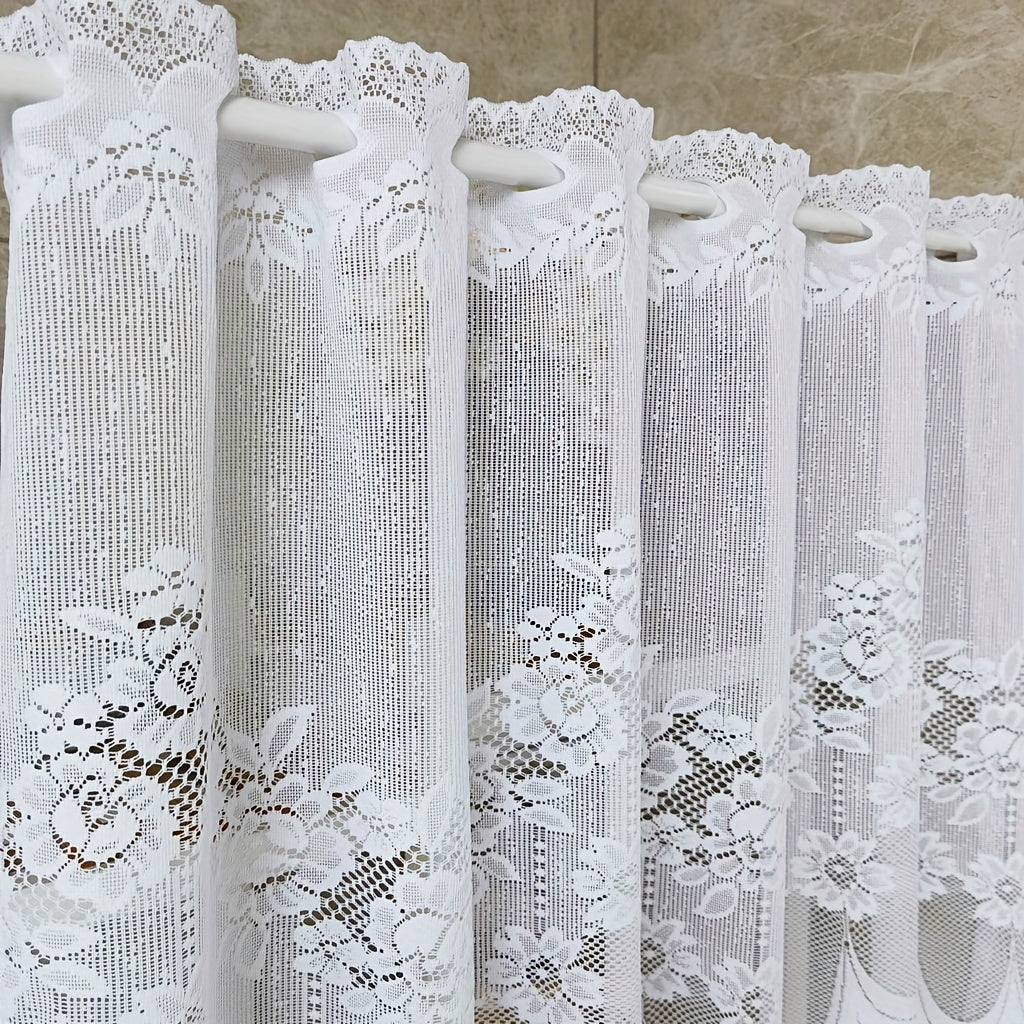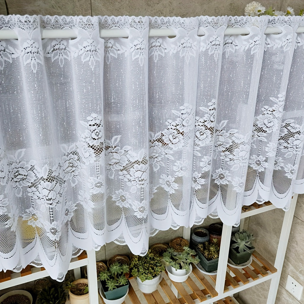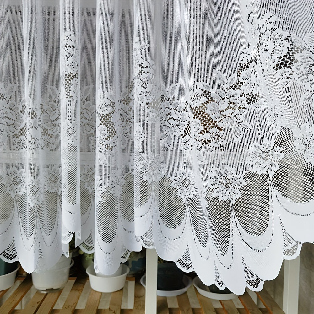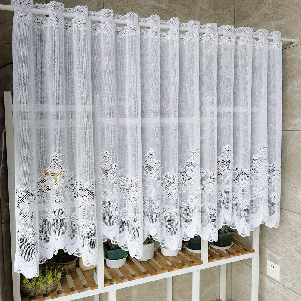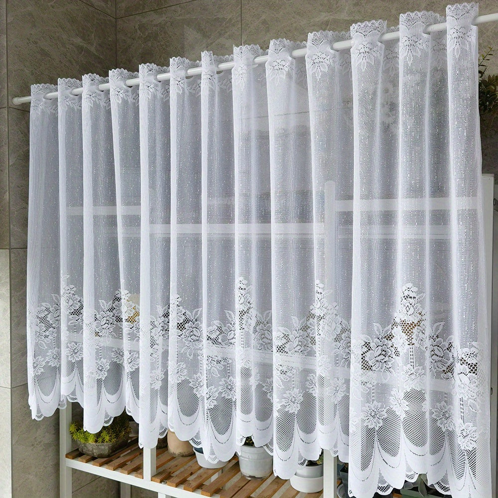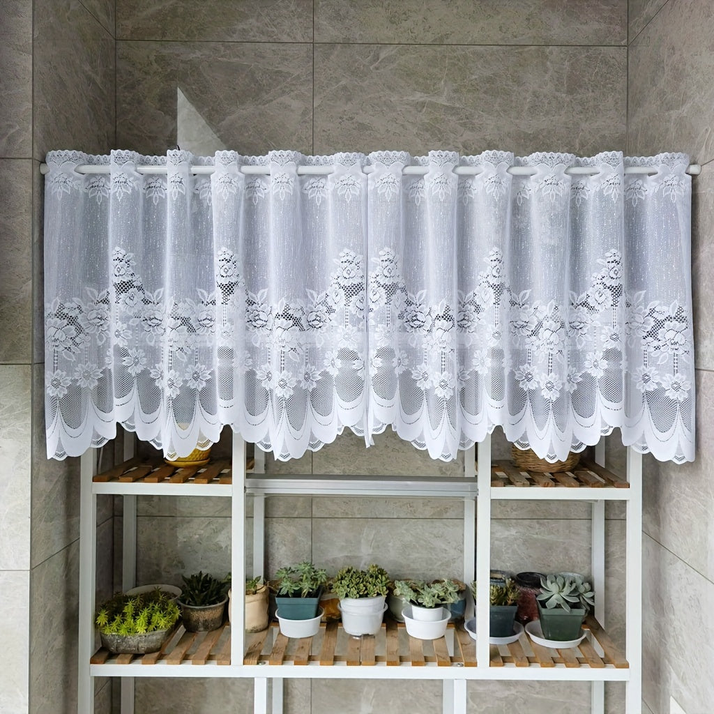 Oq gullar bilan tikilgan dantel parda, rod pocket bilan, oshxona yoki hammom uchun tulle qisqa valans. Kichik derazalar va shkaf qoplamalari uchun mukammal, bu changdan himoyalovchi yarim parda uy dekoringizga nafislik qo'shadi.