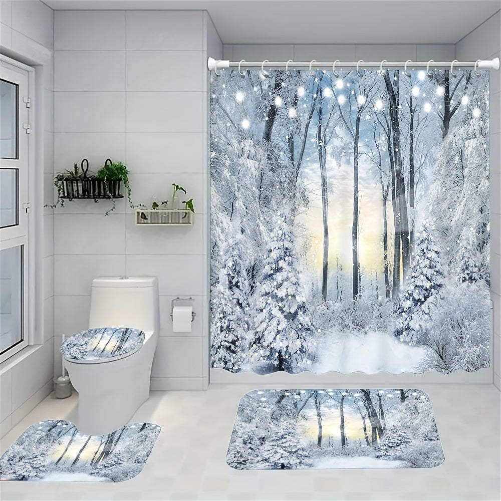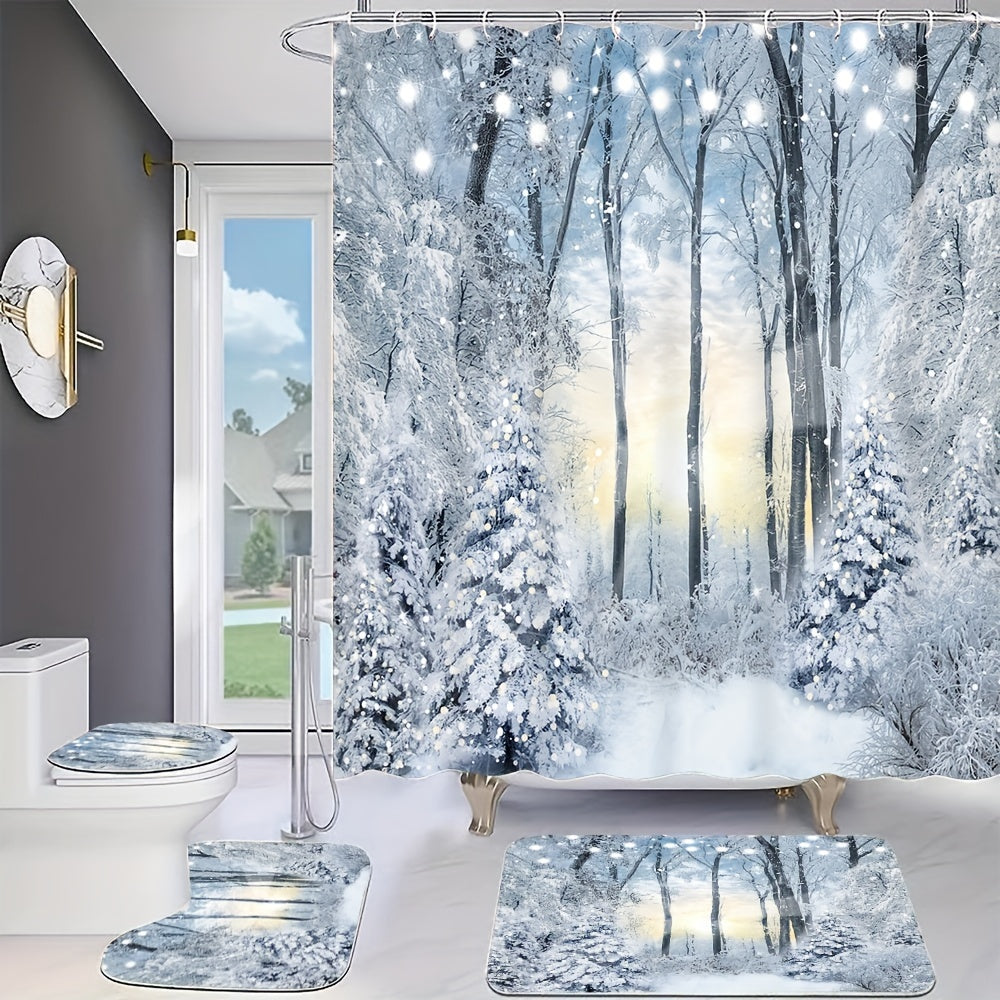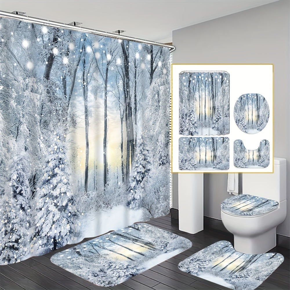 Qishki qor manzarali dush pardasi to'plami suv o'tkazmaydigan parda, pol matosi, hojatxona o'rnini qoplovchi, hammom matosi, 12 plastik ilgak va uy bezaklarini o'z ichiga oladi.