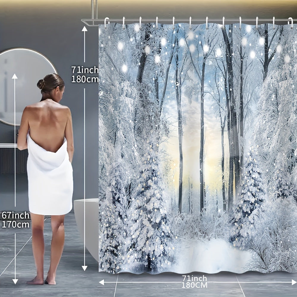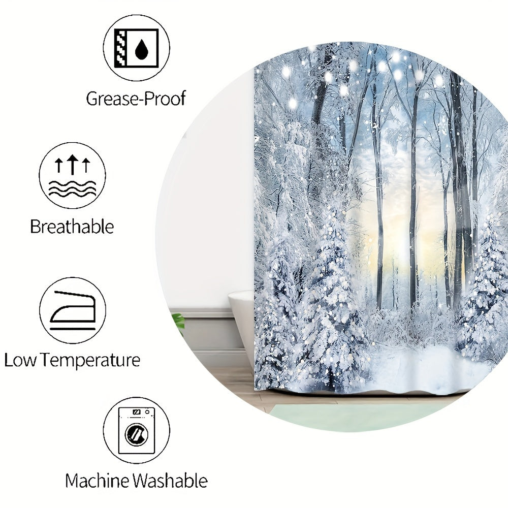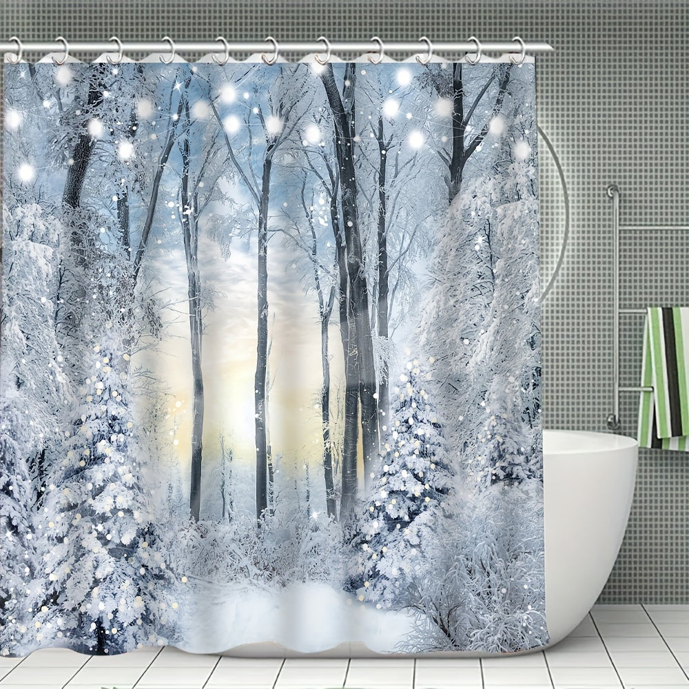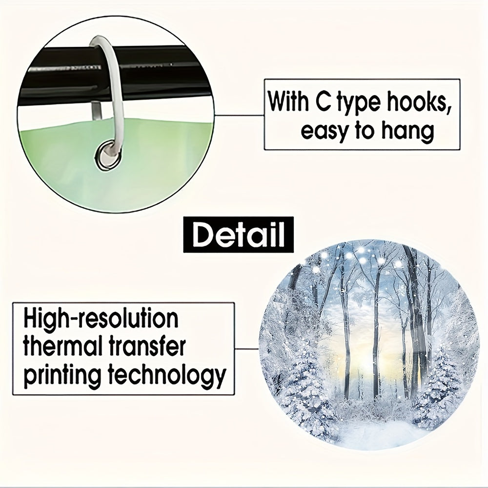Qishki qor manzarali dush pardasi to'plami suv o'tkazmaydigan parda, pol matosi, hojatxona o'rnini qoplovchi, hammom matosi, 12 plastik ilgak va uy bezaklarini o'z ichiga oladi.