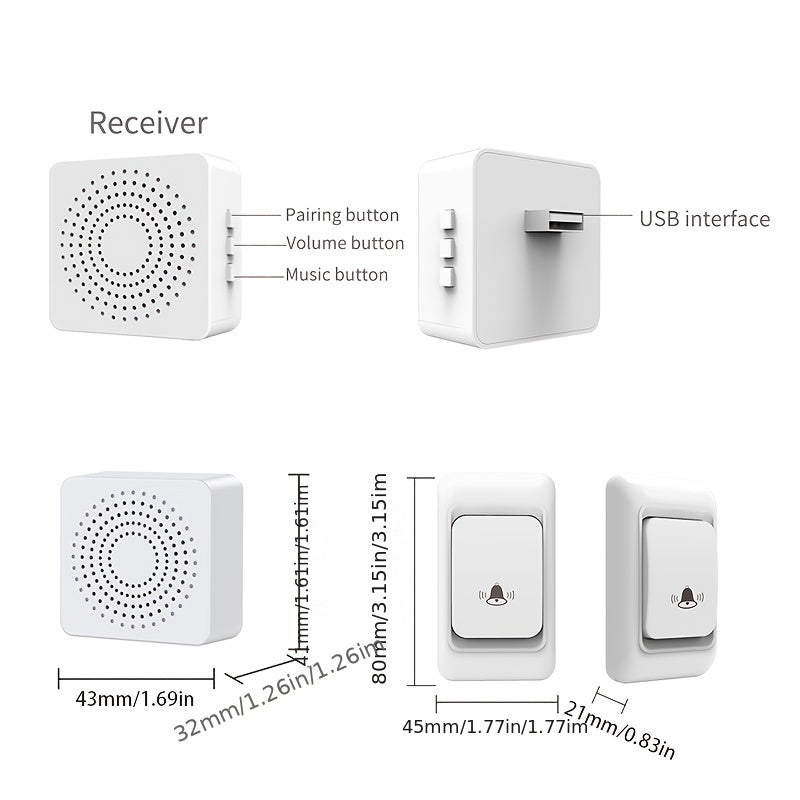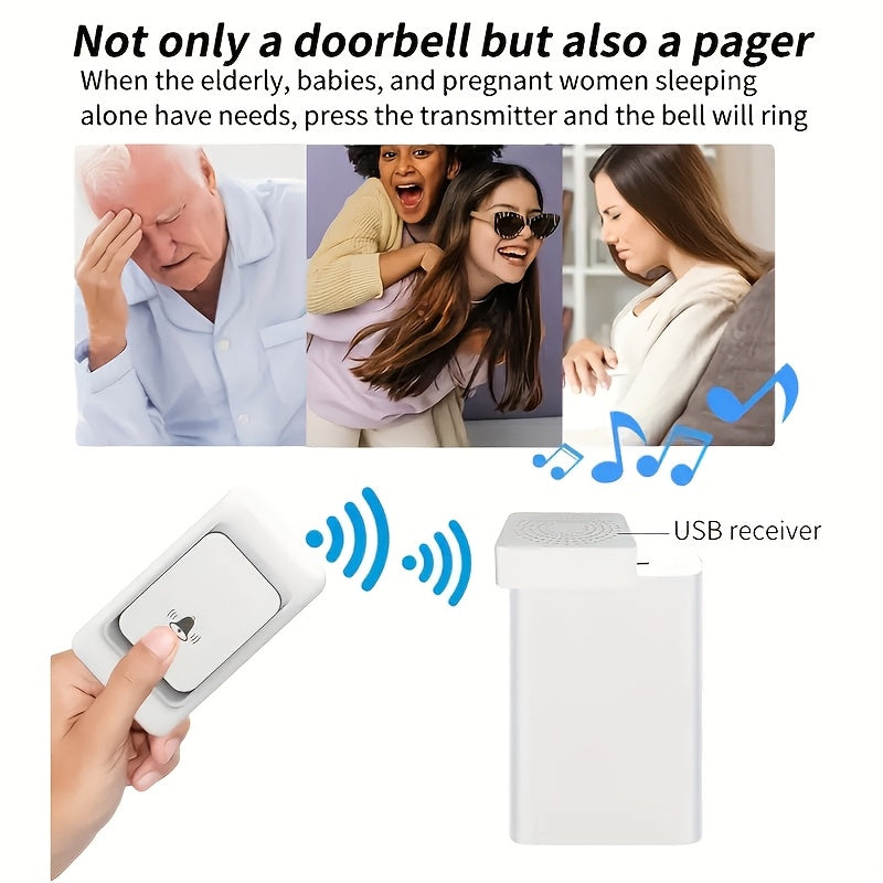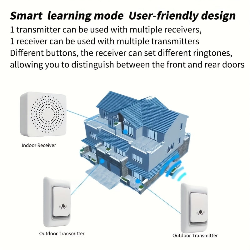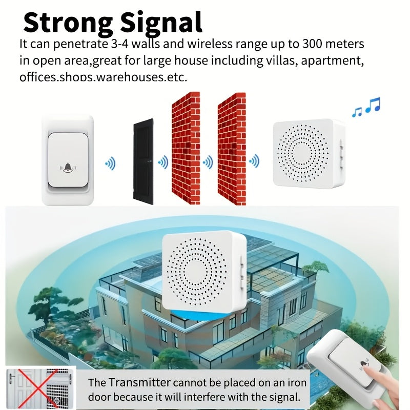 Simsiz eshik qo'ng'irog'i, 38 ta qo'ng'iroq melodiyalari, qayta zaryadlanadigan, uzoq masofali masofadan boshqarish va uy xavfsizligi uchun devorga o'rnatish.