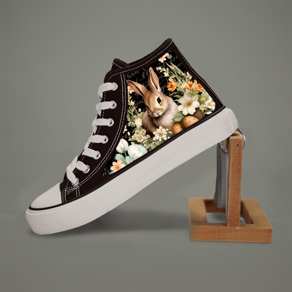 Women High-Top Canvas Sneakers With Bunny Floral Print Casual Skate Shoes Black