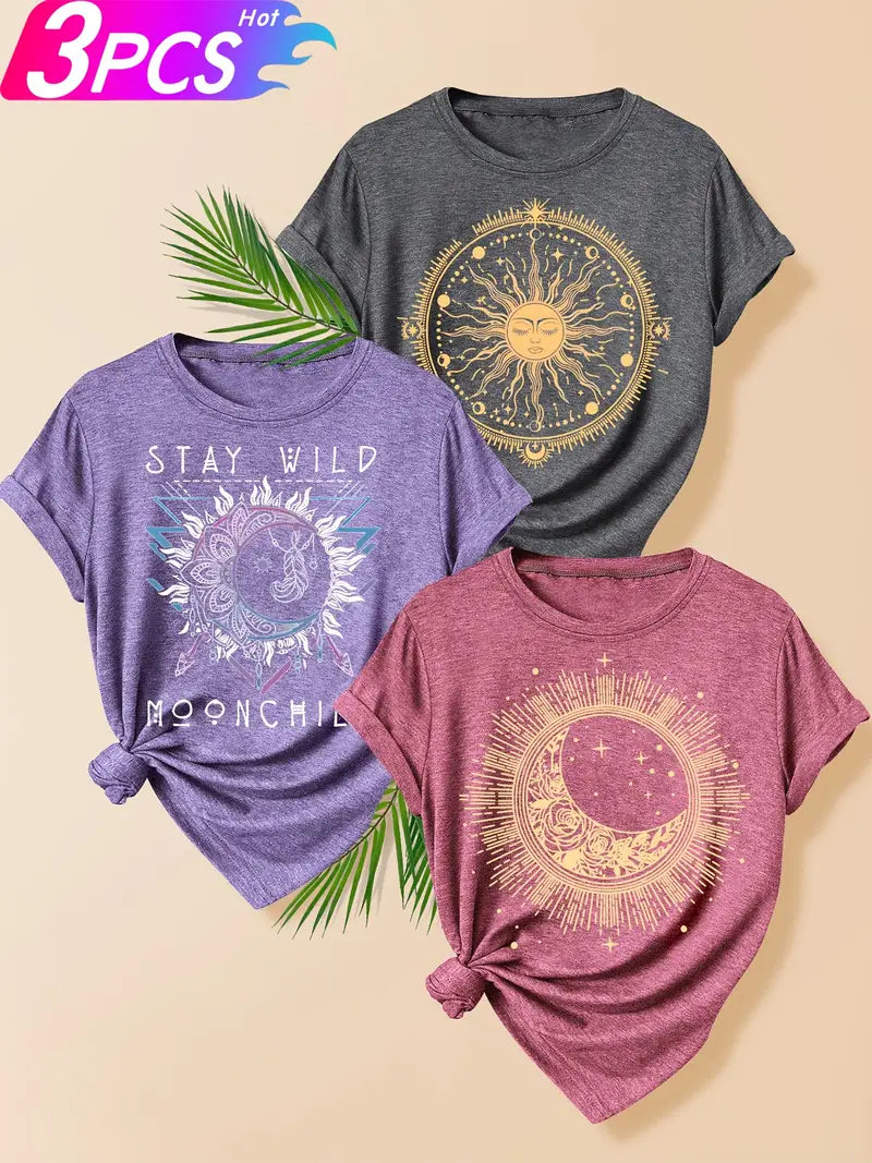 Women's 3 Pack Vintage-Inspired Sun & Moon Graphic T-Shirts Short Sleeve Polyester Blend