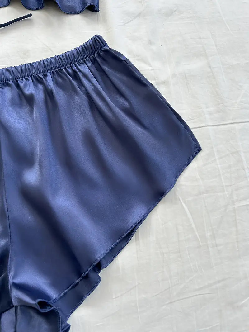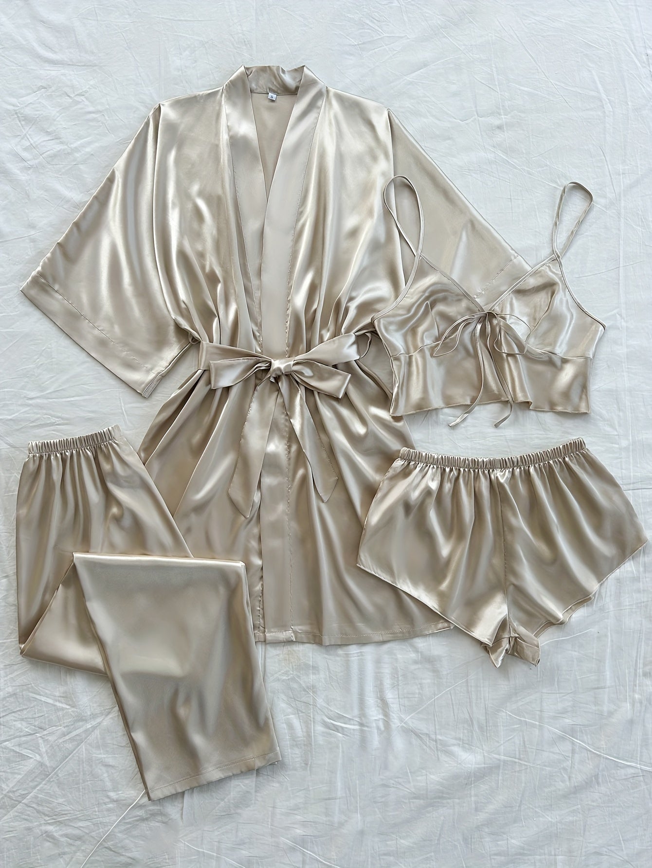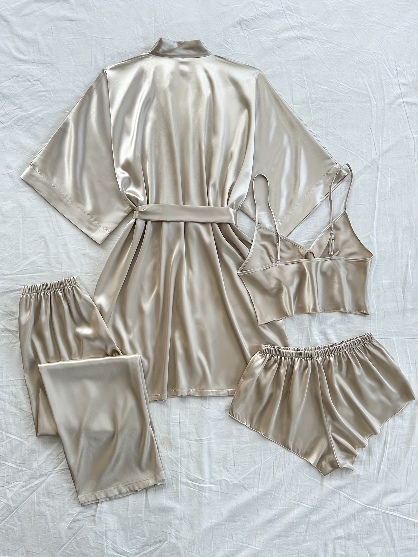 Ayollar uchun 4 qismli saten pijama to'plami V-shaklidagi robe, ichki kiyim, shorti va uzun shimlardan iborat, bitta rangda. Har mavsumda qulay to'qilgan polyesterdan tayyorlangan.