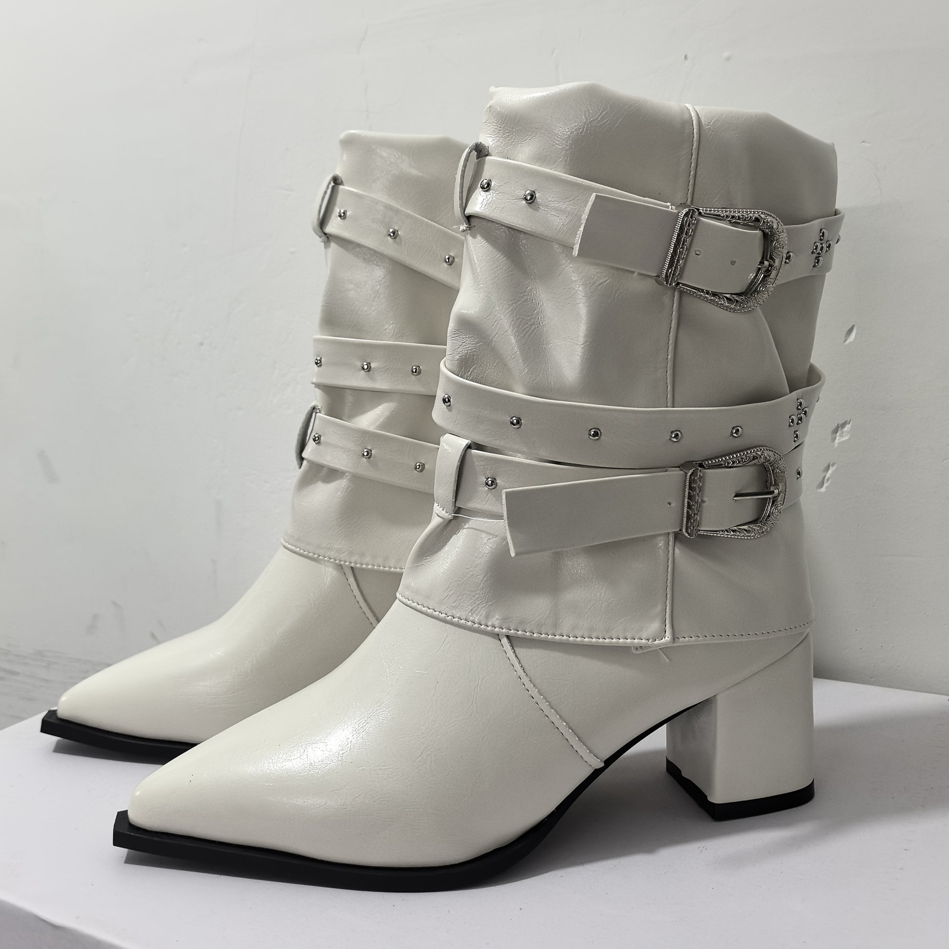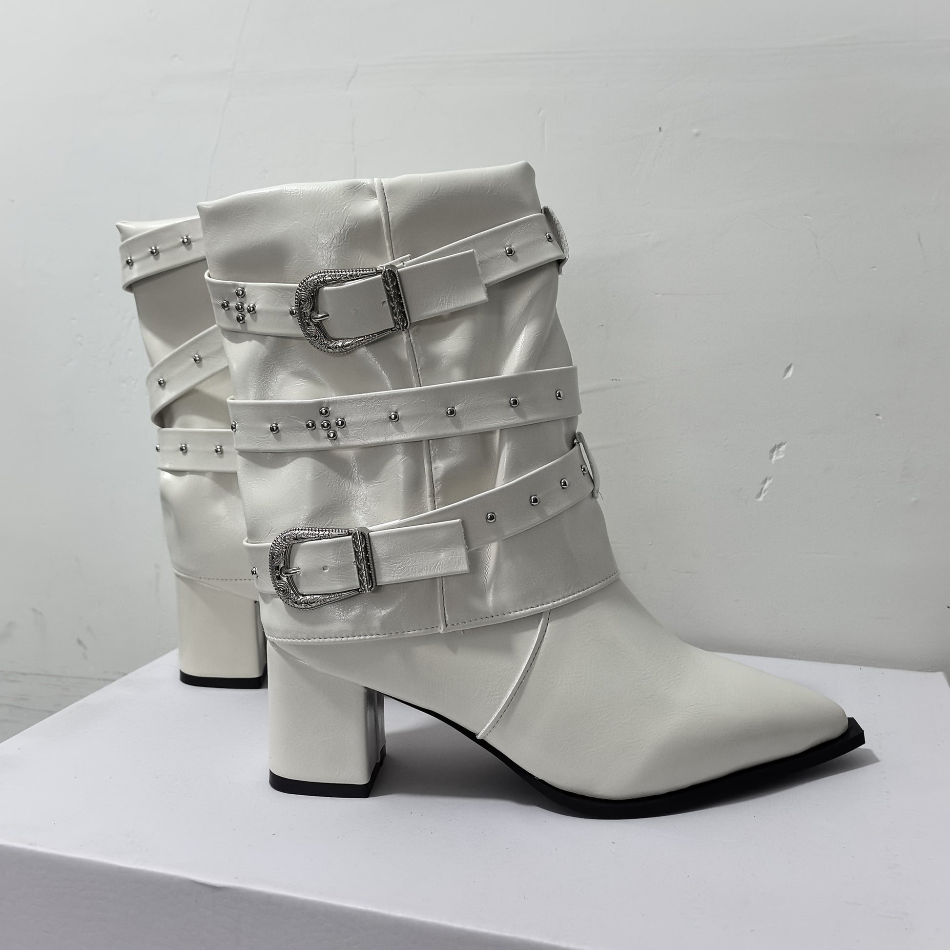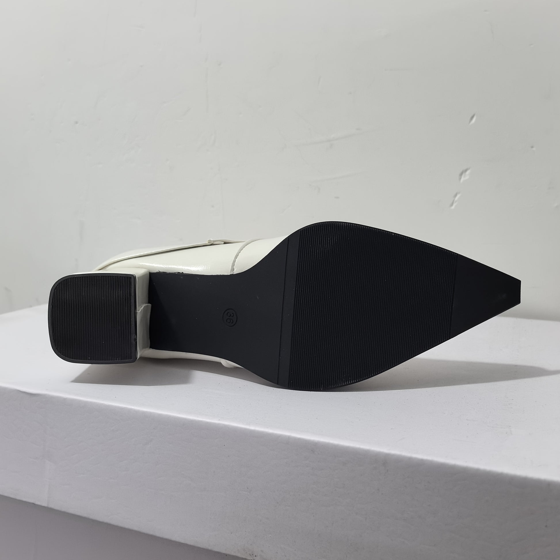 Ayollar uchun tizzaga qadar bo‘lgan poyabzal, o‘rta balandlikdagi taglik, charm, osongina kiyinadigan, burunlari burama, oq, bardoshli