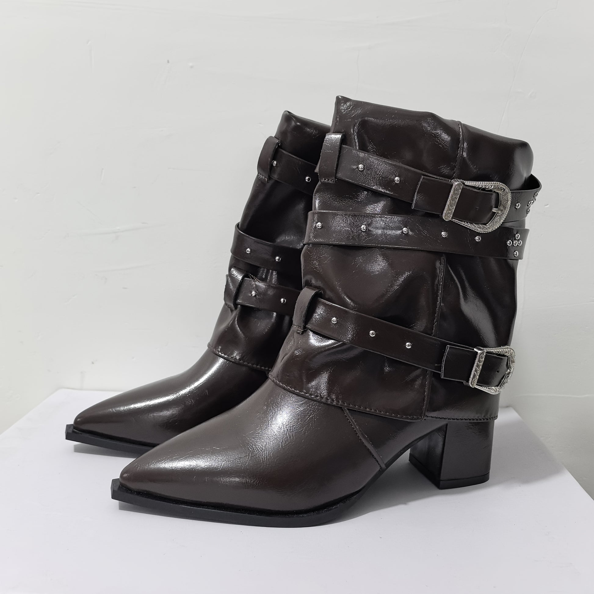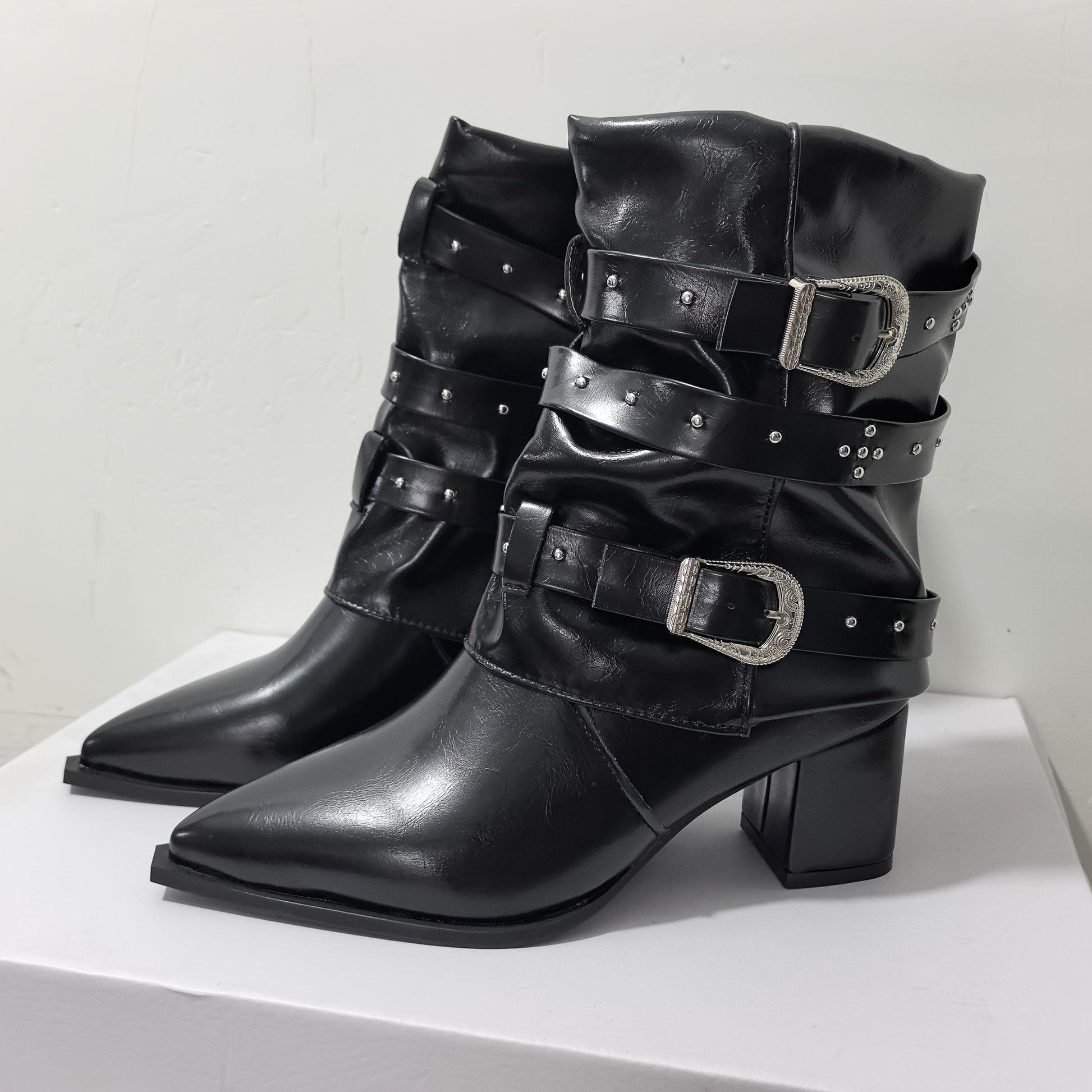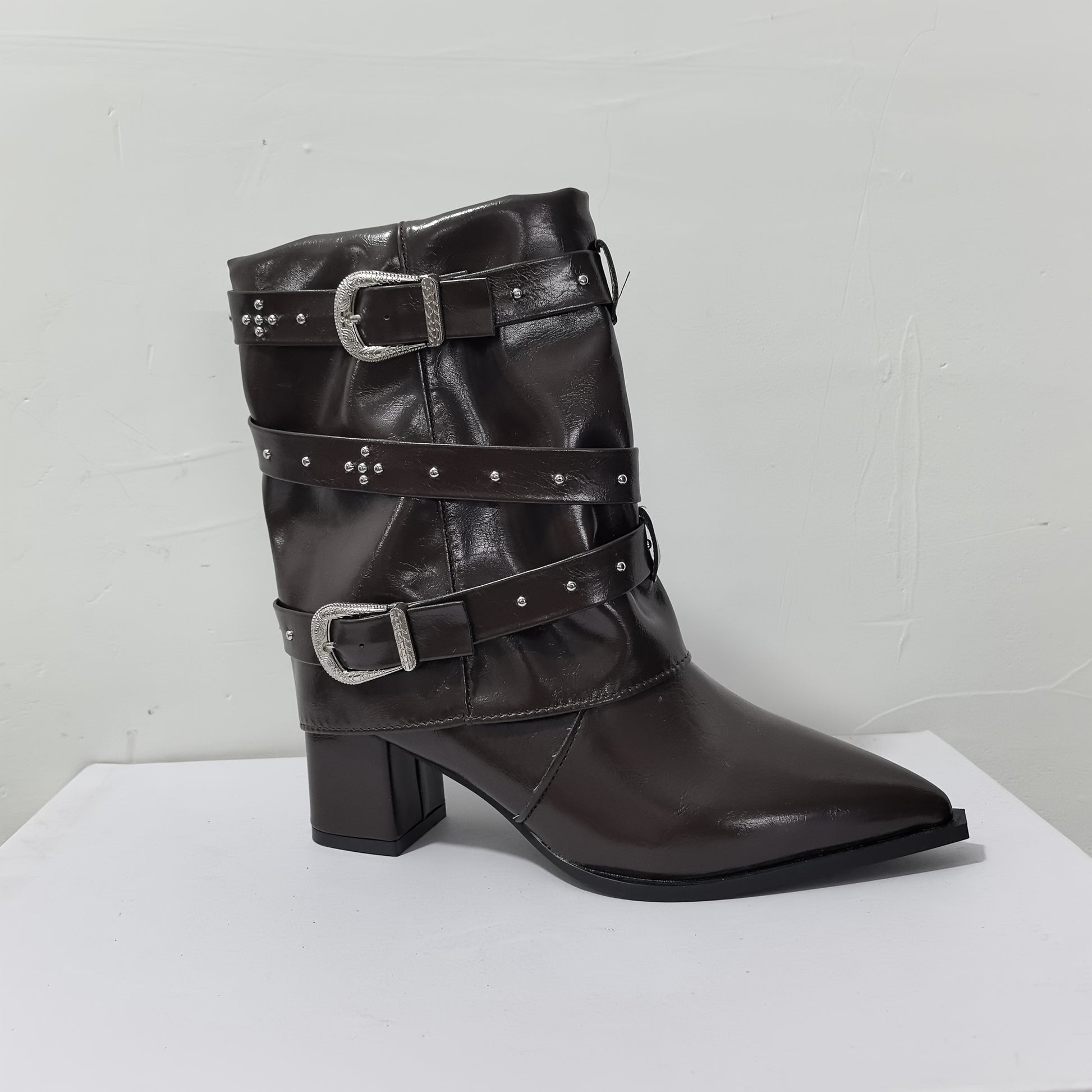 Ayollar uchun tizzaga qadar bo‘lgan poyabzal, o‘rta balandlikdagi taglik, charm, osongina kiyinadigan, burunlari burama, oq, bardoshli