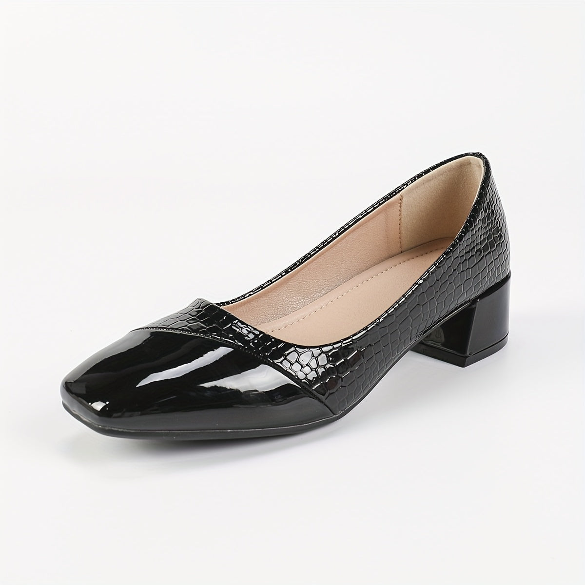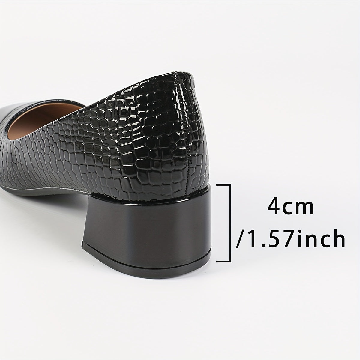Ayollar uchun qora yaltiroq Mary Jane poyabzali, qalin o'rta balandlikdagi poyabzal va kvadrat barmoqli