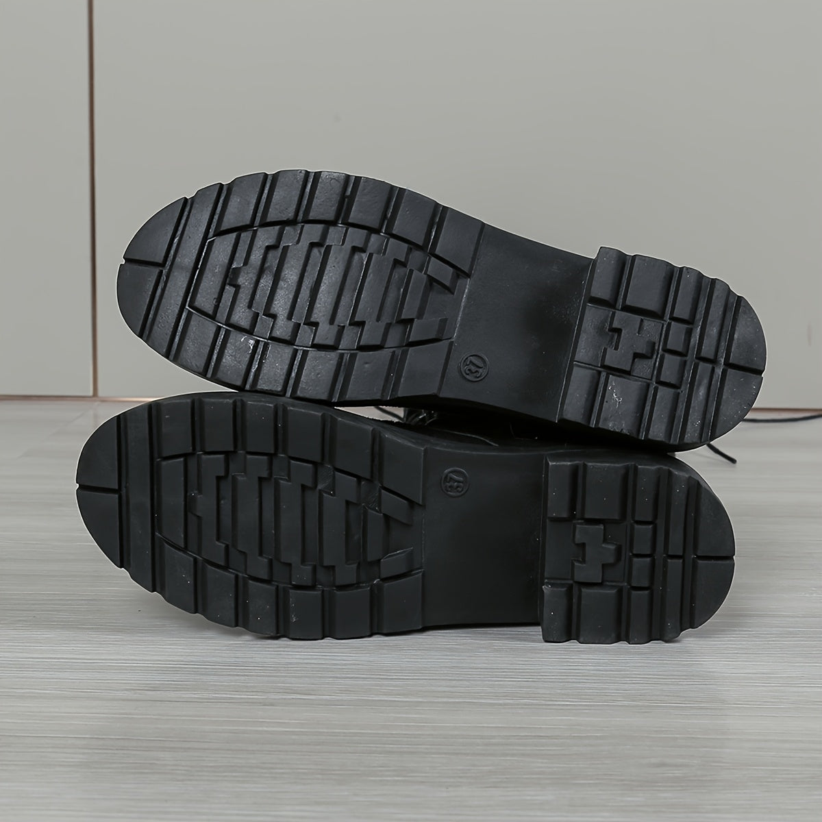 Ayollar uchun qora o'rta uzunlikdagi qoq-qoq botlar, lacing, zip, qalin poyabzal, dumaloq barmoqli