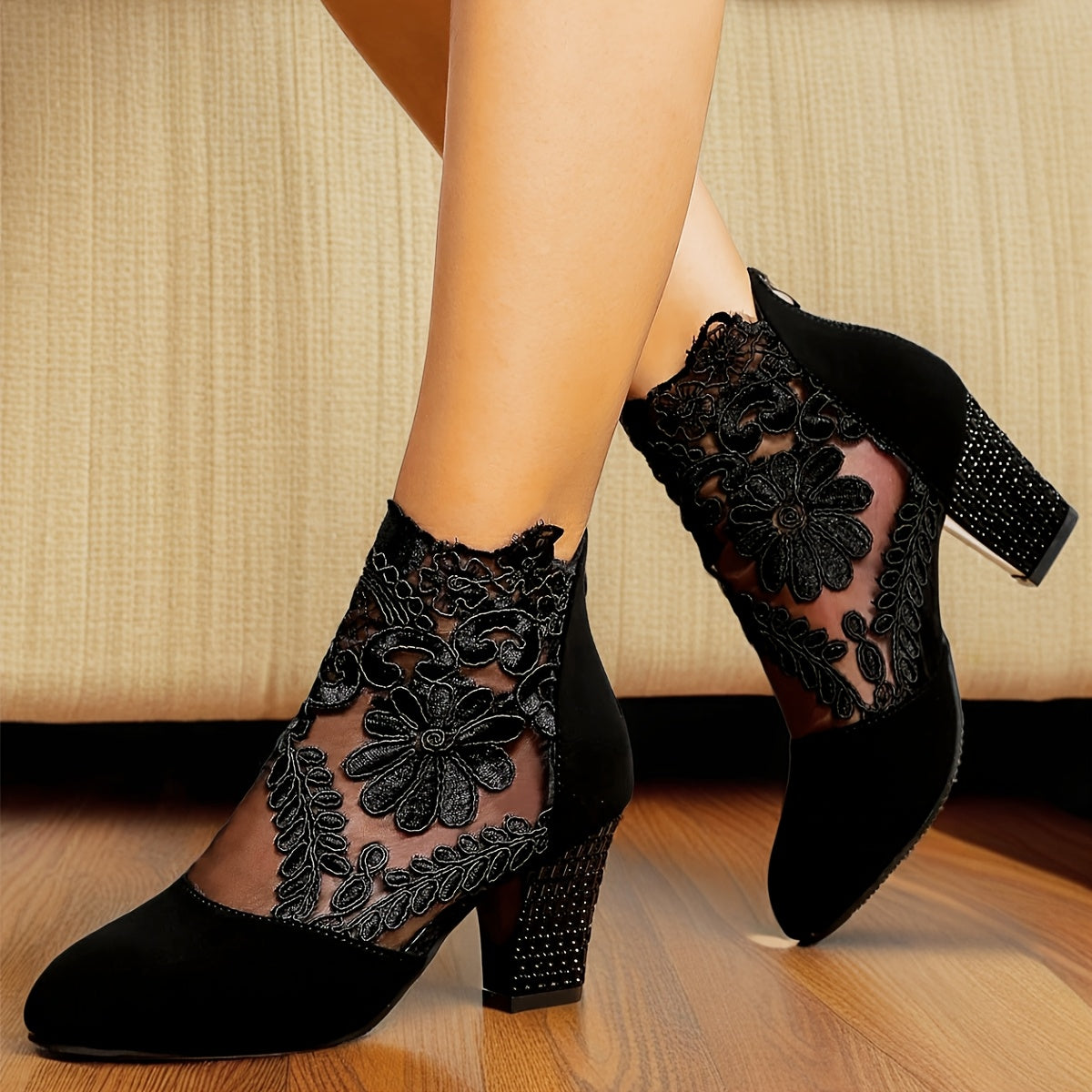 Ayollar uchun qora toʻqilgan qoqil va tikanli poyabzal, gul naqshli tikuv va tarmoq panellar bilan