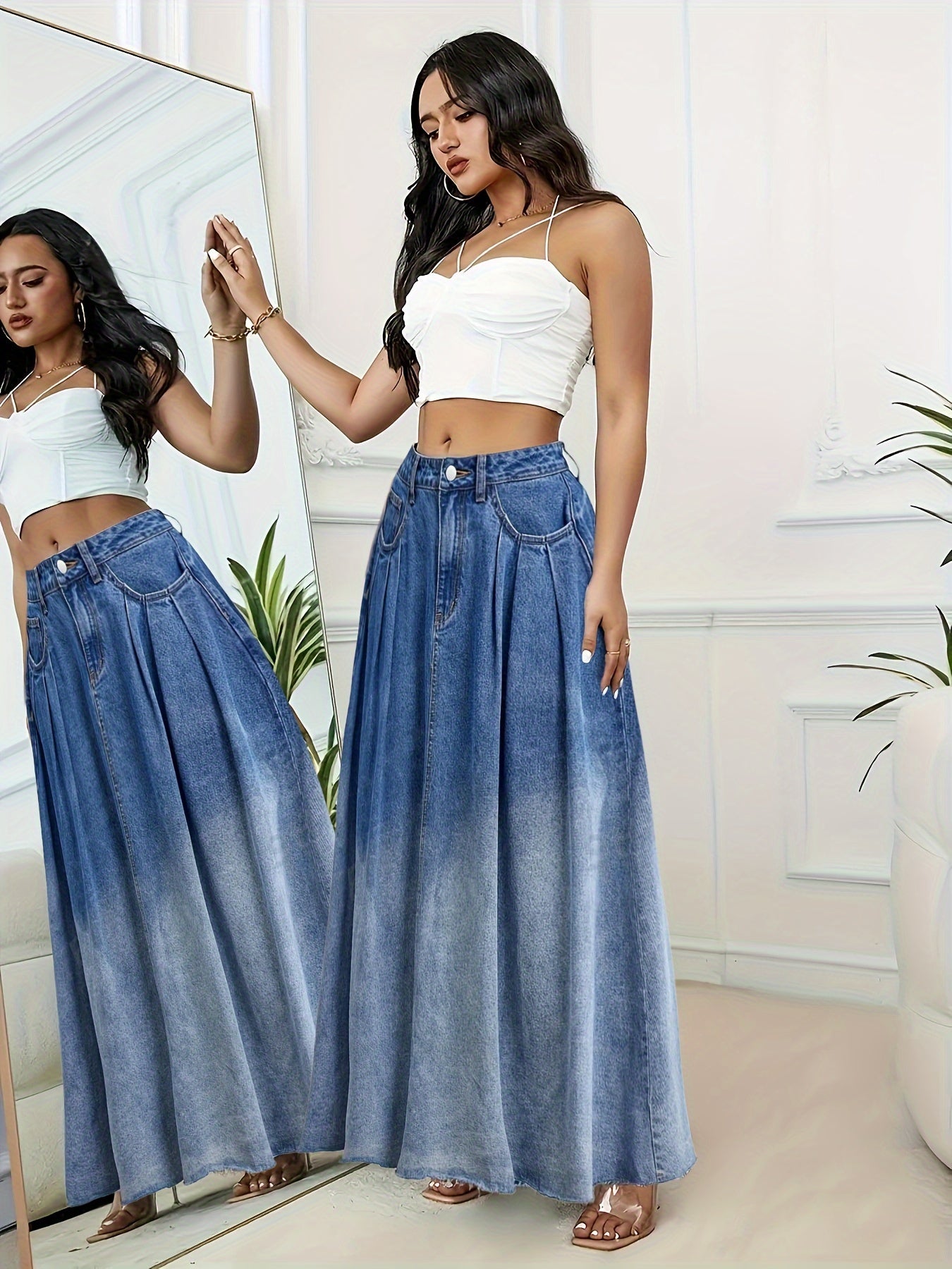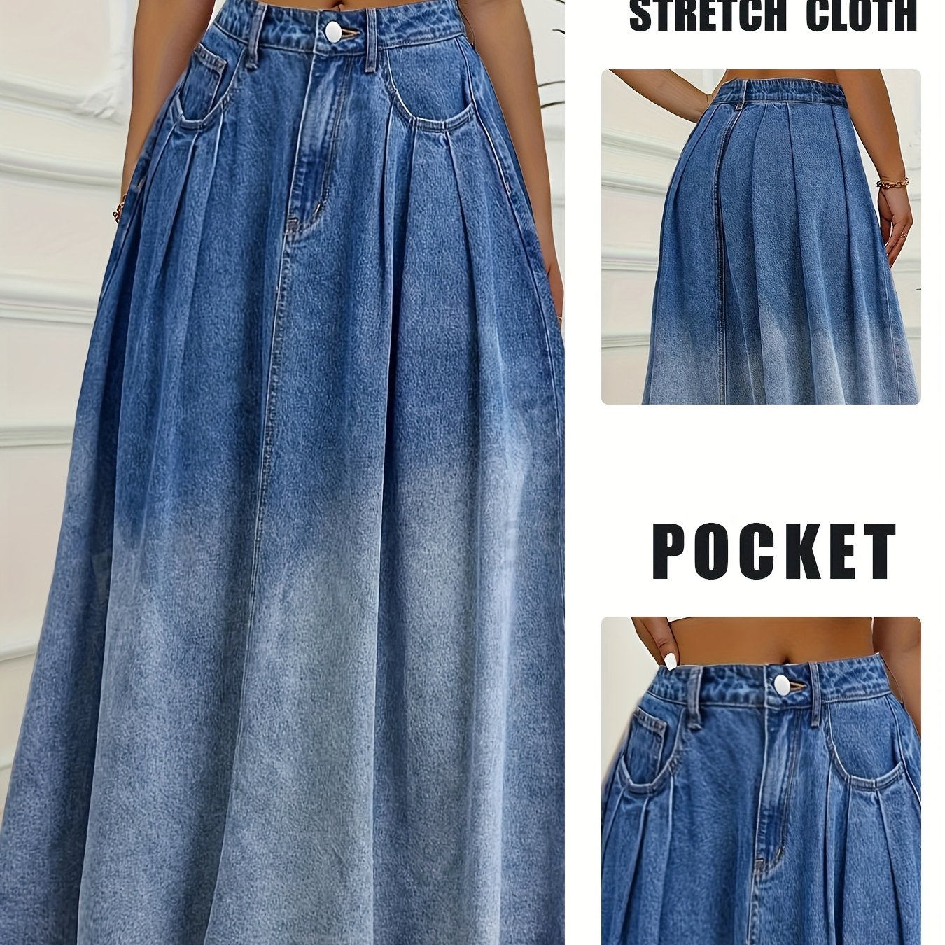 Ayollar uchun ko‘k denim maksi yubka, pletlar va xom bo‘lak bilan