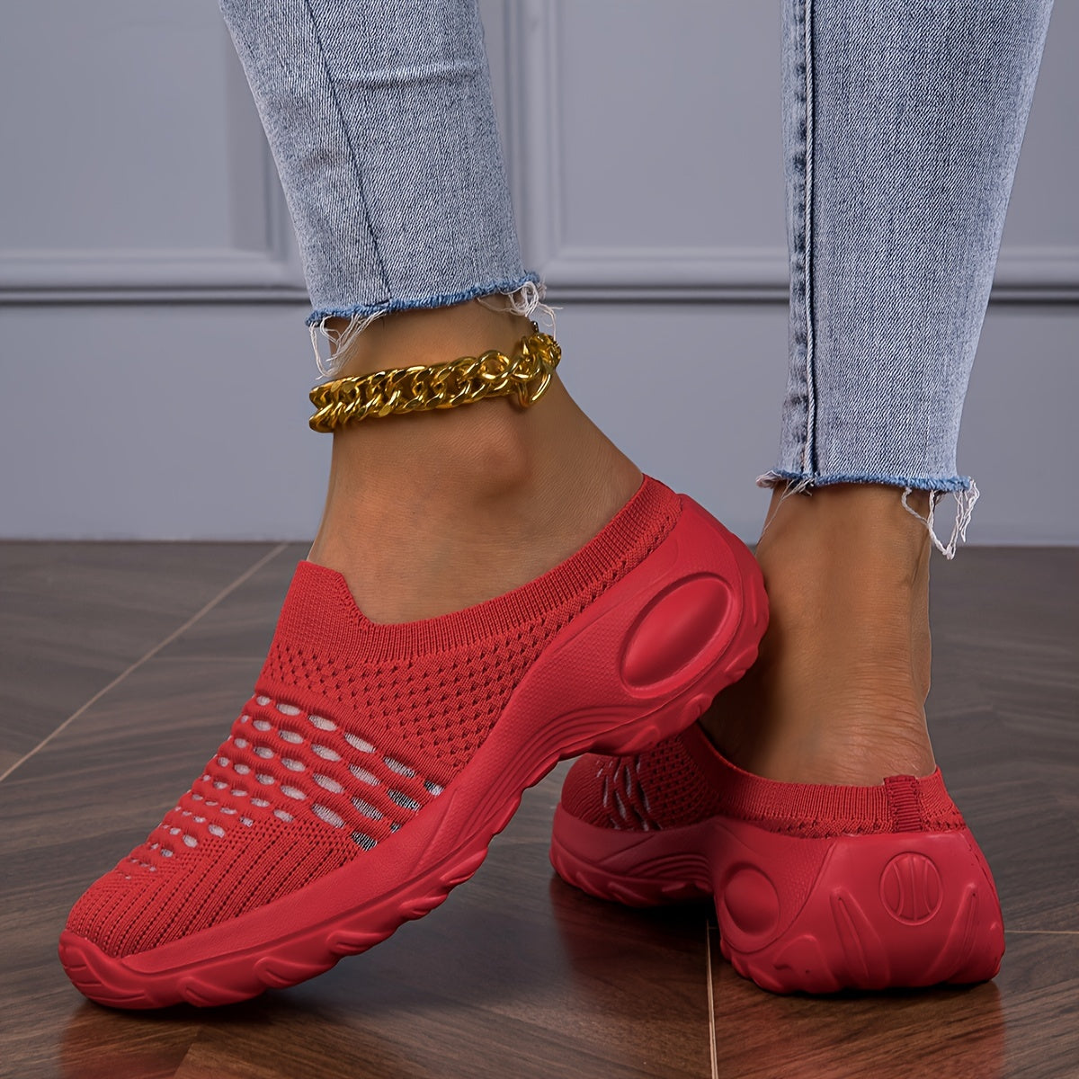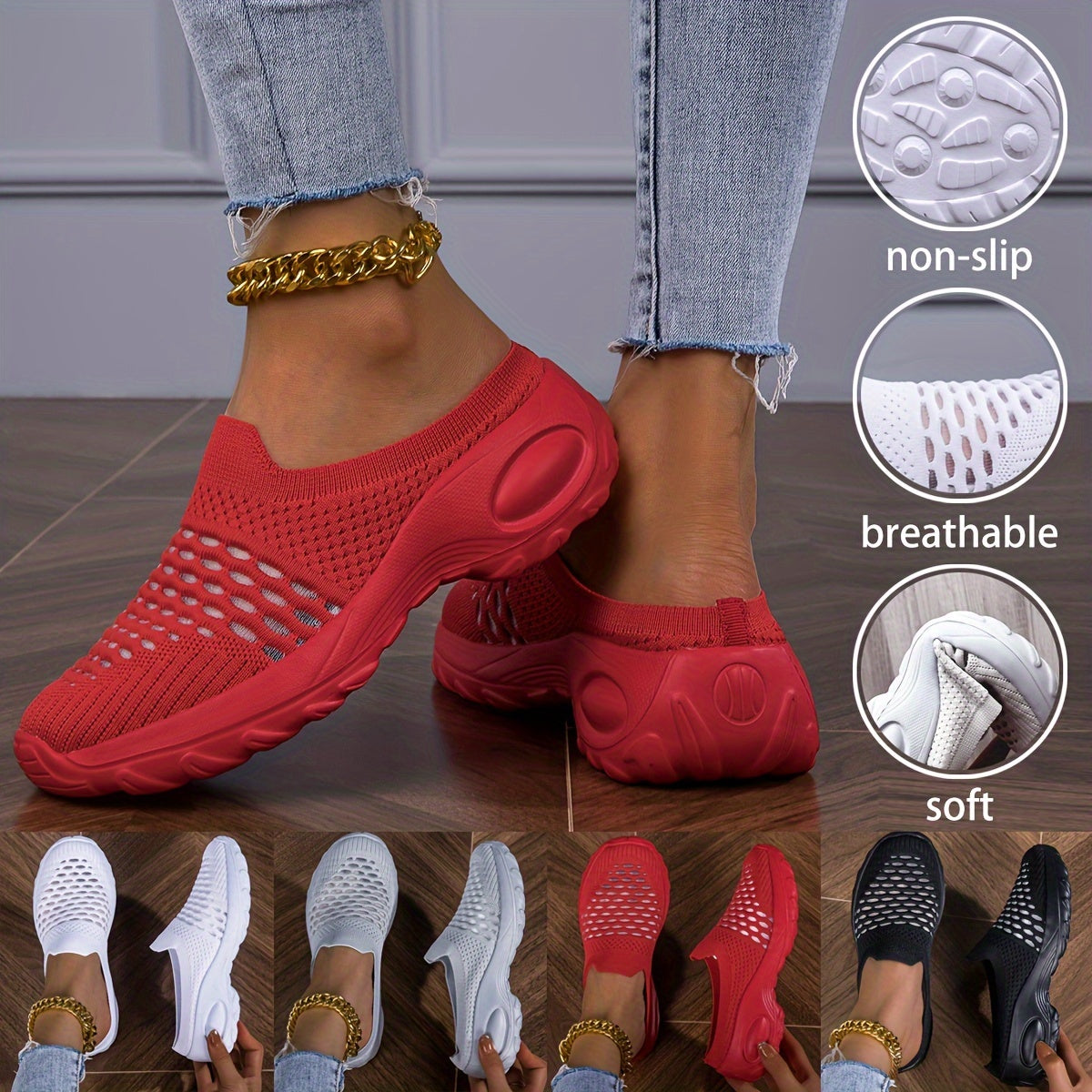 Ayollar uchun nafas oluvchi tikuvli oson kiyinadigan sport poyabzali, yengil, yopishmaydigan EVA, qizil va oq