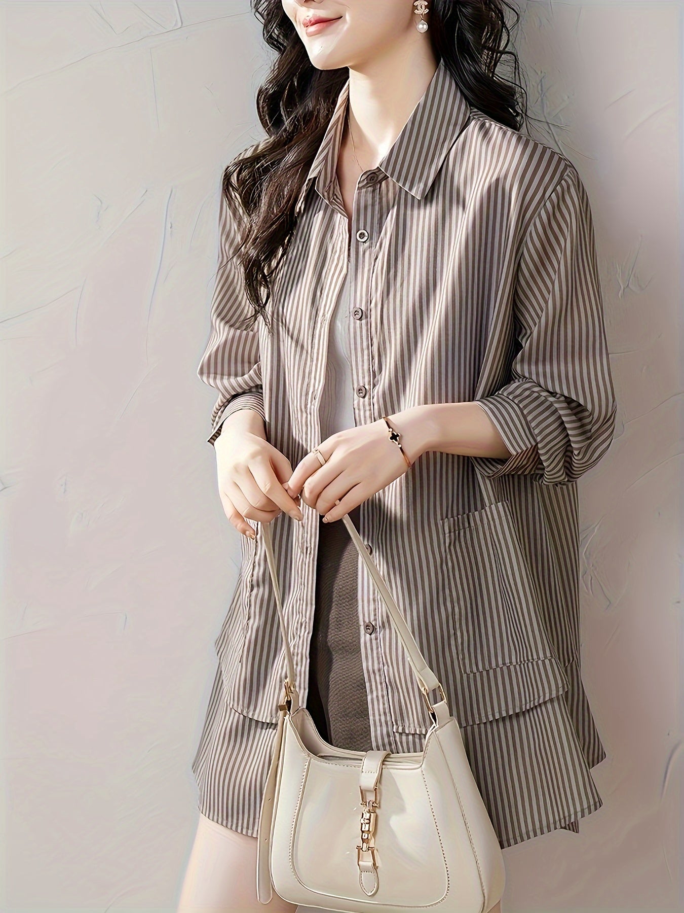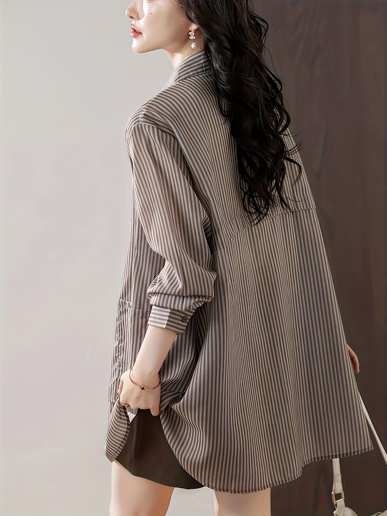 Ayollar uchun jigarrang va oq chiziqli uzun qoʻl qattiq kundalik kofta