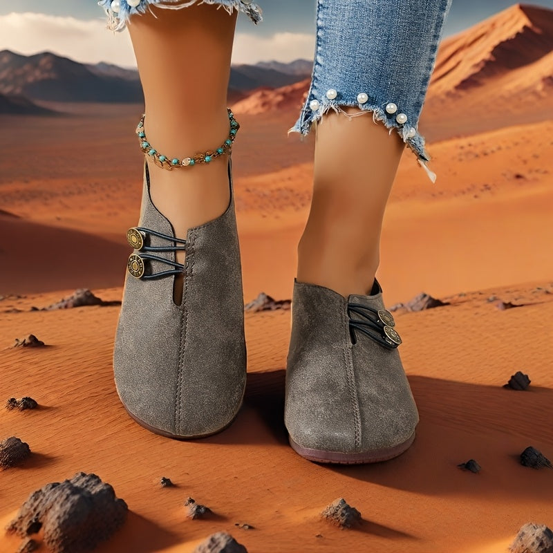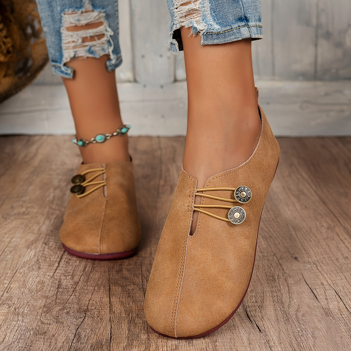 Ayollar uchun tasodifiy bitta poyabzal, yumshoq taglik va dumaloq burchak bilan, tugma bezak va bir xil rangli dizayn bilan.